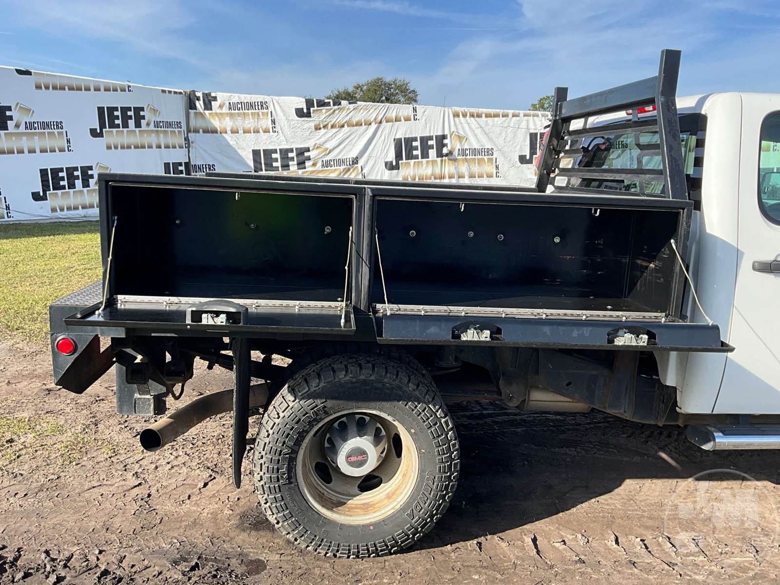 SINGLE AXLE CREW CAB 4X4 FLATBED TRUCK, STEEL BED, DURAMAX, 6.6L , ALLISON, AUTOMATIC, SPRING SUSPENSION, CRUISE CONTROL, 168" " WB, 5360 FRONTS, 9880 REARS, 13K GVWR, STEEL DISC WHEELS, 235/80R17 TIRES, 8' BED, TOOL BOX, GOOSENECK HITCHÂ , ODOMETER READS: 266031