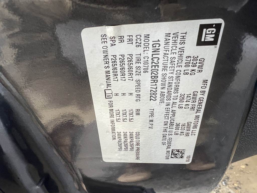 Location: Washougal WA ***City Government Surplus*** VIN: 1GNLC2E02BR172822 Engine: 5.3L 8cyl Gas Transmission: Automatic Running boards, power windows, power mirrors, power locks, 1,700 engine hours, cruise control, A/C, AM/FM/CD, 265/60R17 tires. Miles: 82,344