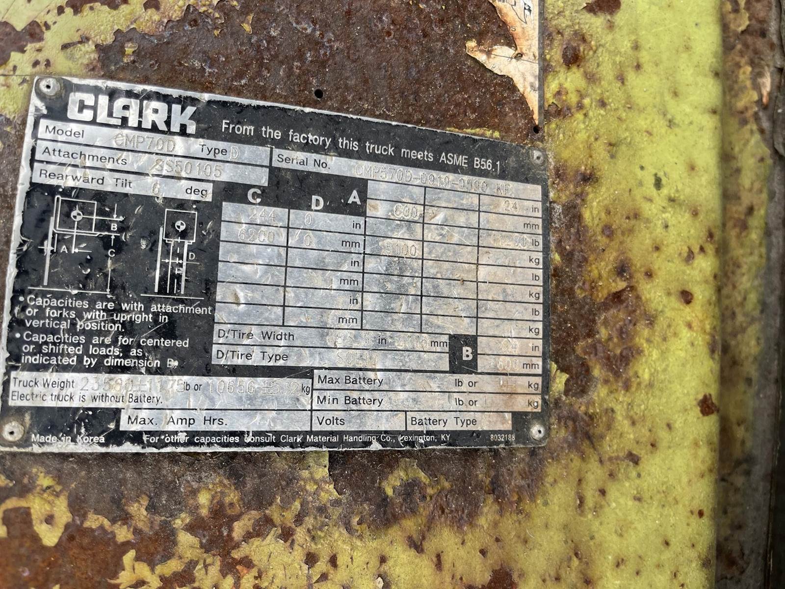 2011 Clark CMP70D Pneumatic Tire Forklift - 20ft Lift Height