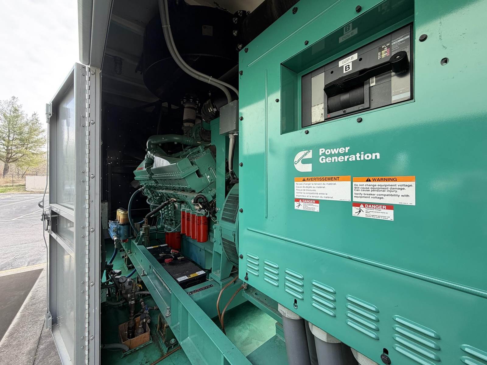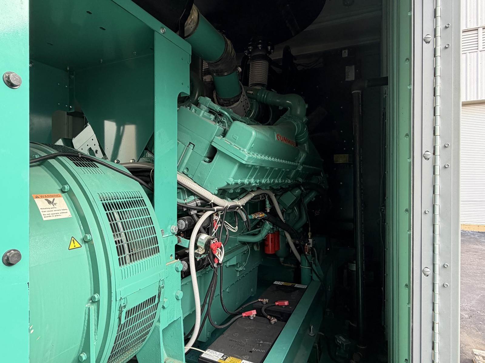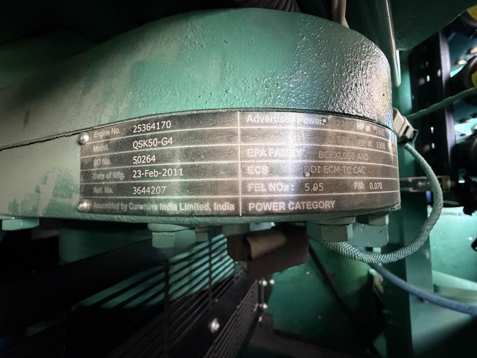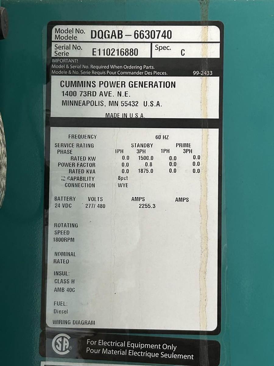 Cummins 1500 kW standby (1350 kW prime) diesel generator set model DQGAB, SN-E110216880. Cummins QSK50-G4 engine rated 2220 HP at 1800 RPM, SN-25364170, EPA Tier 2 emissions. 3/60/277/480V, 12 lead reconnectable to other voltages. 2 x 2000 Amp main-line circuit breakers. PMG - Permanent magnet generator. UL 2200 listed package. Engine cooling high ambient air temperature. PowerCommand 3201 digital control panel. Battery charger. Coolant heater. Weather enclosure. 150 gallon UL listed sub-base fuel tank with secondary containment. 226 Hrs. Year 2011. Load test pending. Overall dimensions 108W x 290L x 146H, 50,000 lbs. FOB Knoxville, TN