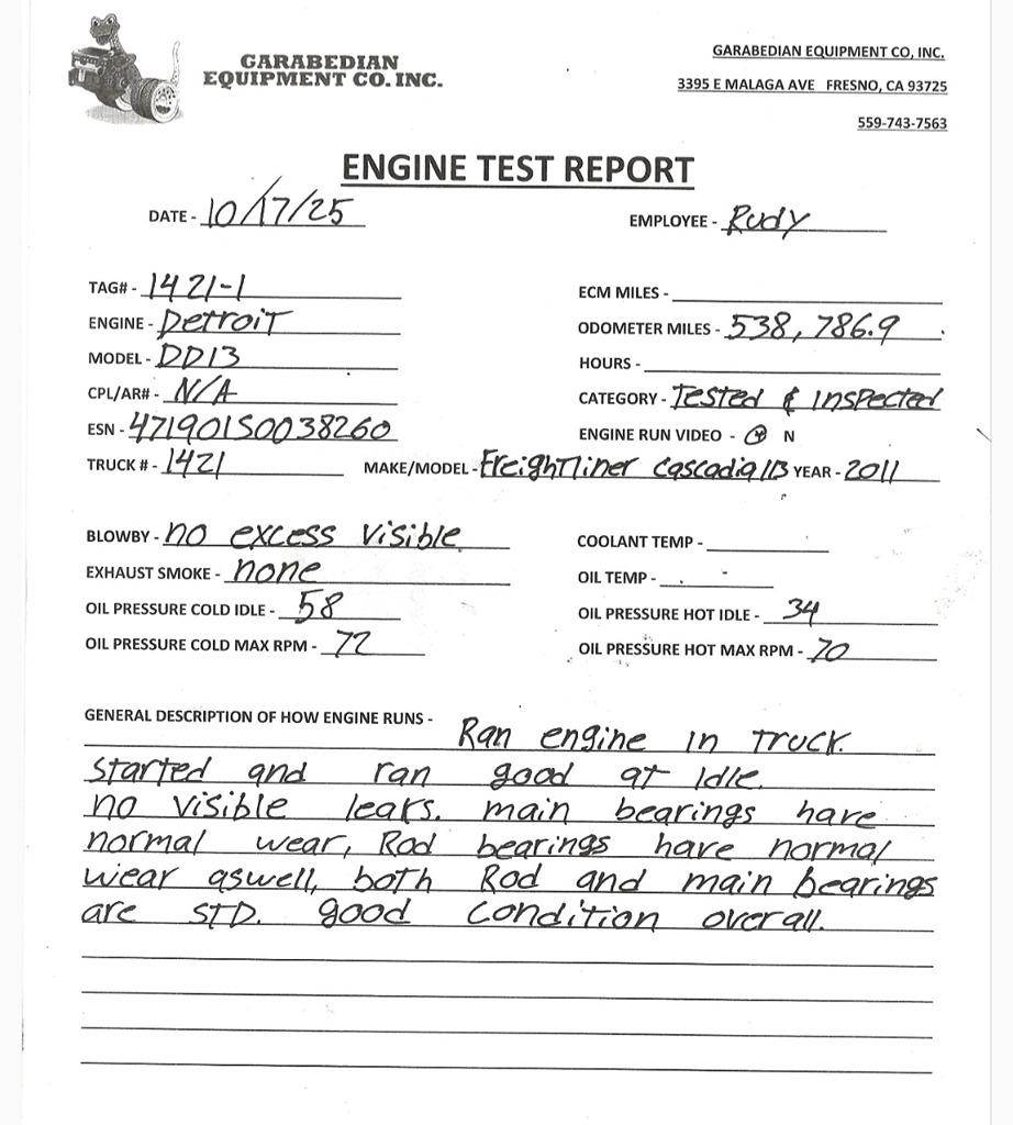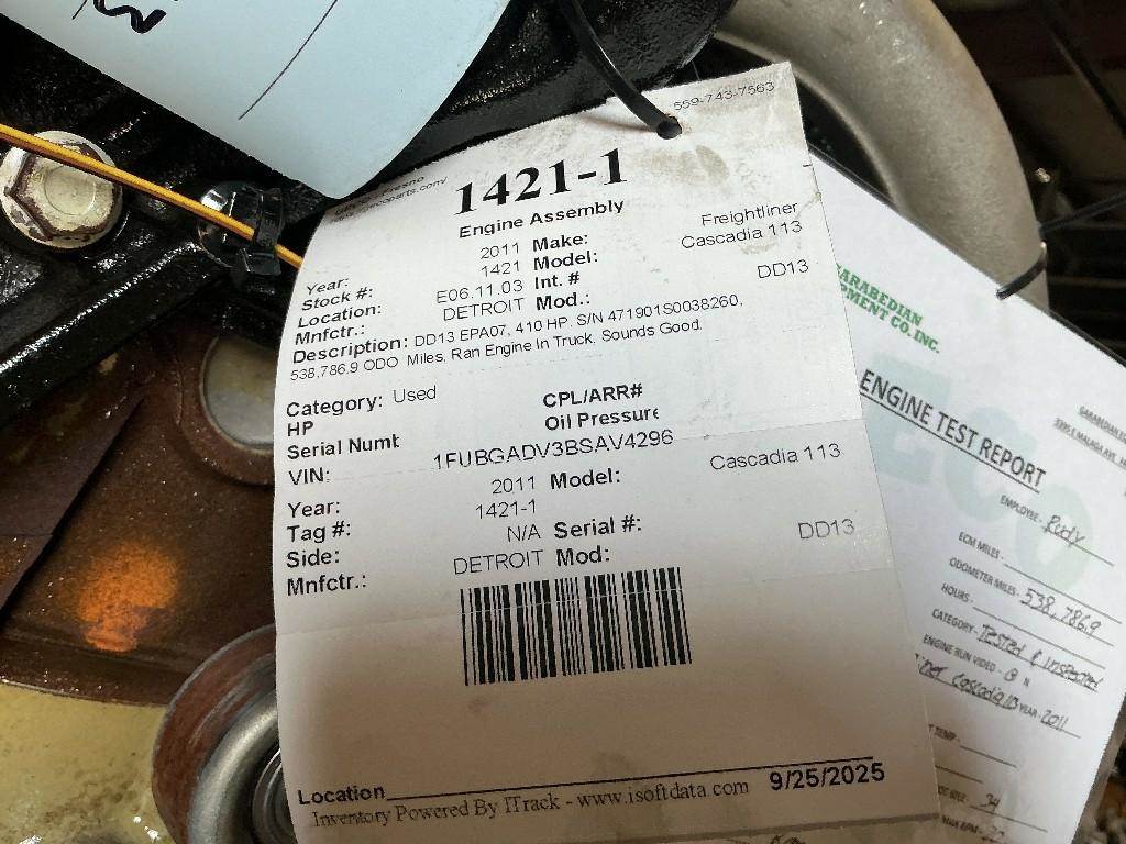 DD13 EPA07, 410 HP. S/N 471901S0038260, 538,786.9 ODO Miles, Ran Engine In Truck, Sounds Good. (Please see video of engine running and test report)