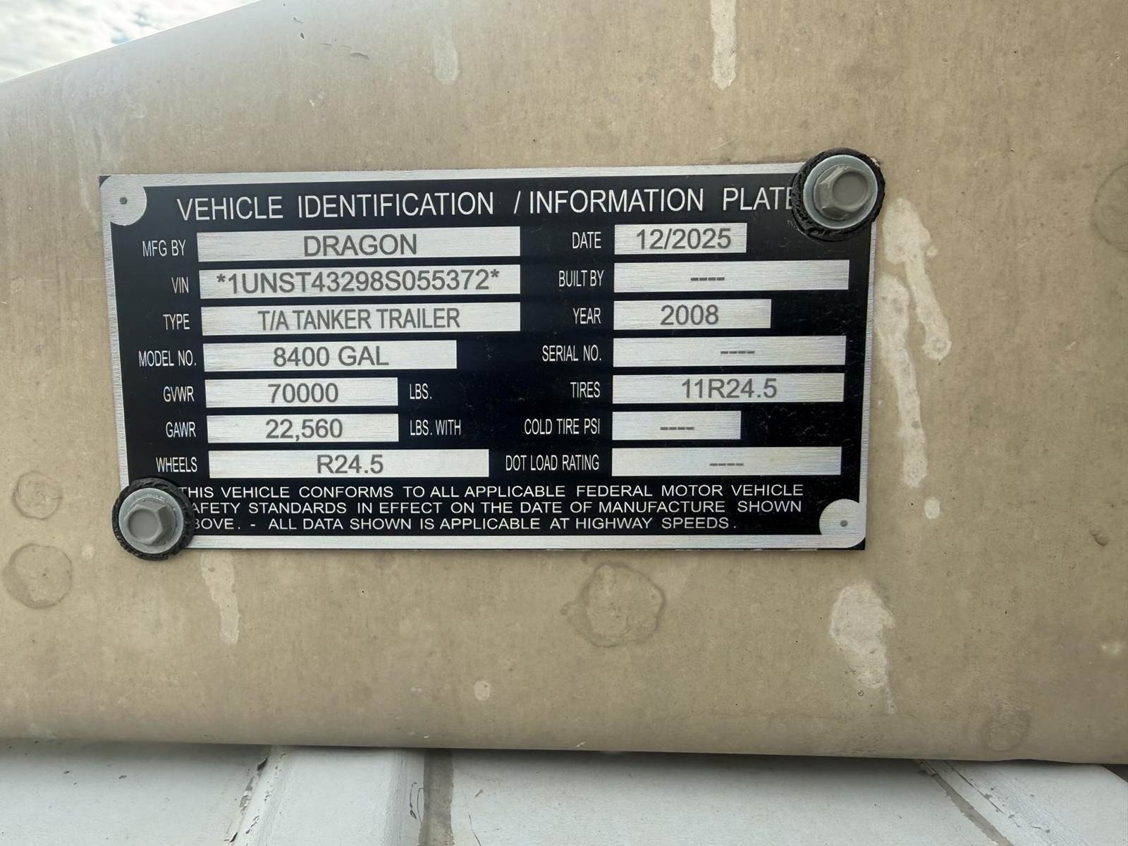 2011 Dragon 8400 GALLON VAC TANK Vacuum Tank Trailer