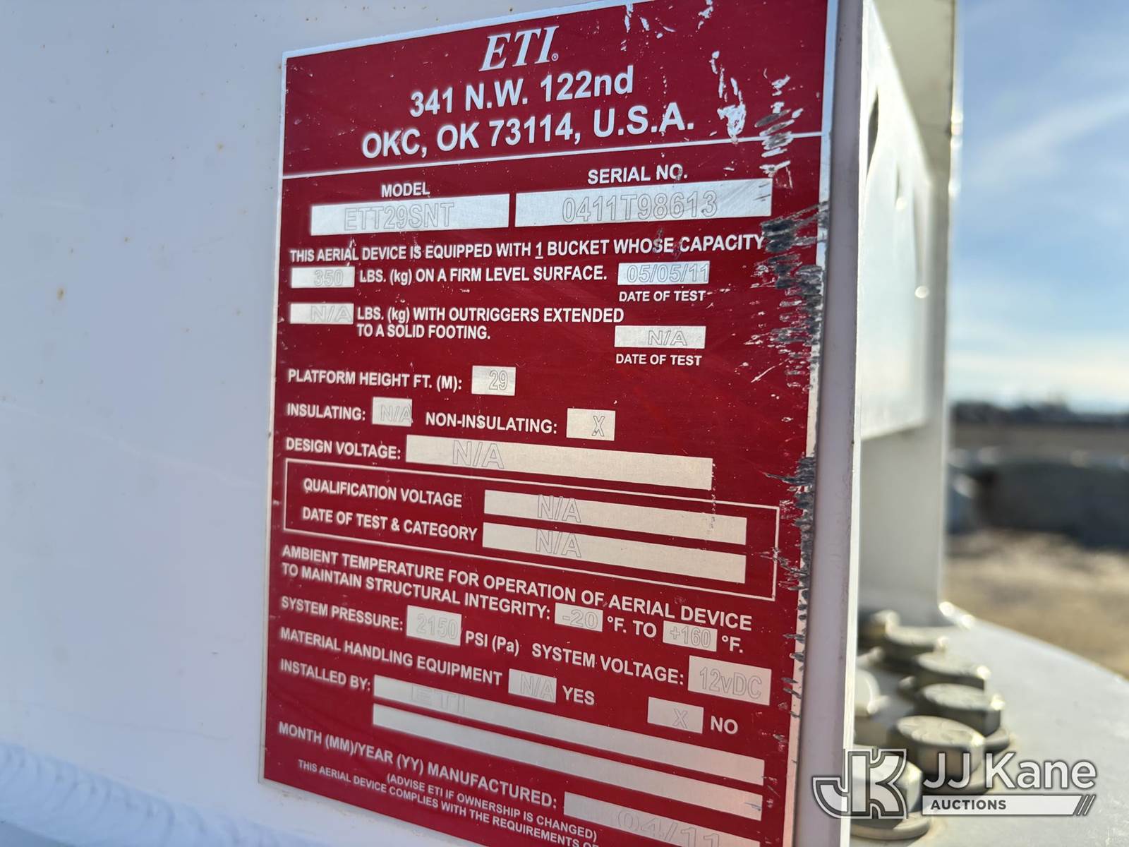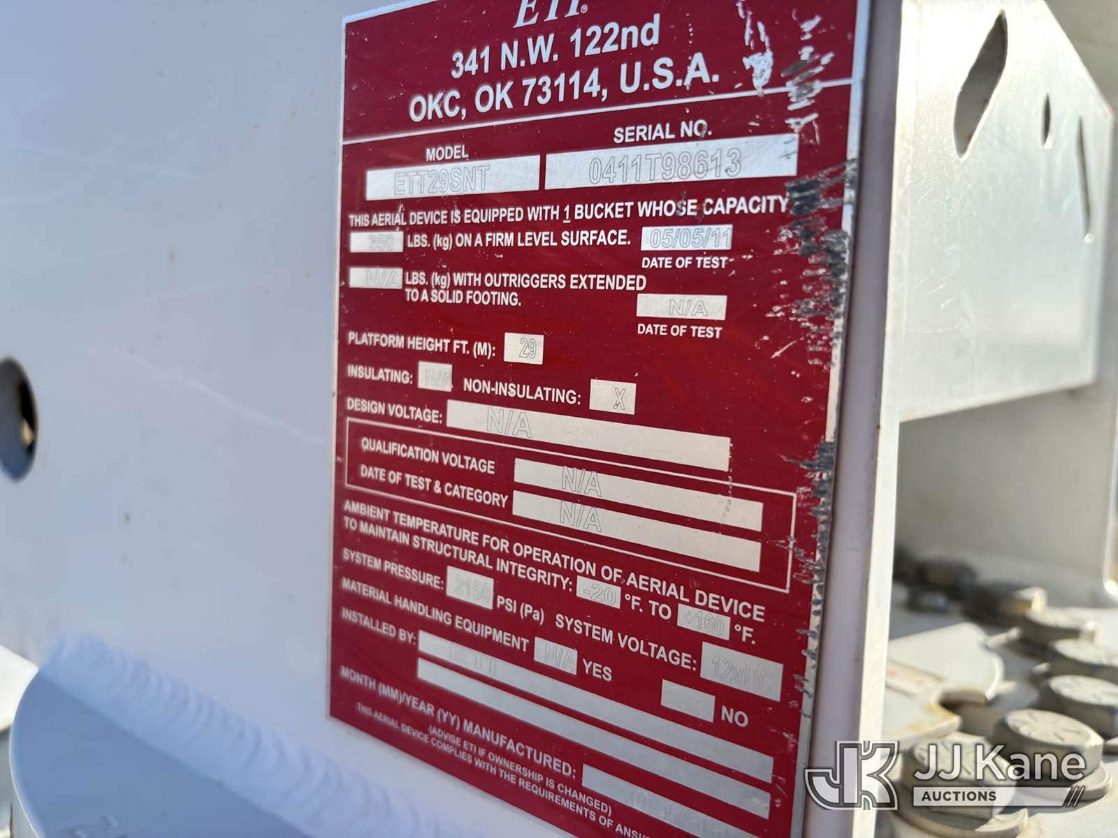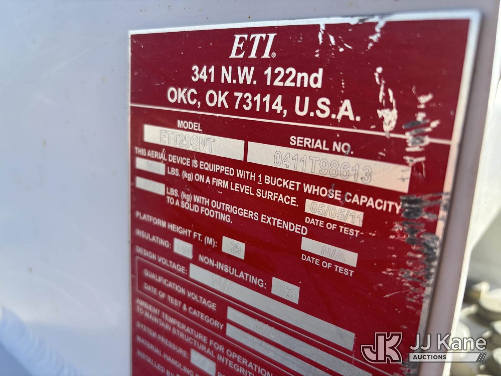 ETI ETT29-SNT, 34 ft, Telescopic Bucket Truck s/n 0411T98613, with single-man bucket, mounted behind cab on 2011 Dodge Ram 4500 Regular Cab 4WD Service Truck, 6.7L L6 OHV 24V TURBO DIESEL Auto, A/C, (140,666 miles) (Runs, Moves & Upper Operates.) This is a Titled Item NOTE: This unit is being sold AS IS/WHERE IS via Timed Auction and is located in Nampa, ID. For Inquires please contact Mike at mike.vantrimpont@jjkane.com or 208-986-2285 (Monday Through Friday 8am to 4pm Mountain Time) (Missing manuals, See Auction Company for Manufacturers Information to obtain manuals) (Buyer is responsible for removal. Assistance by consignor or JJ Kane Auctions is not assured.)