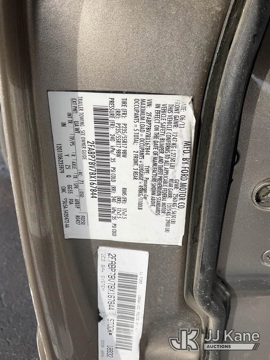 2011 Ford Crown Victoria Police Interceptor 4-Door Sedan, 8-cyl gas, 4-Speed Automatic, A/C, (096,806 miles) (Runs & Moves) (Missing Stereo, Interior Stripped Of Parts) This is a Titled Item NOTE: This unit is being sold AS IS/WHERE IS via Timed Auction and is located in Jurupa Valley, CA. Inspection & preview days for this unit are the 2 business days prior to the first day of items closing for this auction, item is located at 4510 Muth Way Jurupa Valley, CA 92509 and hours of operations are 8a-4p. For pre-sale questions, please contact please contact Office Staff @ (310) 353-7140. Dealer License Number 45696. (Buyer is responsible for removal. Assistance by consignor or JJ Kane Auctions is not assured.)