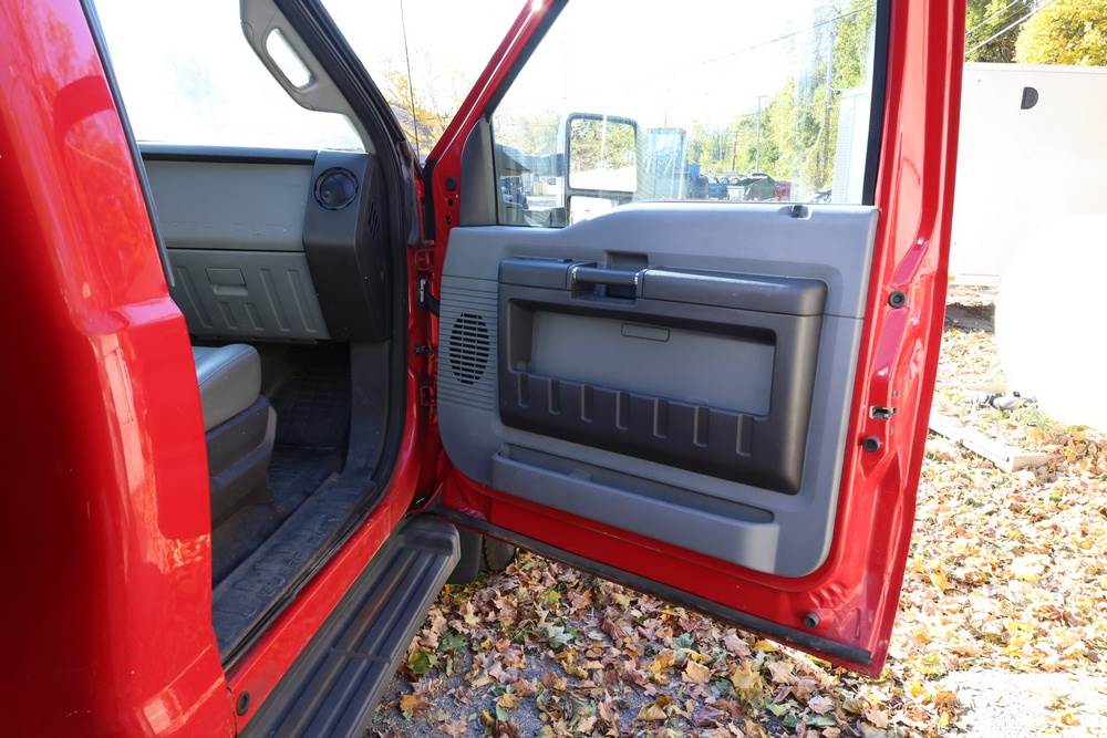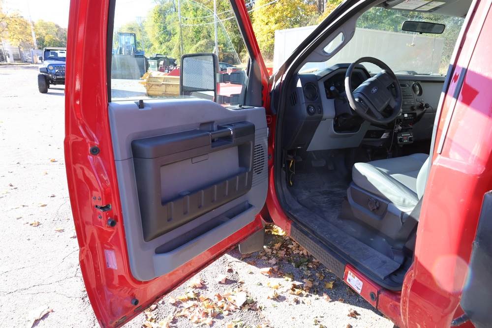 2011 Ford F-550 XL Super Duty dump truck with automatic transmission. VIN: 1FDUF5HT3BEA85817. Odometer reading: 41,788 miles. Exterior: Red cab with black dump body, dual rear wheels, front tow hooks, steel wheels, and amber roof light. Interior: Gray vinyl seat, black and gray dash trim, manual climate controls, factory radio, auxiliary switch panel, PTO and plow control levers, and column shifter. Tire configuration: Dual rear wheels with 225/70R19.5G tires. Additional equipment includes dump bed, PTO system (non-functional per seller), Certified Clean Idle engine badge, and side mirrors with integrated spot mirrors. Title and key available. Seller reports: Runs and drives.