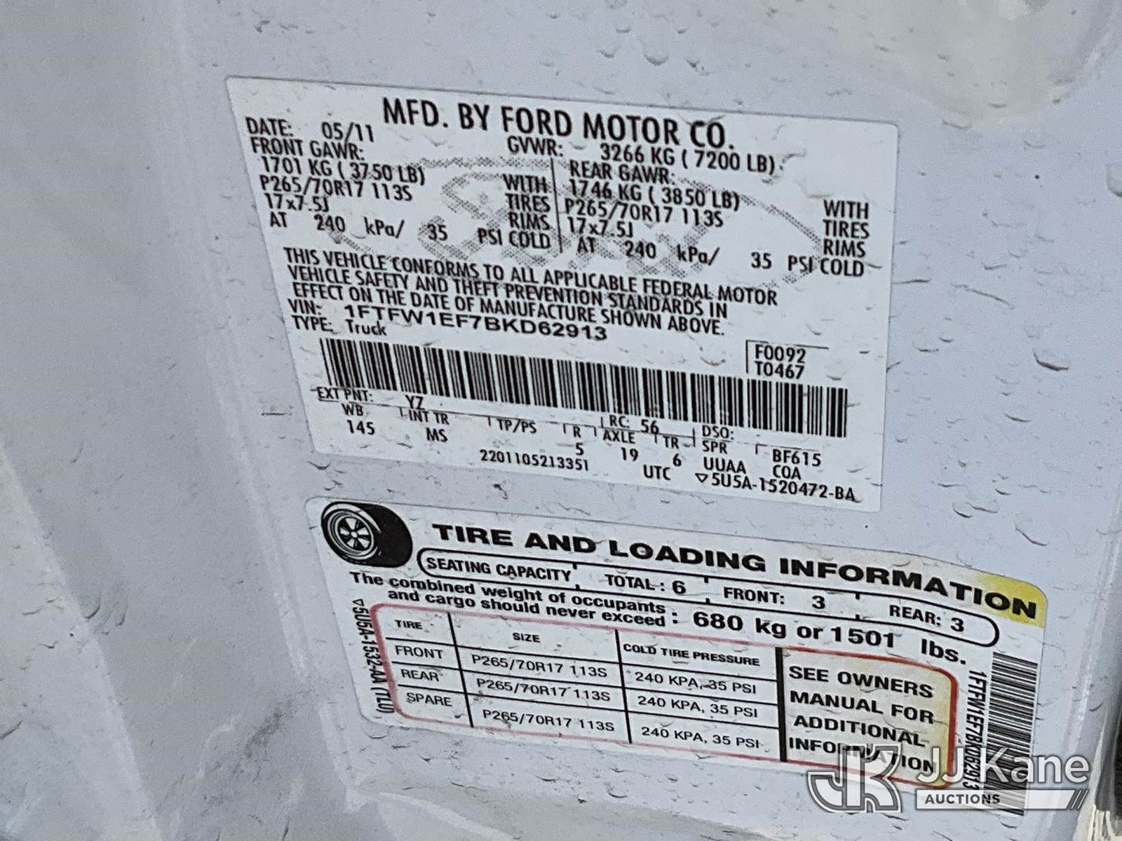 2011 Ford F150 4x4 Crew-Cab Pickup Truck, 8-cyl gas, Auto, A/C, with bed cover, (111,684 miles) (Runs & Moves) (Paint Damage) This is a Titled Item NOTE: This unit is being sold AS IS/WHERE IS via Timed Auction and is located in Salt Lake City, UT. Inspection & preview days for this unit are the 2 business days prior to the first day of items closing for this auction, item is located at 2353 N Redwood Rd Salt Lake City, UT 84116 and hours of operations are 8a-4p. Titles executed exactly as bidder registered. Ensure your name and/or business name and address in JJ Kane and/or ProxiBid is correct before bidding. For pre-sale questions, please contact Office Staff @ (801) 519-0123. (Buyer is responsible for removal. Assistance by consignor or JJ Kane Auctions is not assured.)