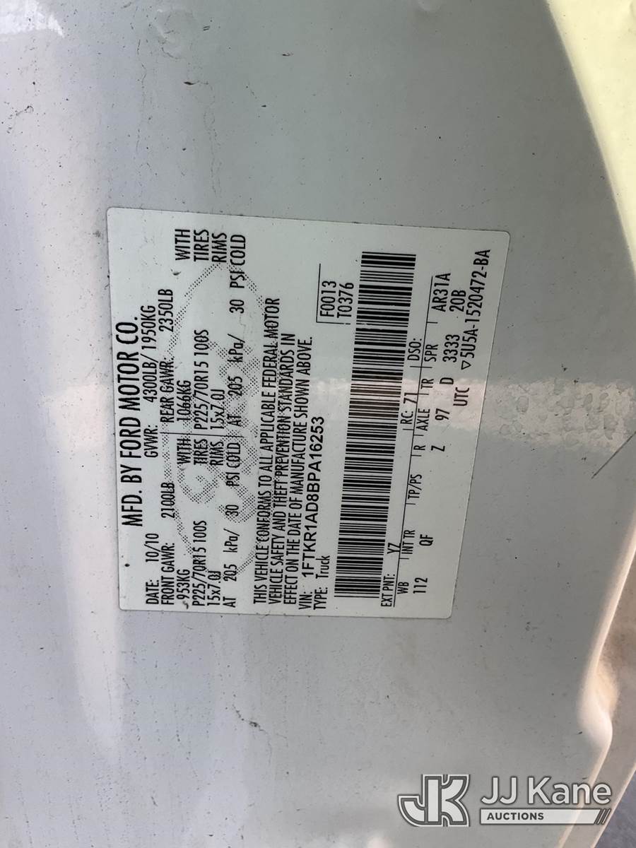 2011 Ford Ranger Pickup Truck, s/n 1FTKR1AD8BPA16253, 4-cyl gas, 5-Speed Automatic, A/C, with Tow package, (71,666 miles) (Runs & Moves) This is a Titled Item NOTE: This unit is being sold AS IS/WHERE IS via Timed Auction and is located in Jurupa Valley, CA. Inspection & preview days for this unit are the 2 business days prior to the first day of items closing for this auction, item is located at 4510 Muth Way Jurupa Valley, CA 92509 and hours of operations are 8a-4p. For pre-sale questions, please contact please contact Office Staff @ (310) 353-7140. Dealer License Number 45696. (Buyer is responsible for removal. Assistance by consignor or JJ Kane Auctioneers is not assured.)