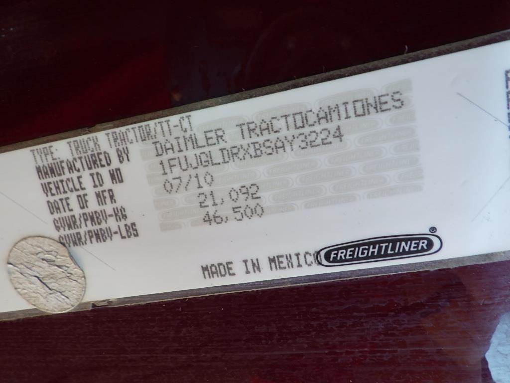VIN: 1FUJGLDRXBSAY3224 6-Cyl Turbo Diesel, Automatic, Air Brakes, Air Ride Cab/Seat, Air Bag Suspension,5th Wheel Plate, Glad Hands, 5th Wheel Slide, A/C, Heat, AM/FM/CD, Power Windows/Mirrors, Heated Mirrors, Dual Fuel Tanks, 68" Sleeper, Single Bed, Engine Brake, 295/75R22.5, 445/50R22.5 Tires, GVWR 46,500lbs, Odometer Reading: 616,255
