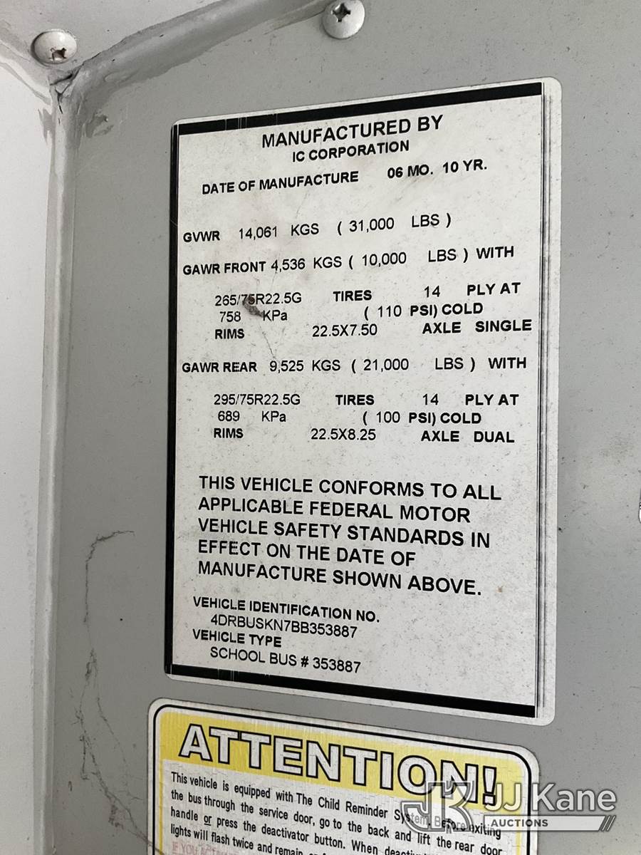 2011 International CE School Bus, 6.4L diesel Auto, DIESEL, A/C, (151,913 miles) (Runs & Moves) This is a Titled Item NOTE: This unit is being sold AS IS/WHERE IS via Timed Auction and is located in Ocala, FL. Inspection & preview days for this unit are by appointment only; please contact us at contact@jjkane.com or 84-Go-JJKane for more details. For more information & removal arrangements please contact Mike Lessard @ (352) 629-6677. (Buyer is responsible for removal. Assistance by consignor or JJ Kane Auctioneers is not assured.)