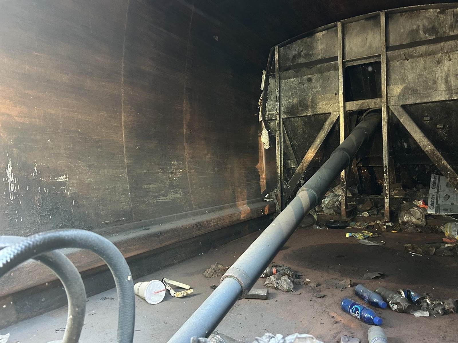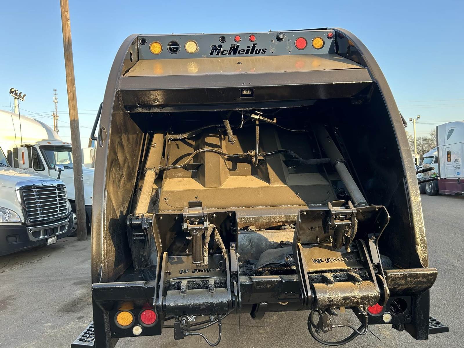 RUNS AND OPERATES, McNELIUS REAR LOAD BODY, DOUBLE FRAME, CART TIPPER, DIFFERENTIAL LOCK!,