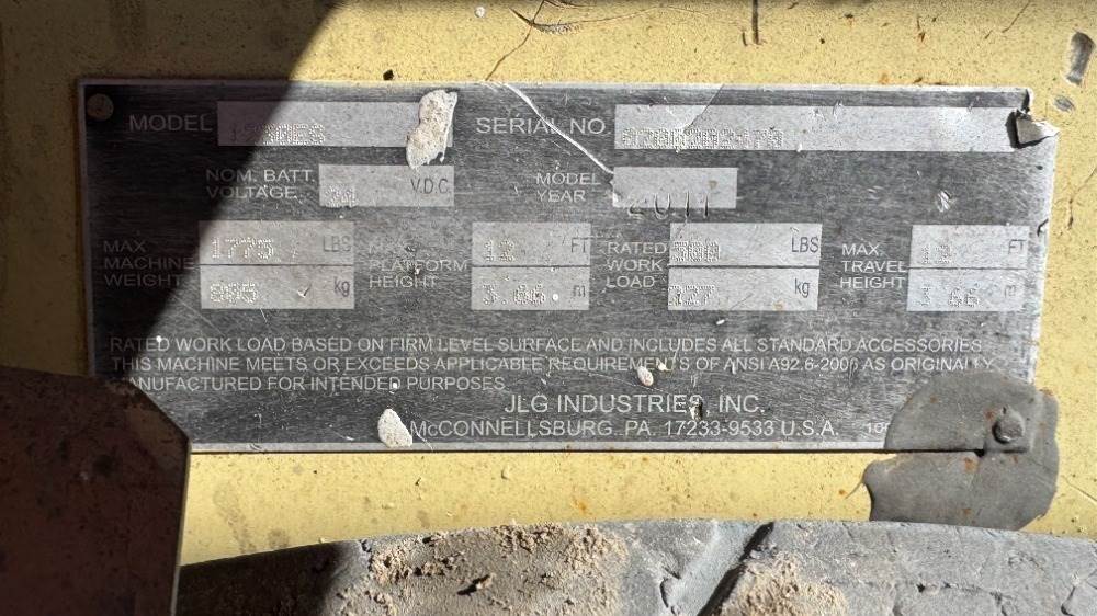 2011 JLG 1230ES PERSONNEL LIFT, electric, 12' lift, 434 hours indicated. s/n:0200202470