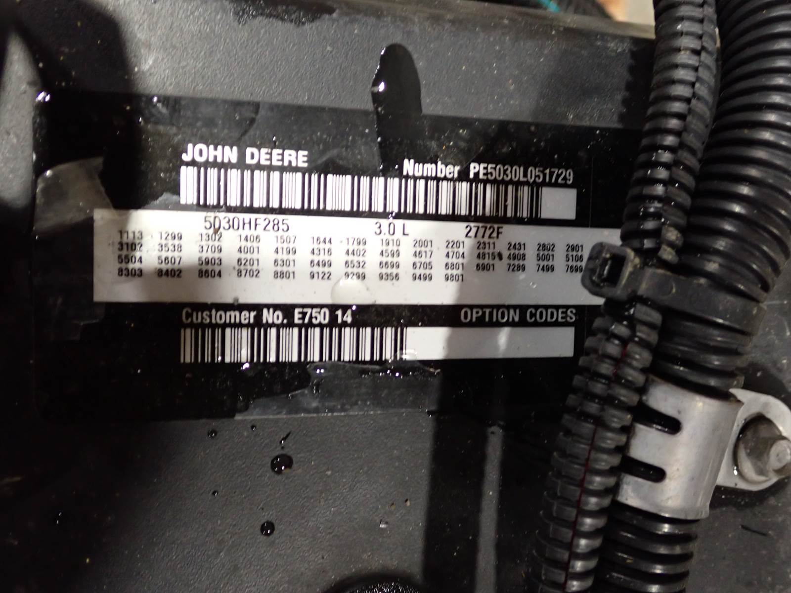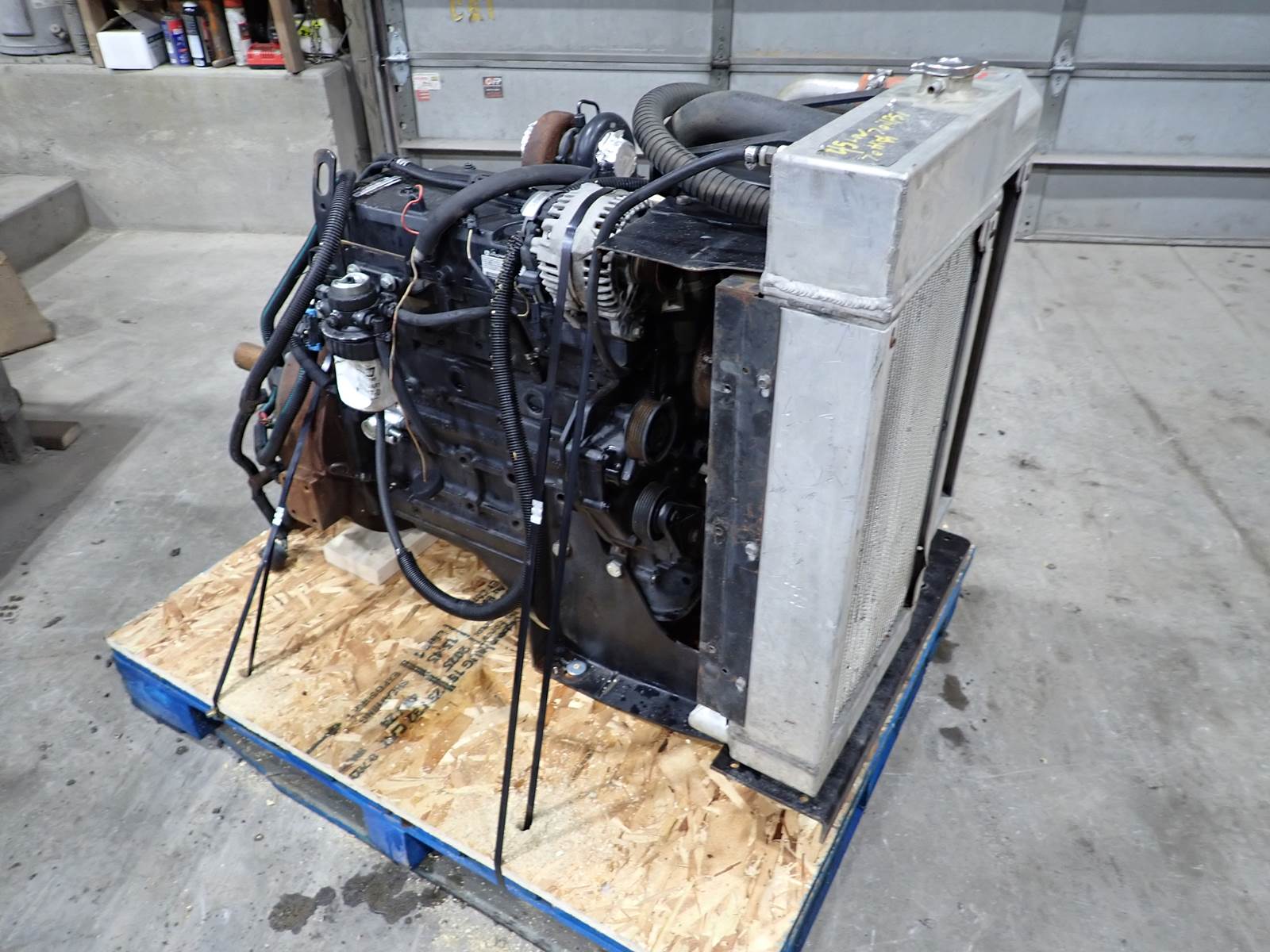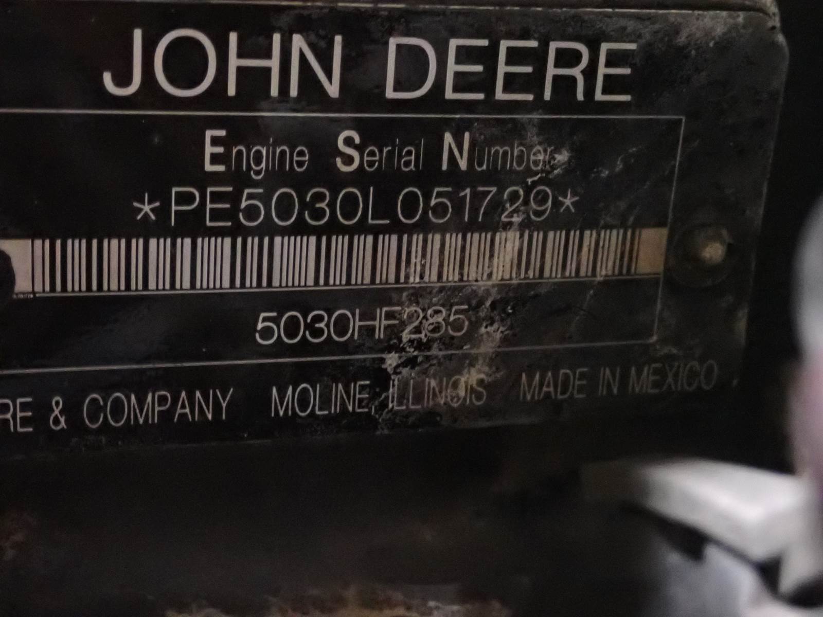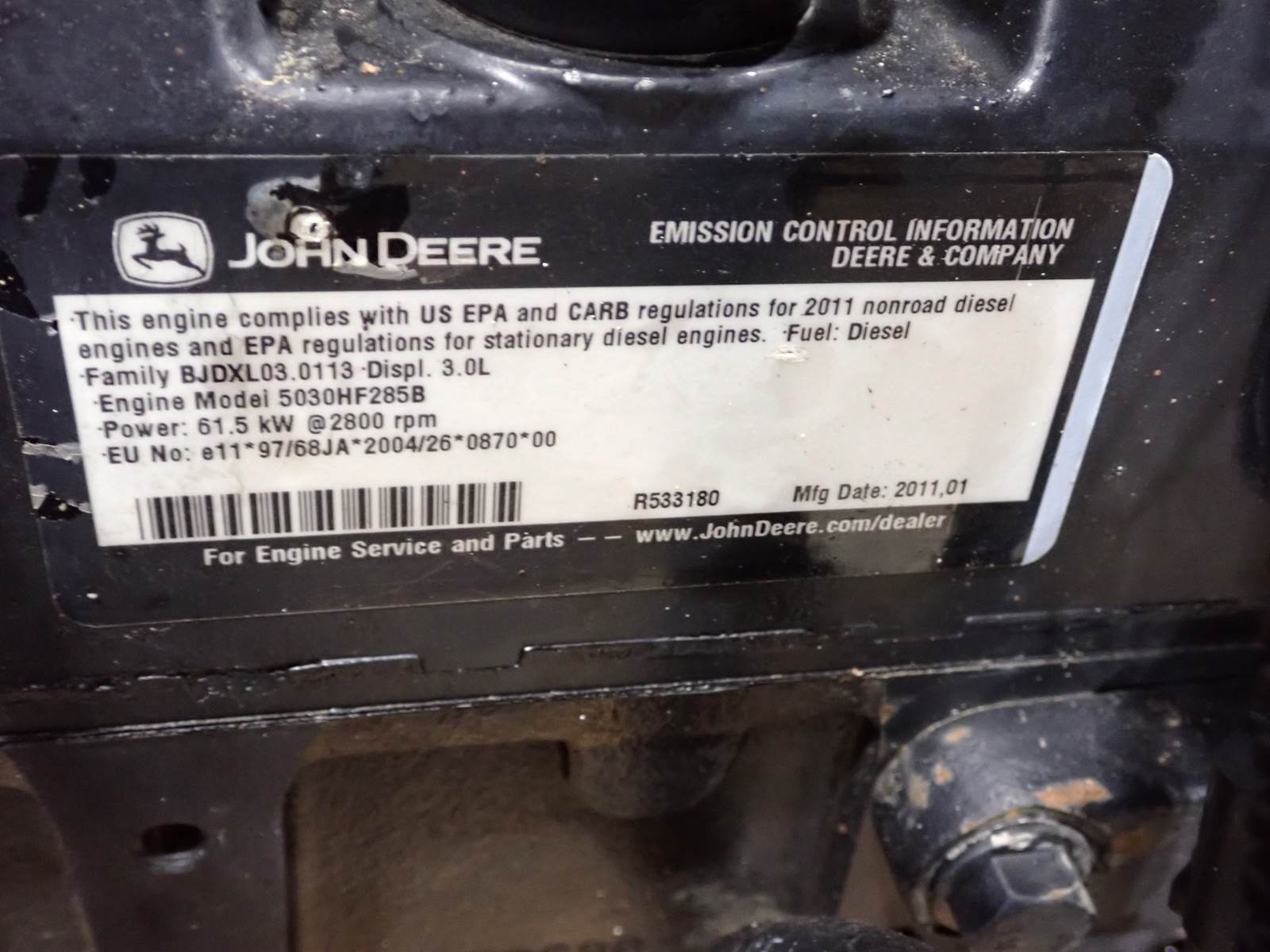 2011 John Deere 5030HF285 diesel engine, turbocharged, air to air intercooled, 82 HP at 2800 RPM rating, electronic fuel system, power unit w/ cooling package, power take off clutch & accessories as pictured, showing 2800 hours when removed from a stationary application. ENGINE RUNS STRONG, SEE VIDEO, GOOD RUNNING UNIT W/ NO SMOKE OR BLOWBY OBSERVED DURING COLD TEST RUN. 50 PSI OIL PRESSURE AT IDLE, 70 PSI AT MID THROTTLE DURING COLD TEST RUN. ENGINE WILL REPLACE SKIDSTEER & EQUIPMENT ENGINES IN CERTAIN APPLICATIONS, CONTACT US FOR HELP W/ INTERCHANGE COMPLETE POWER UNIT HERE W/ ACCESSORIES AS PICTURED -- GET IT COMING !!