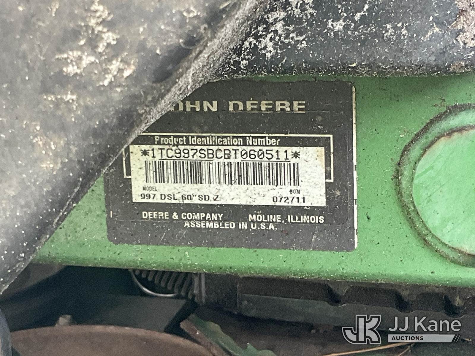 2011 John Deere 997DSL Commercial Zero Turn Riding Mower, s/n 1TC997SBCBT060511, diesel, with 60in deck, (Runs, Moves, Operates) (Hour Meter Illegible) NOTE: This unit is being sold AS IS/WHERE IS via Timed Auction and is located in Thonotosassa, FL. Inspection & preview days for this unit are the 2 business days prior to the first day of items closing for this auction, item is located at 11720 N US 301 Thonotosassa, Fl 33592 and hours of operations are 8a-4p. For pre-sale questions, please contact Office Staff @ (813) 986-2485. (Buyer is responsible for removal. Assistance by consignor or JJ Kane Auctions is not assured.)