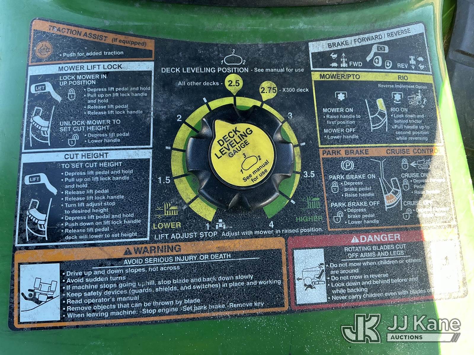 2011 John Deere Lawn Tractor, s/n 1M0X300CCBM201440, Gas, Hillsborough County BOCC Unit (Runs, Moves & Operates) (Needs Gas) (Reads 350 hours) NOTE: This unit is being sold AS IS/WHERE IS via Timed Auction and is located in Thonotosassa, FL. Inspection & preview days for this unit are the 2 business days prior to the first day of items closing for this auction, item is located at 11720 N US 301 Thonotosassa, Fl 33592 and hours of operations are 8a-4p. For pre-sale questions, please contact Office Staff @ (813) 986-2485. (Buyer is responsible for removal. Assistance by consignor or JJ Kane Auctioneers is not assured.)