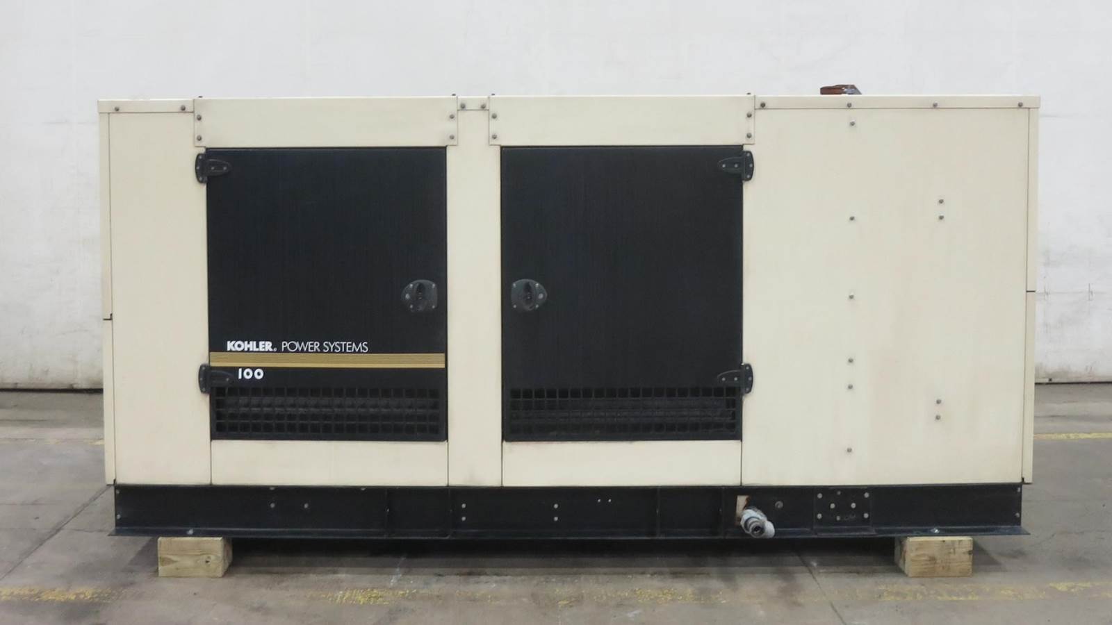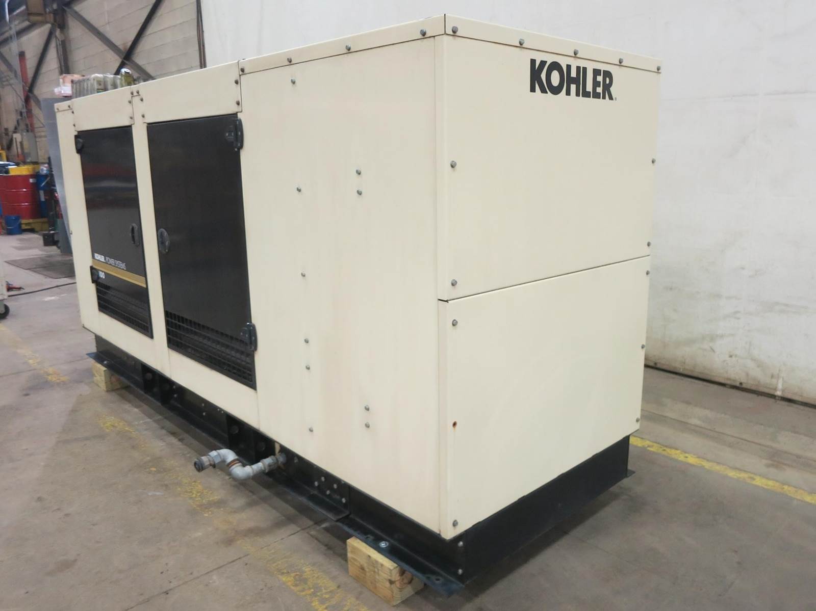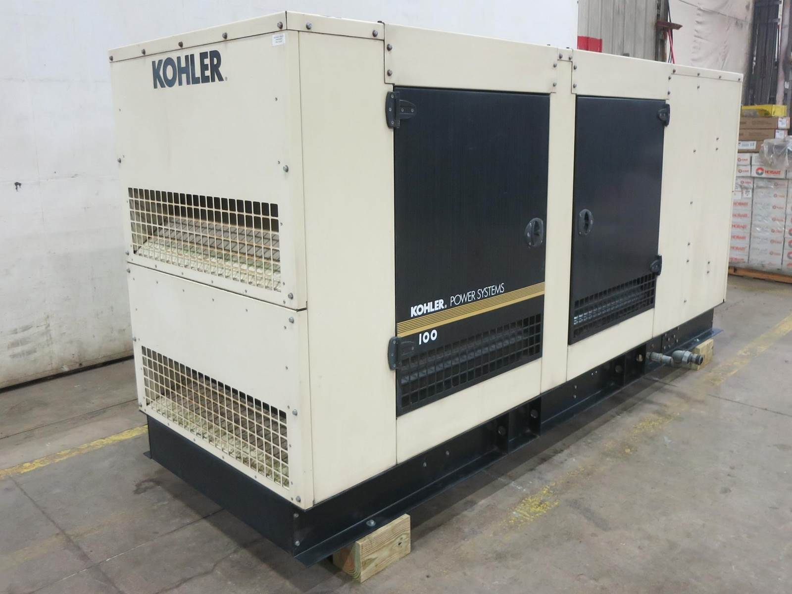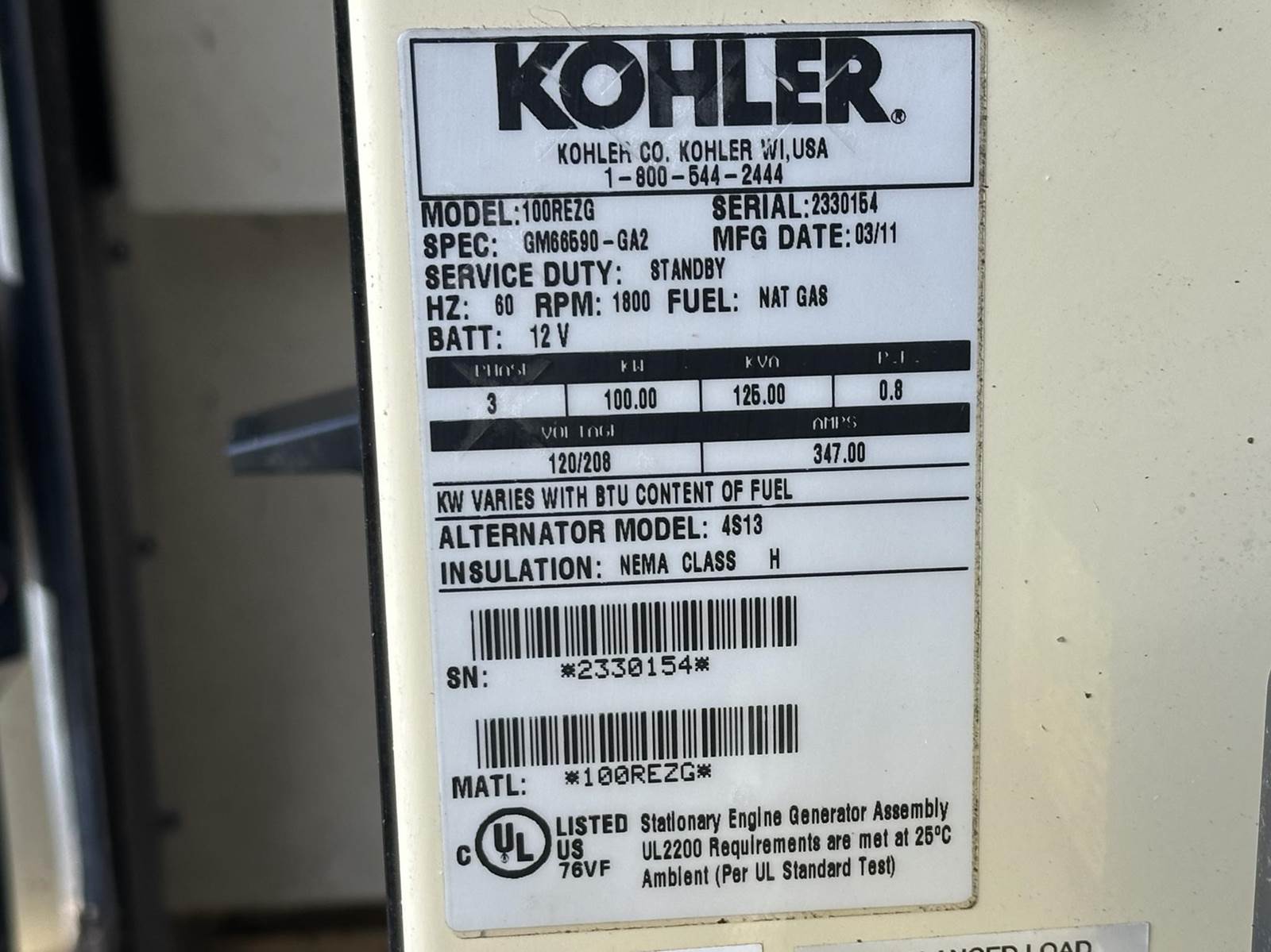 Kohler 100 kW standby (90 kW prime) natural gas / propane generator set model 100REZG, SN-2330194. GM 8.1L engine rated 195 HP at 1800 RPM, EPA certified, SN-8P1L23343. 3/60/120/208V, 12 lead reconnectable to other voltages. 400 Amp main-line circuit breaker. PMG permanent magnet generator. UL 2200 Listed stationary generator assembly. Engine cooling radiator rated 50C/122F ambient. Decision-Maker 550 control panel. Battery charger. Coolant heater. Sound attenuated enclosure. 349 Hrs. Year 2011. Load test pending. Overall dimensions 45W x 138L x 75H on 6H blocks, 4000 lbs. . FOB Waukesha, WI