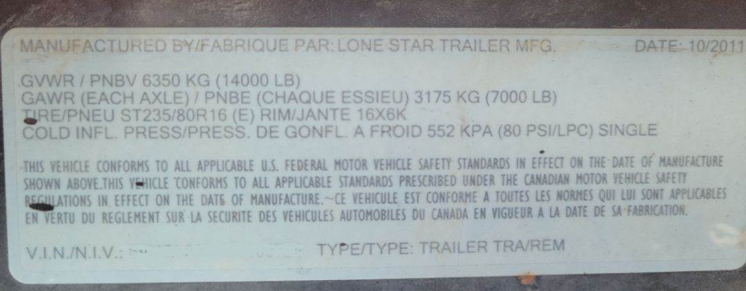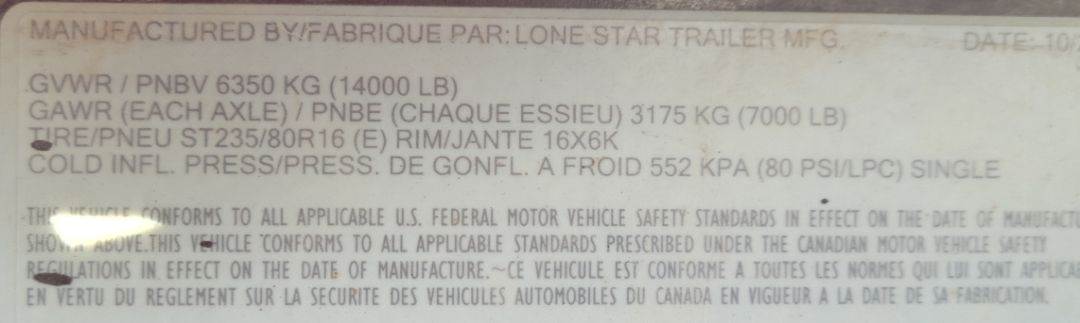 2011 LONESTAR GOOSE NECK EQUIPMENT TRAILER. TYPE: TL UT2. FULL LENGTH: 32', GVWR: 14000 LBS. GAWR: (EACH AXLE) 7000 LBS. TYPE: TRAILER TRA / REM, TIRE: ST 235 / 80R16, TIRE RIM: 16 X 6K. 80 PSI. CWT: 33. TRUCK WEIGHT: 3300 LBS.WELL LENGTH: 22' 1", FROM CENTER OF NECK TO THE GROUND: 6', FROM THE TIP OF NECK TO THE GROUND: 3' 9". FROM THE TIP OF THE NECK TO THE BEGINNING OF THE WELL: 8' 1", SIDE: 2' ABOVE GROUND.REAR IS 1' ABOVE GROUND.