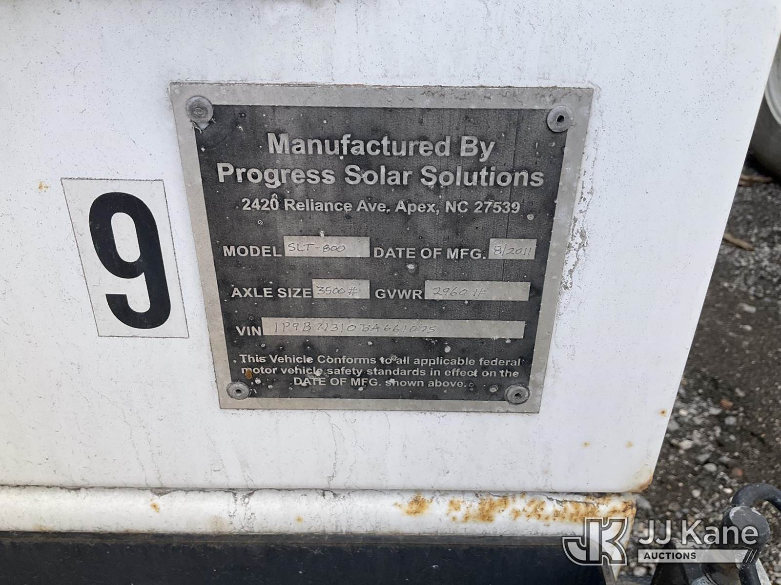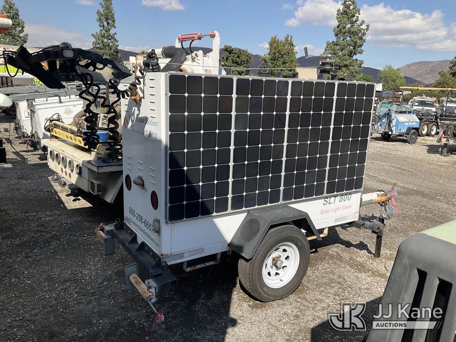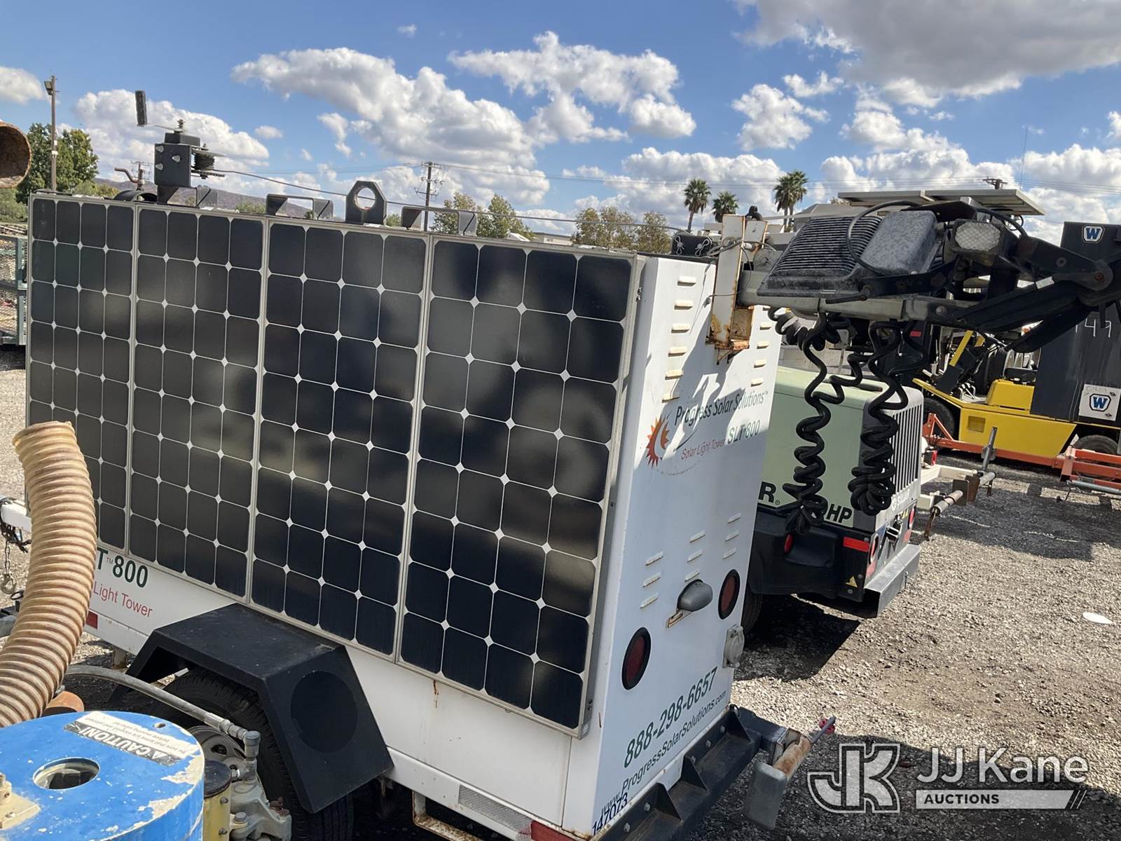 2011 Progress Solar Solutions SLT800 Portable Light Tower, s/n 1P9B71310BA661075, Solar/Battery Powered, electric, with ball hitch, solar panels, (Starts & Operates) NOTE: This unit is being sold AS IS/WHERE IS via Timed Auction and is located in Jurupa Valley, CA. Inspection & preview days for this unit are the 2 business days prior to the first day of items closing for this auction, item is located at 4510 Muth Way Jurupa Valley, CA 92509 and hours of operations are 8a-4p. For pre-sale questions, please contact please contact Office Staff @ (310) 353-7140. Dealer License Number 45696. (Buyer is responsible for removal. Assistance by consignor or JJ Kane Auctioneers is not assured.)