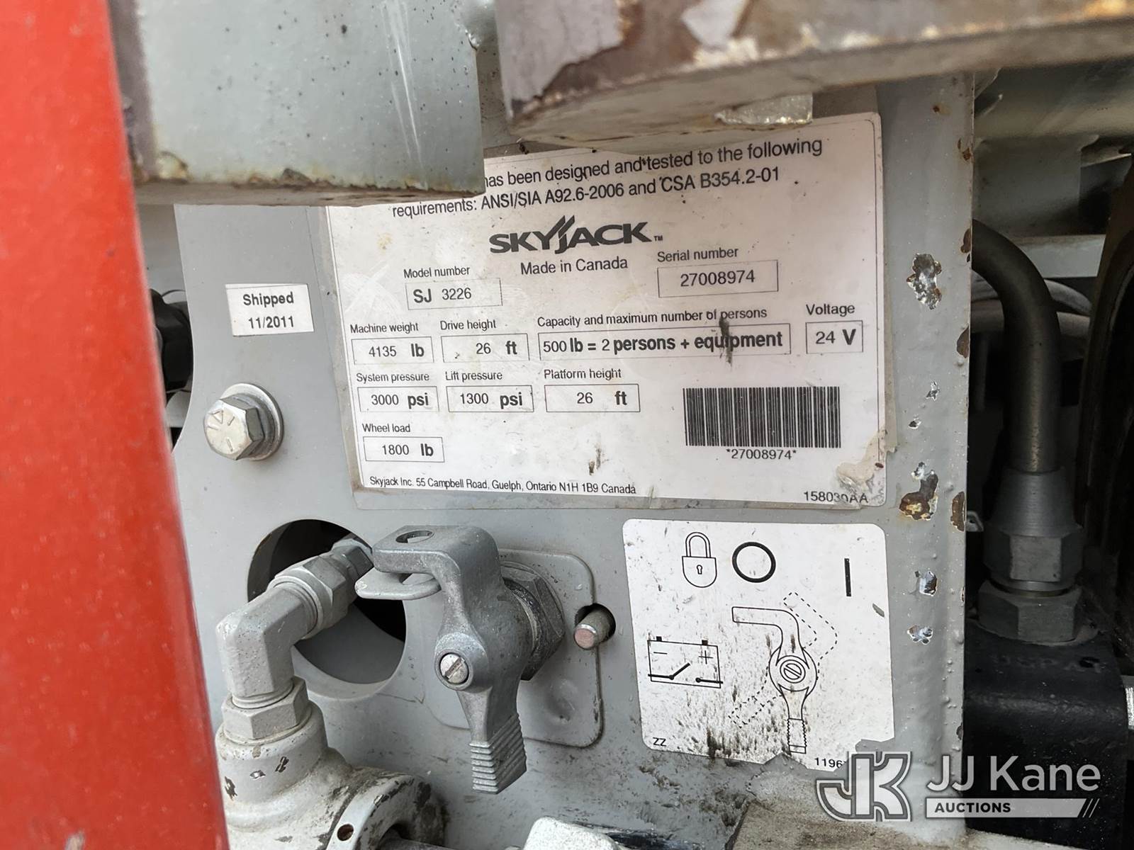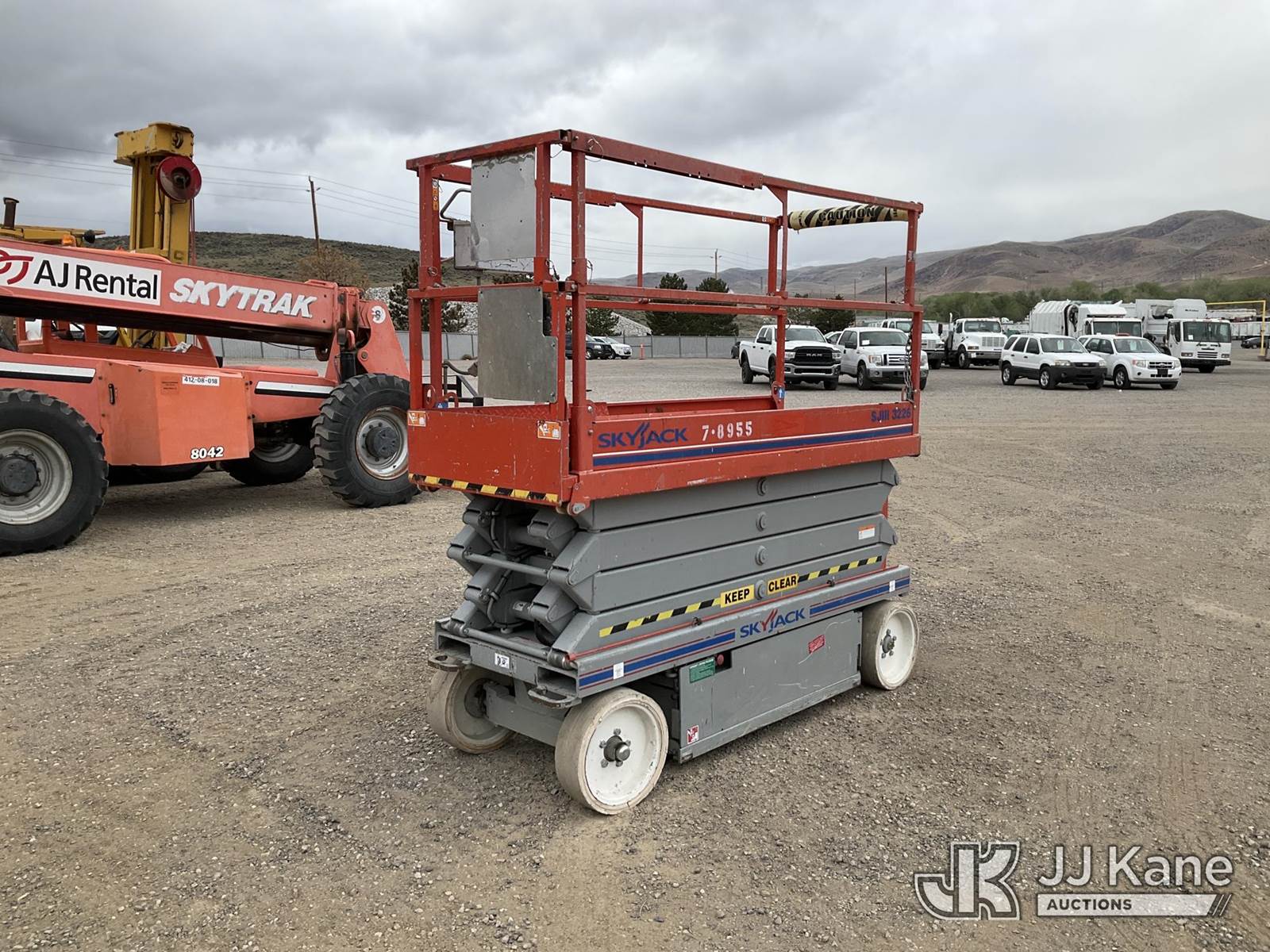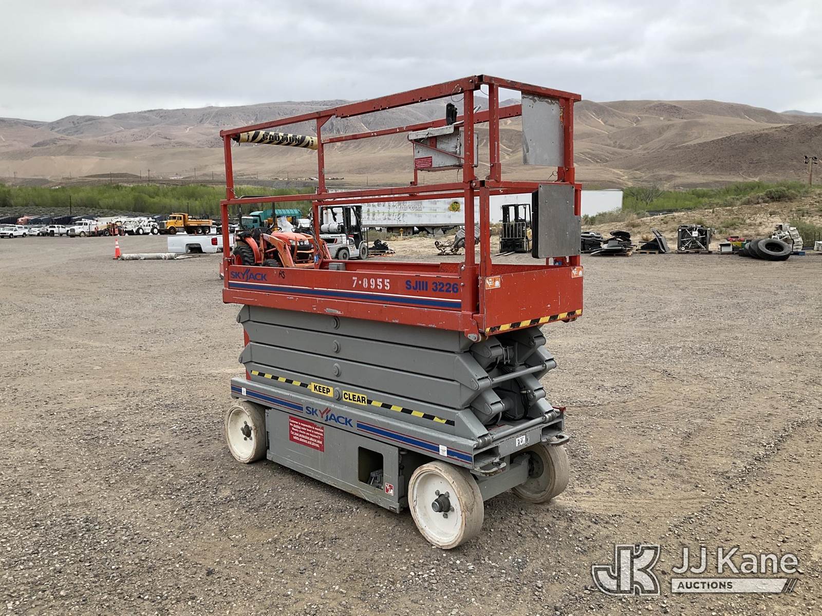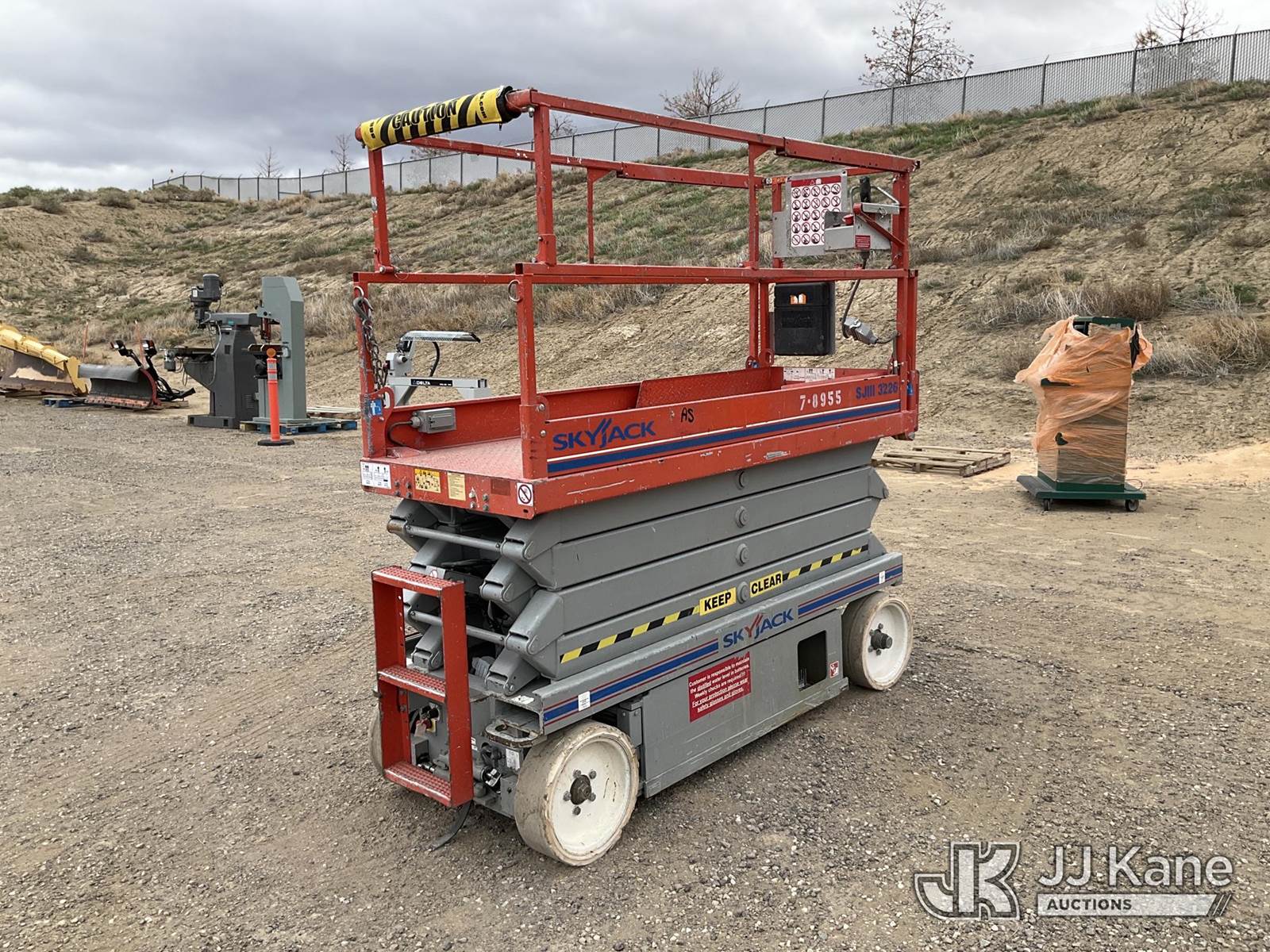 2011 SkyJack SJ3226 Scissor Lift, s/n 27008974, Electric Electric, Hydrostatic, Key Specifications: Working Height: 31.99 ft / 9.75 m, Platform Height (Raised): 25.99 ft / 7.9 m, Overall Width: 32 in / 0.81 m, Overall Length: 91.5 in / 2.32 m, Platform Capacity: 500lbs, Weight: ~3,510–4,190 lbs / 1,592–1,900 kg, Stowed Height (Rails Up): ~77–90 in / 1.95–2.28 m, Stowed Height (Rails Down): ~63–76 in / 1.6–1.93 m, Performance: Drive Speed (Stowed): 2.0–2.4 mph / 3.2–3.9 km/h, Drive Speed (Raised): 0.6 mph / 1.1 km/h Gradeability: 25%–30%, Turning Radius (Inside): 4.17 ft / 1.09 m, Key Features: Power Source: 24V DC battery system, Extension Deck: 3 ft (0.91 m) roll-out, Tires: Solid, non-marking, Controls: Proportional, with swing-out entry, Safety: Pothole protection system, 110V AC power to platform, tilt alarm, (Runs & Moves, Operates) (Reads 135 hours) NOTE: This unit is being sold AS IS/WHERE IS via Timed Auction and is located in Sparks, NV. Inspection & preview days for this unit are the 2 business days prior to the first day of items closing for this auction, item is located at 601 Britain Dr Sparks, NV 89437 and hours of operations are 8a-4p. Titles executed exactly as bidder registered. Ensure your name and/or business name and address in JJ Kane and/or ProxiBid is correct before bidding. For pre-sale questions, please contact Office Staff @ (801) 519-0123 and provide sale date and lot number. Sparks Dealer License Number DLR000052908 / OHV000052909. (Buyer is responsible for removal. Assistance by consignor or JJ Kane Auctions is not assured.)
