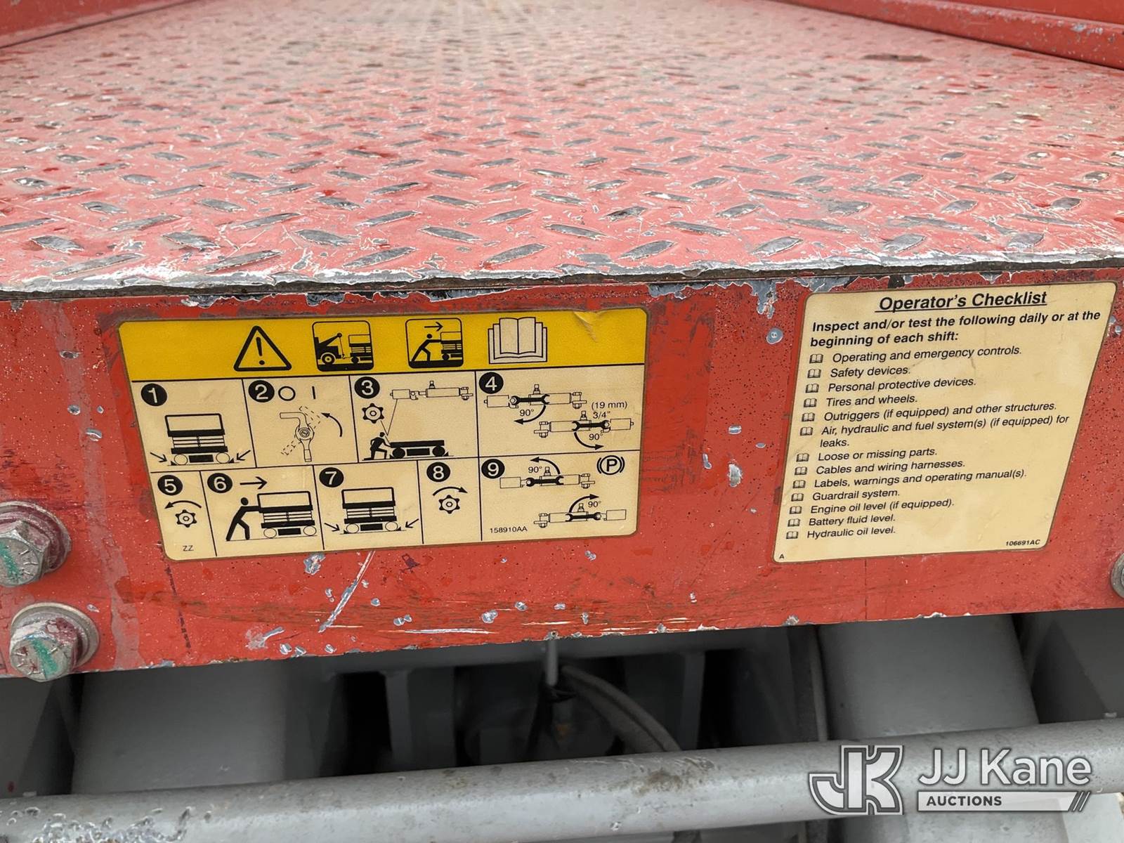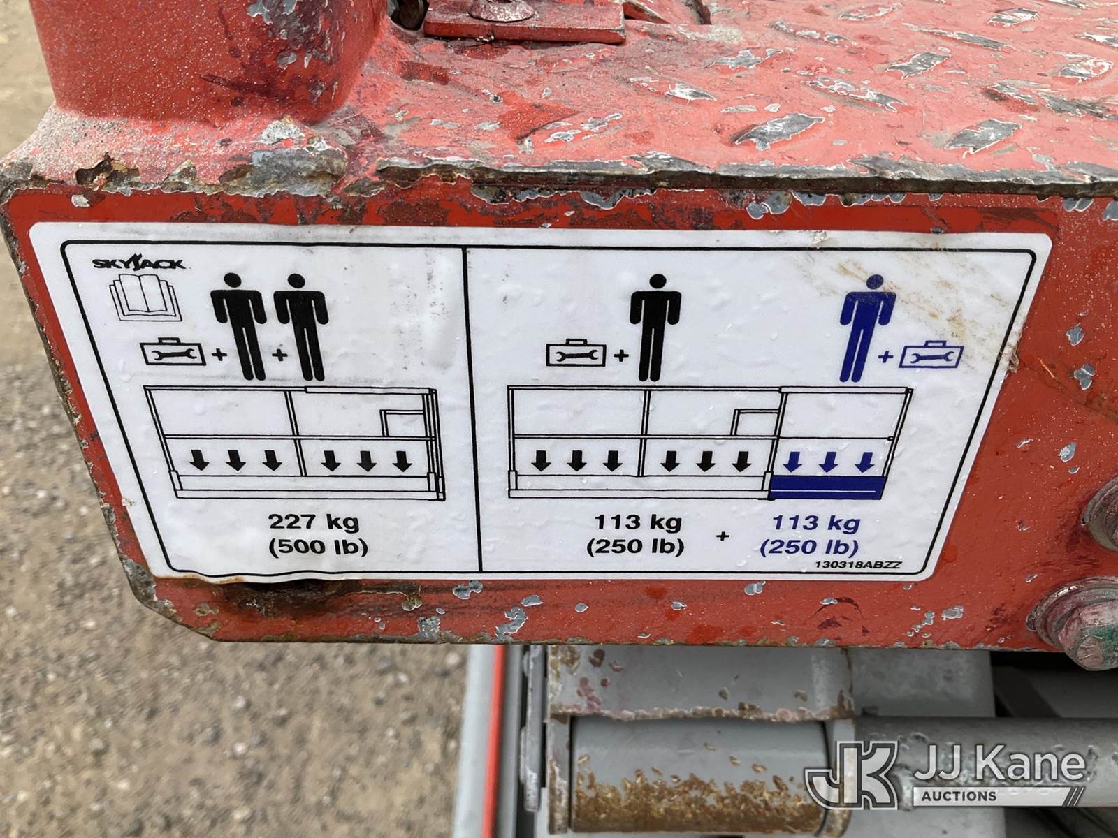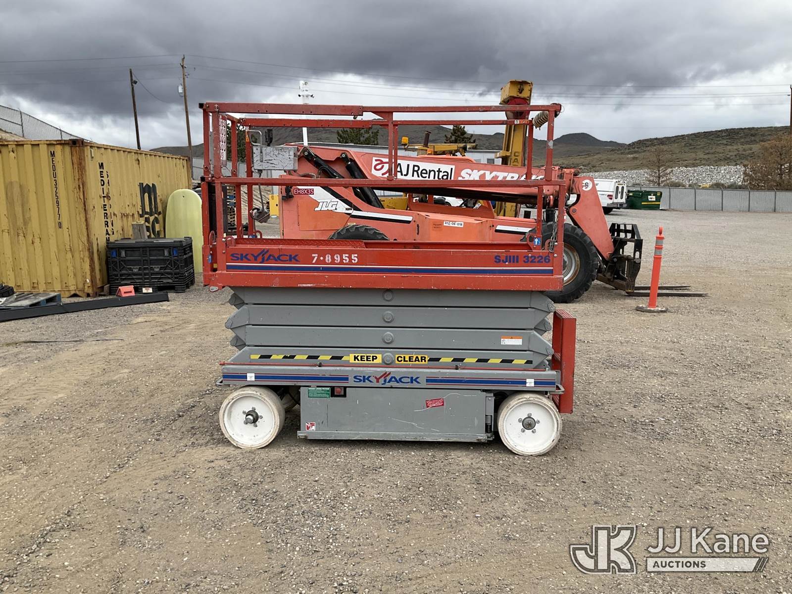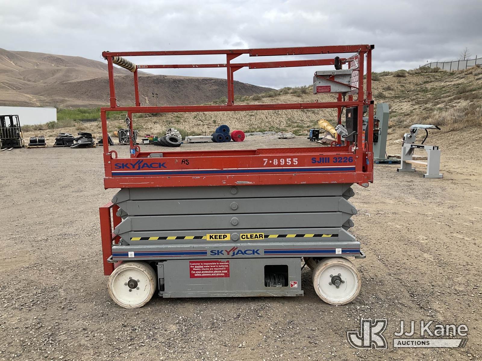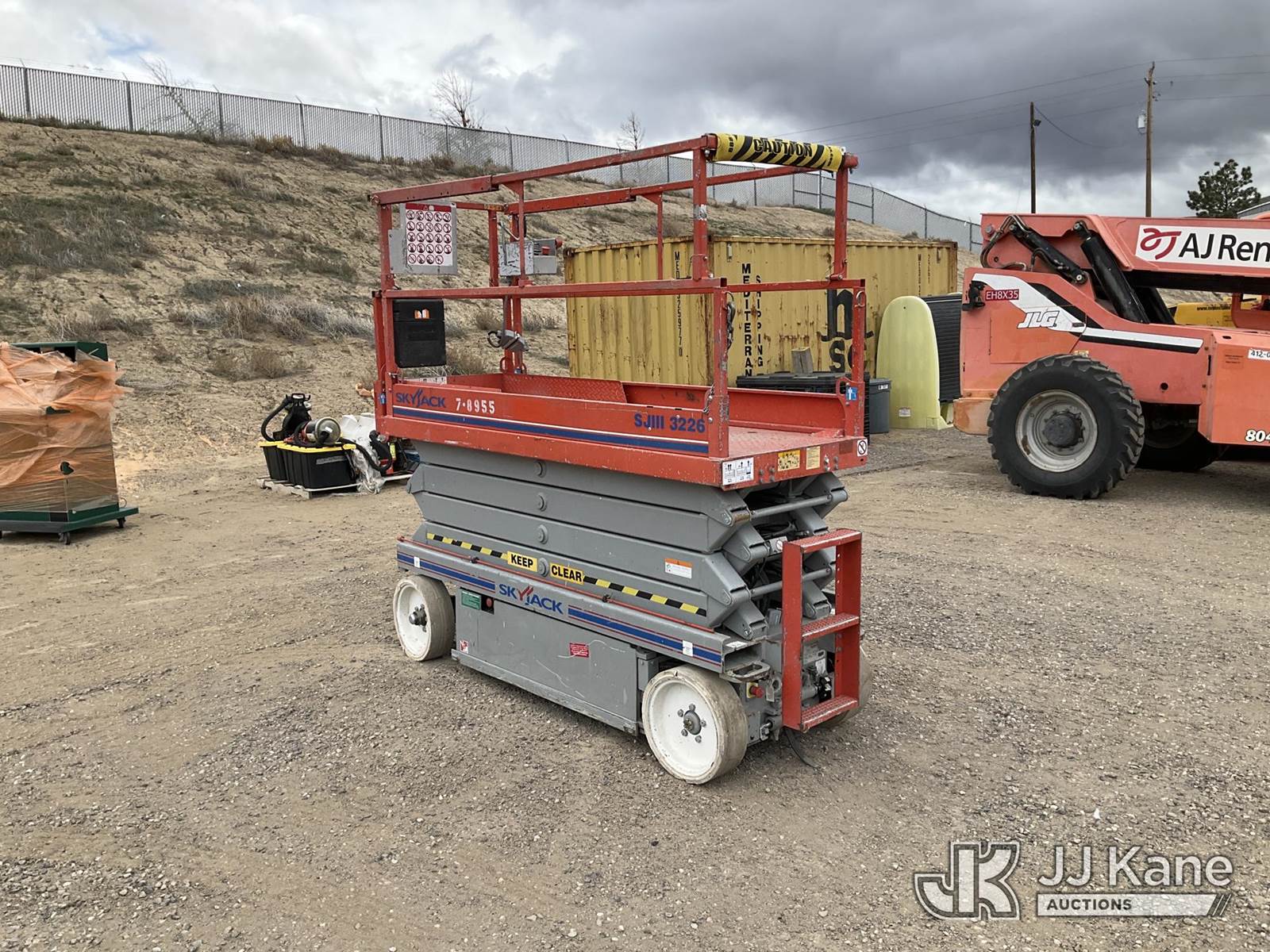 2011 SkyJack SJ3226 Scissor Lift, s/n 27008974, Electric Electric, Hydrostatic, Key Specifications: Working Height: 31.99 ft / 9.75 m, Platform Height (Raised): 25.99 ft / 7.9 m, Overall Width: 32 in / 0.81 m, Overall Length: 91.5 in / 2.32 m, Platform Capacity: 500lbs, Weight: ~3,510–4,190 lbs / 1,592–1,900 kg, Stowed Height (Rails Up): ~77–90 in / 1.95–2.28 m, Stowed Height (Rails Down): ~63–76 in / 1.6–1.93 m, Performance: Drive Speed (Stowed): 2.0–2.4 mph / 3.2–3.9 km/h, Drive Speed (Raised): 0.6 mph / 1.1 km/h Gradeability: 25%–30%, Turning Radius (Inside): 4.17 ft / 1.09 m, Key Features: Power Source: 24V DC battery system, Extension Deck: 3 ft (0.91 m) roll-out, Tires: Solid, non-marking, Controls: Proportional, with swing-out entry, Safety: Pothole protection system, 110V AC power to platform, tilt alarm, (Runs & Moves, Operates) (Reads 135 hours) NOTE: This unit is being sold AS IS/WHERE IS via Timed Auction and is located in Sparks, NV. Inspection & preview days for this unit are the 2 business days prior to the first day of items closing for this auction, item is located at 601 Britain Dr Sparks, NV 89437 and hours of operations are 8a-4p. Titles executed exactly as bidder registered. Ensure your name and/or business name and address in JJ Kane and/or ProxiBid is correct before bidding. For pre-sale questions, please contact Office Staff @ (801) 519-0123 and provide sale date and lot number. Sparks Dealer License Number DLR000052908 / OHV000052909. (Buyer is responsible for removal. Assistance by consignor or JJ Kane Auctions is not assured.)
