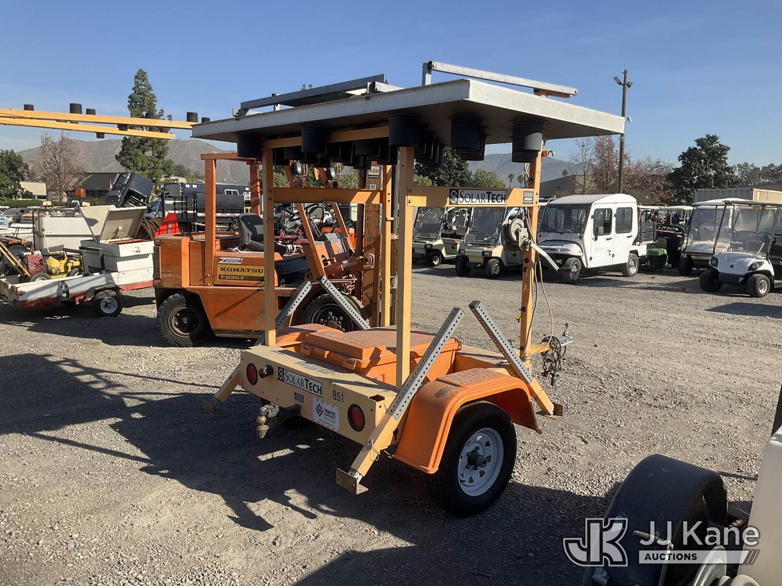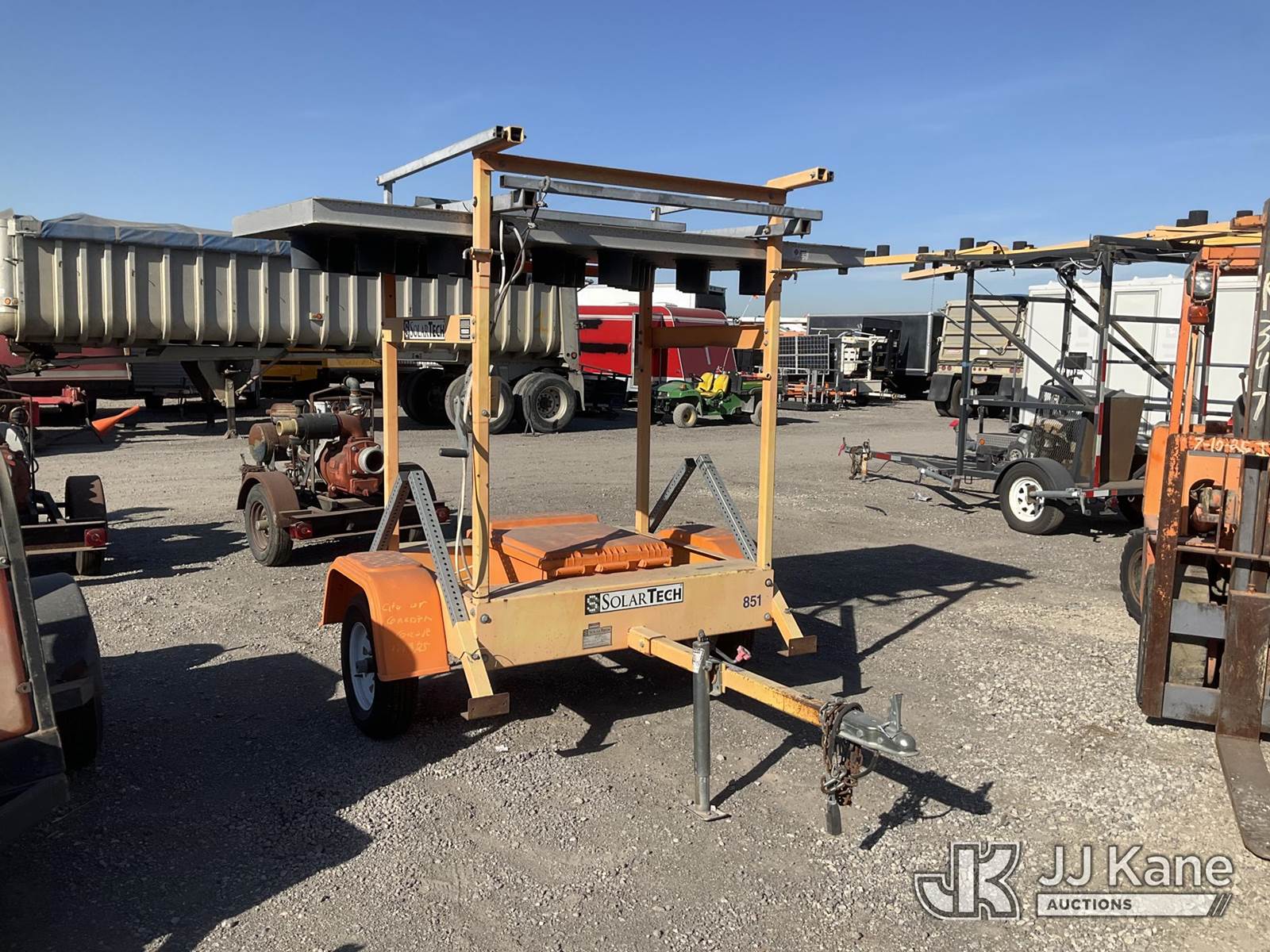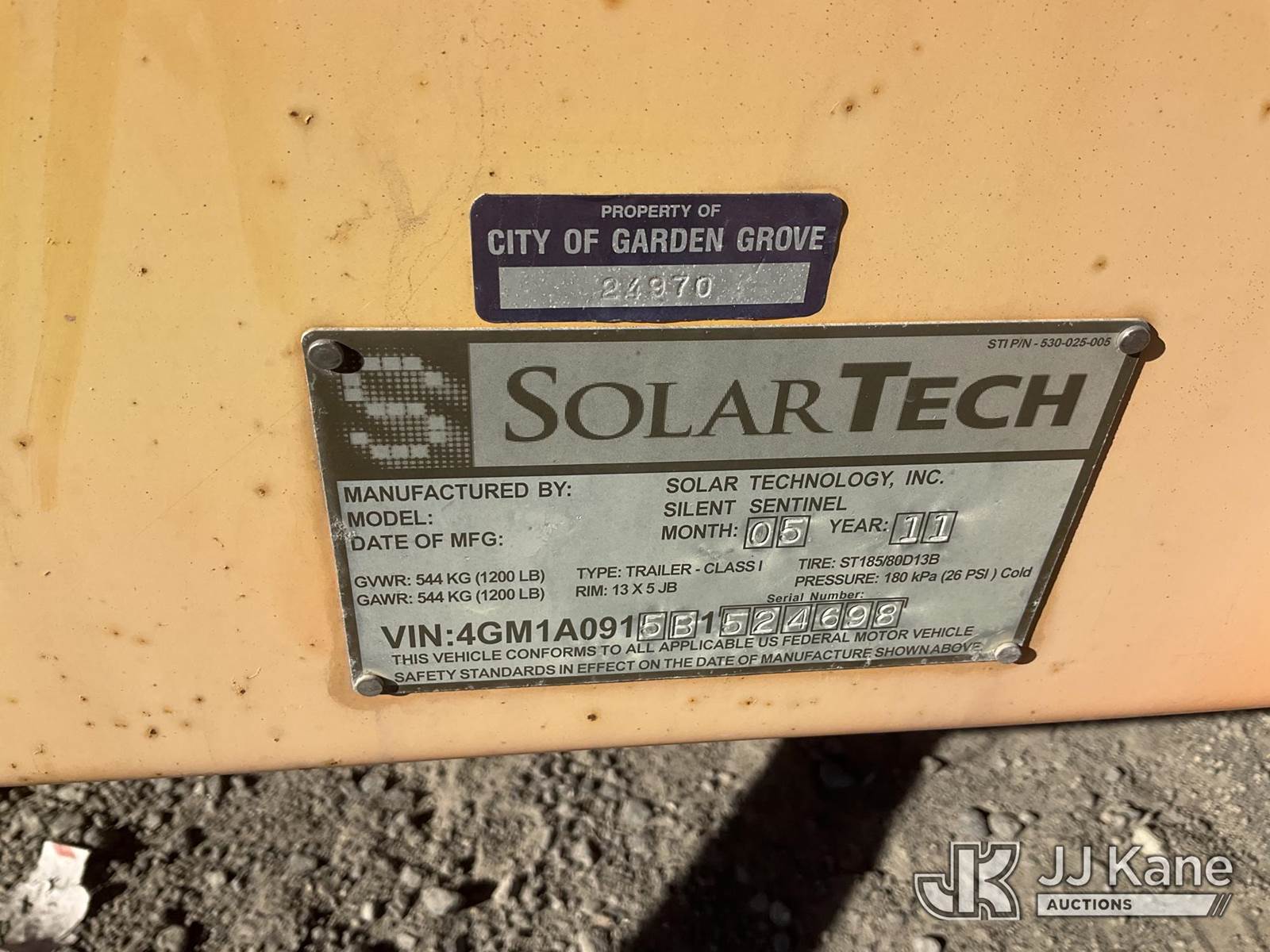 2011 Solar Tech SILENT SENTINEL Portable Arrow Board, s/n 4GM1A0915B1524698, Solar/Battery Powered, with ball hitch, tow package, solar panel, (Arrow lights are not working) (Application for Special Equipment) NOTE: This unit is being sold AS IS/WHERE IS via Timed Auction and is located in Jurupa Valley, CA. Inspection & preview days for this unit are the 2 business days prior to the first day of items closing for this auction, item is located at 4510 Muth Way Jurupa Valley, CA 92509 and hours of operations are 8a-4p. For pre-sale questions, please contact please contact Office Staff @ (310) 353-7140. Dealer License Number 45696. (Buyer is responsible for removal. Assistance by consignor or JJ Kane Auctions is not assured.)