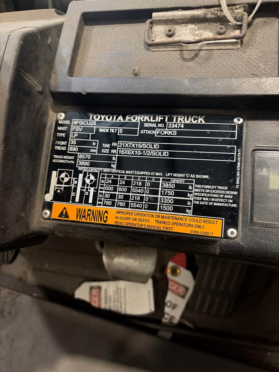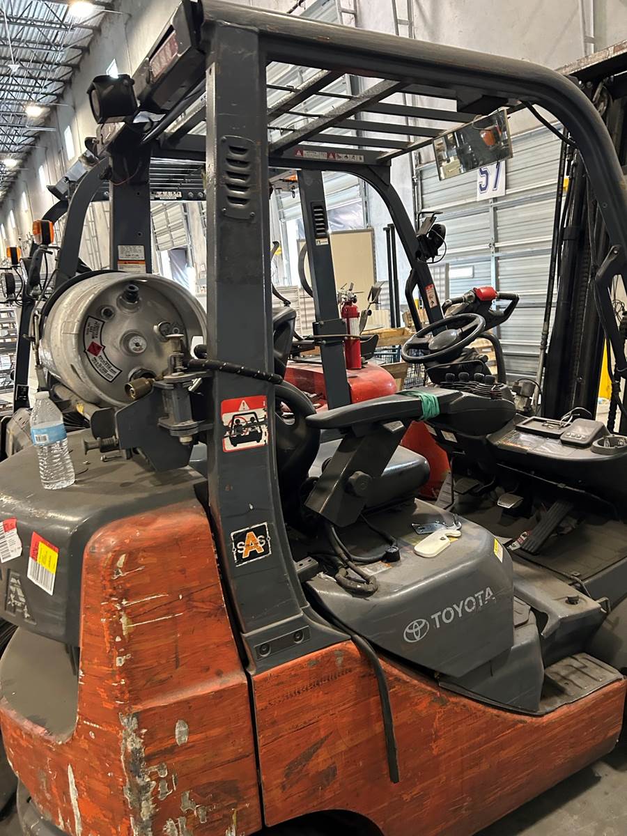 2011 Toyota 8FGCU25, serial #33474, 93/218" three stage mast, 4-way to carriage, sideshifter, 5000lb capacity, cushion tires, propane fuel, fingertip controls. no condition info. SDC
