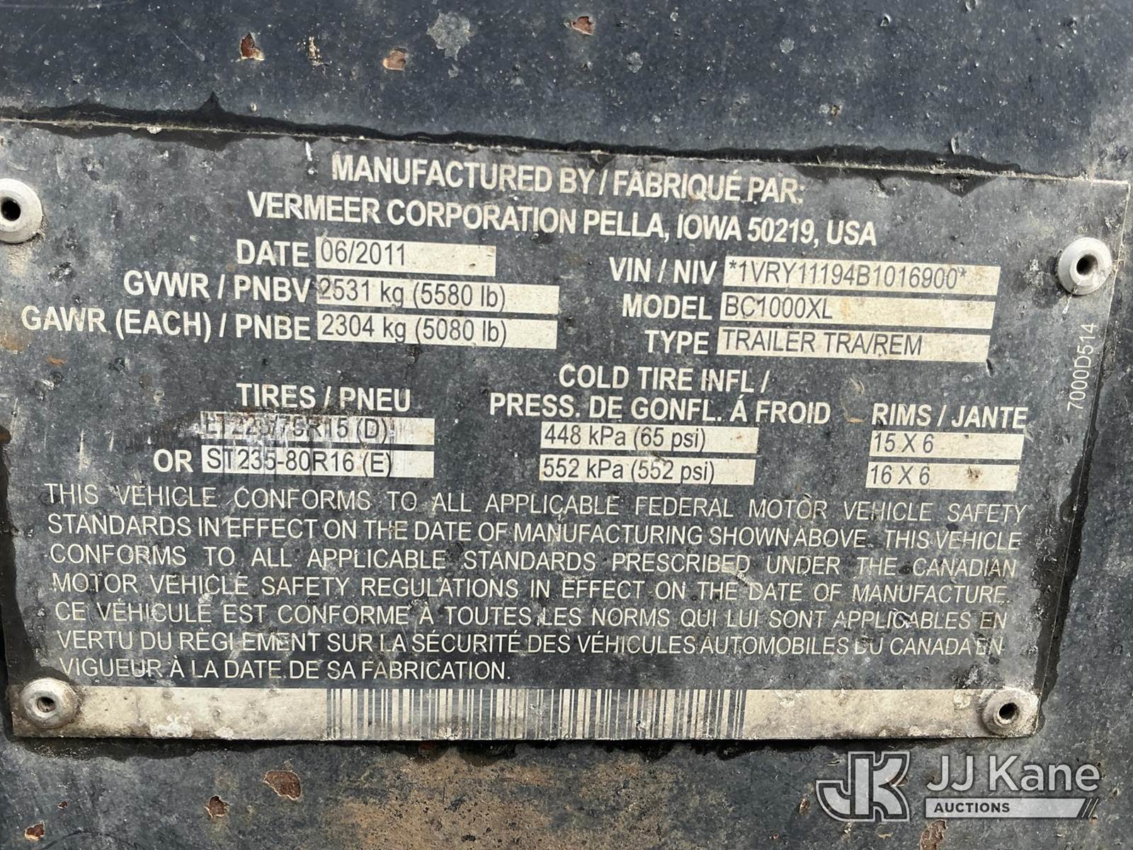 2011 Vermeer BC1000XL Chipper (12in Drum), diesel, (Not Running, Condition Unknown) (Seller States: Red-Tagged For Break Away Brake System Not Working & Safety Chain Latch Missing, These Have Been Fixed According To Seller) (Reads 2,228 hours) This is a Titled Item NOTE: This unit is being sold AS IS/WHERE IS via Timed Auction and is located in Portland, OR. Inspection & preview days for this unit are the 2 business days prior to the first day of items closing for this auction, item is located at 13817 NE Sandy Blvd Portland, OR 97230 and hours of operations are 8a-4p. For pre-sale questions, please contact Tony Tully @ (503)-307-1348. Dealer License Number DL1391. (Buyer is responsible for removal. Assistance by consignor or JJ Kane Auctioneers is not assured.)