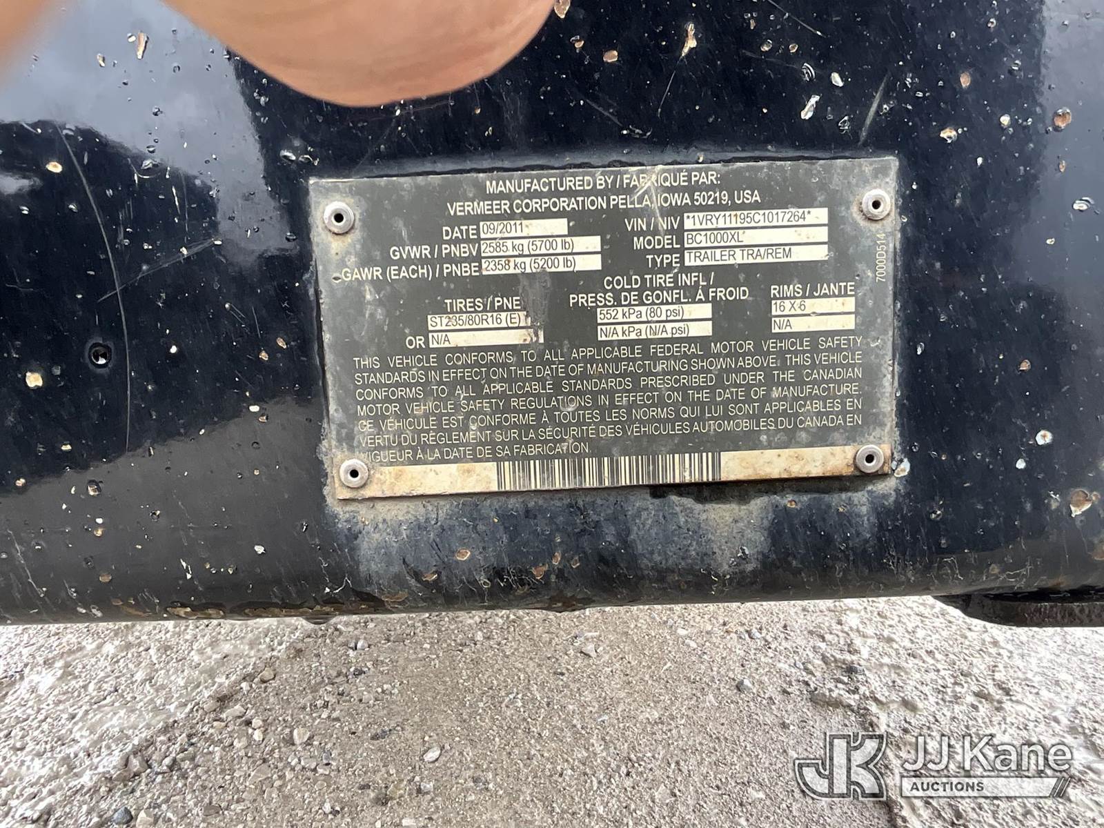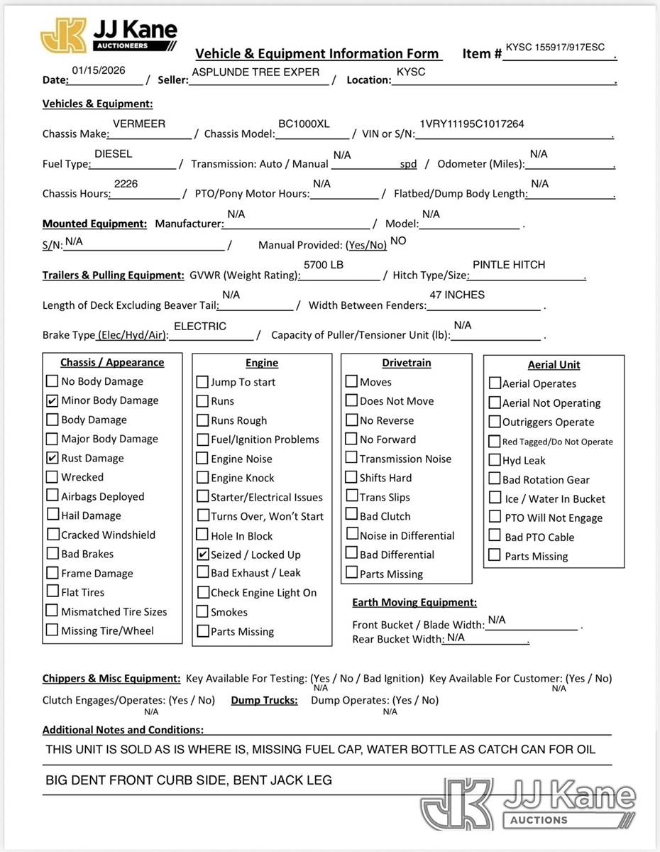 2011 Vermeer BC1000XL Chipper (12in Drum), s/n 1VRY11195C1017264, diesel, trailer mtd. (No Title, Certificate Of Origin) (Not Running, Engine Seized/Locked Up, Missing Fuel Cap, Body Damage, Bent Jack Leg) (Seller States: Bad Engine) NOTE: This unit is being sold AS IS/WHERE IS via Timed Auction and is located in Elizabethtown, KY. Inspection & preview days for this unit are by appointment only; please contact us at contact@jjkane.com or 84-Go-JJKane for more details. Kentucky Auctioneer Michael Whitebread - License # 256617 (Buyer is responsible for removal. Assistance by consignor or JJ Kane Auctions is not assured.)