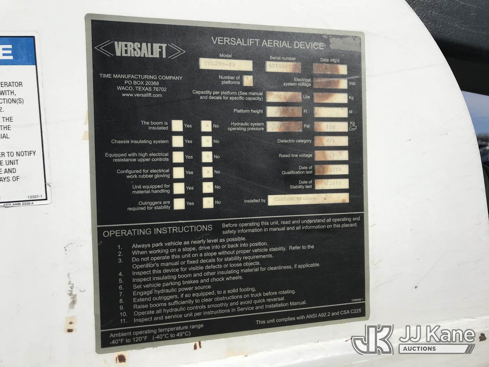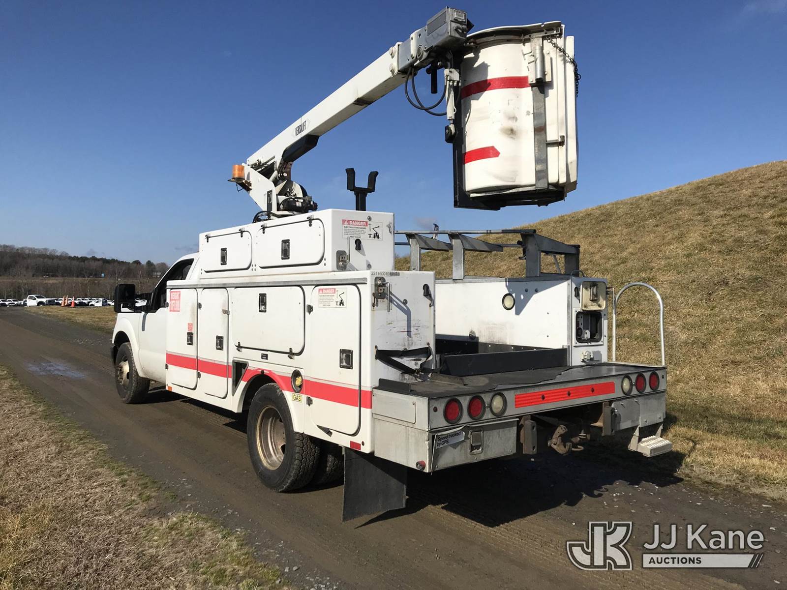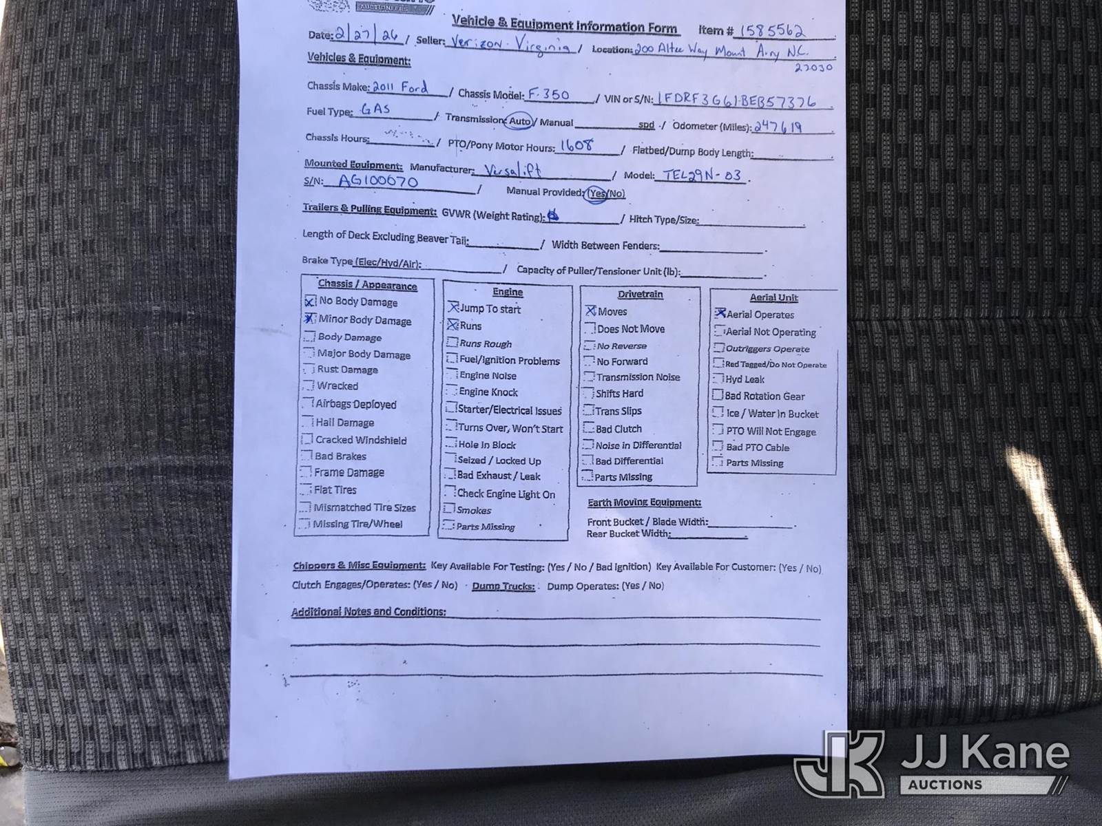 Versalift TEL29N03, 34 ft, Telescopic Non-Insulated Bucket Truck s/n AG100070, with single-man bucket, mounted behind cab on 2011 Ford F350 Service Truck, 6.2L V8 OHV 16V gas, 6-Speed Automatic, A/C, (247,620 miles) (Runs, Moves & Upper Operates) (Jump To Start, Body Damage) This is a Titled Item NOTE: This unit is being sold AS IS/WHERE IS via Timed Auction and is located in Kodak, TN. Inspection & preview days for this unit are by appointment only; please contact us at contact@jjkane.com or 84-Go-JJKane for more details. (Missing manuals, See Auction Company for Manufacturers Information to obtain manuals) (Buyer is responsible for removal. Assistance by consignor or JJ Kane Auctions is not assured.)