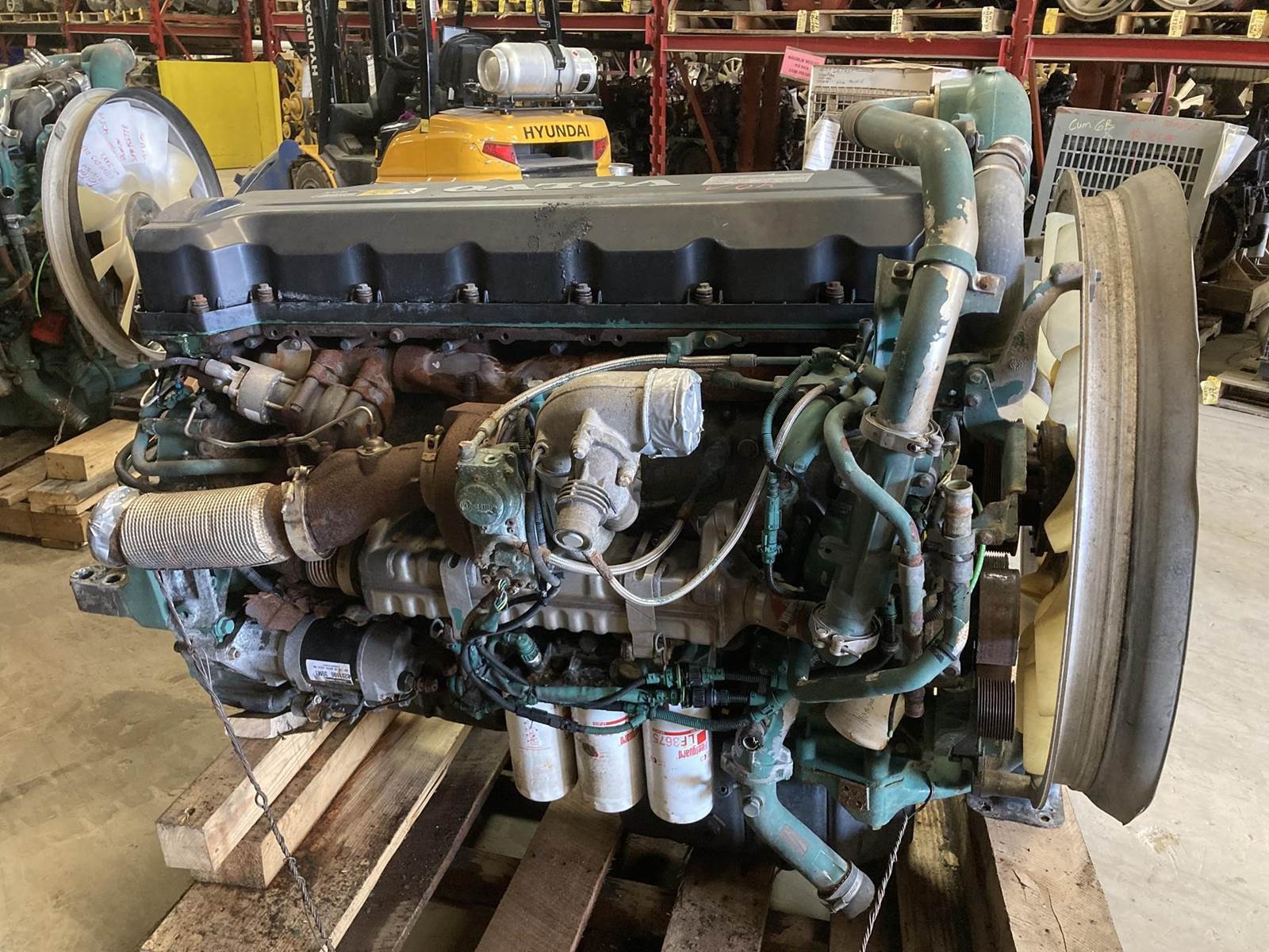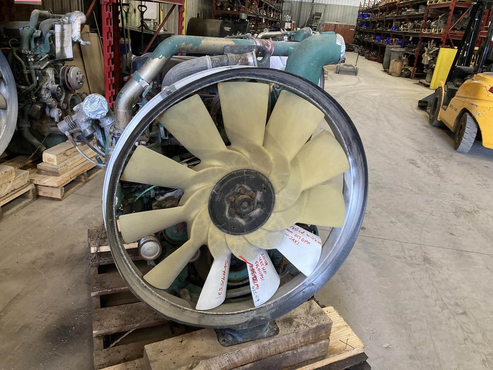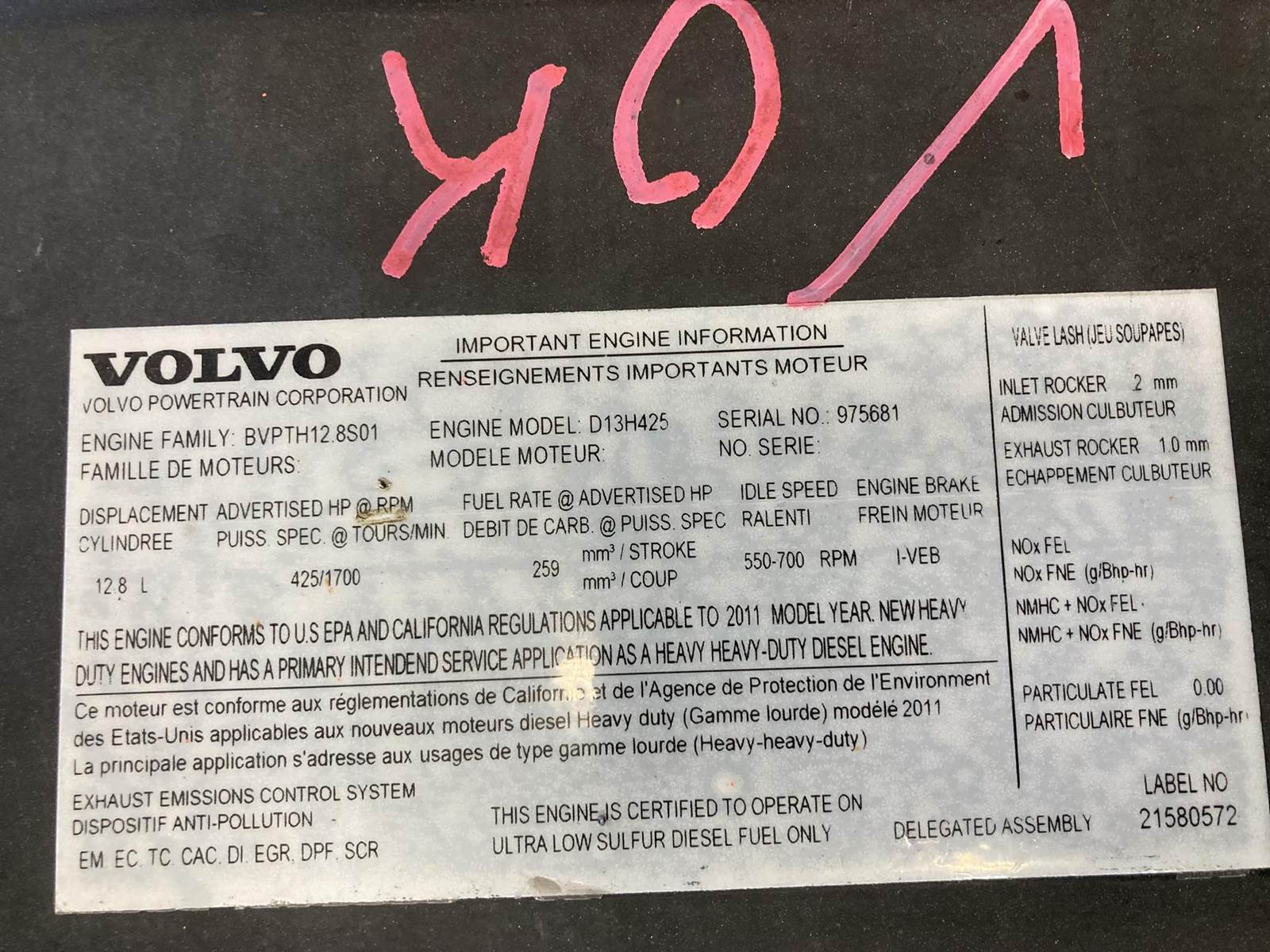 GOOD USED 2011 VOLVO D13 425HP DIESEL TAKEOUT ENGINE FOR SALE at ADELMAN’S TRUCK PARTS in CANTON,OHIO. ALL COMPLETE and RUN TESTED, 635,419 MILES SHOWING ON ECM, MODEL D13H-425, ENGINE BRAKE, 425 HP @ 1700 RPM, EPA10, BVPTH12.8S01 FAMILY #, with EM, EC, TC, CAC, DI, EGR, DPF & SCR EMISSIONS CONTROL SYSTEMS. 50+ LBS OIL PRESSURE. *** HAS BROKEN FLYWHEEL HOUSING.
