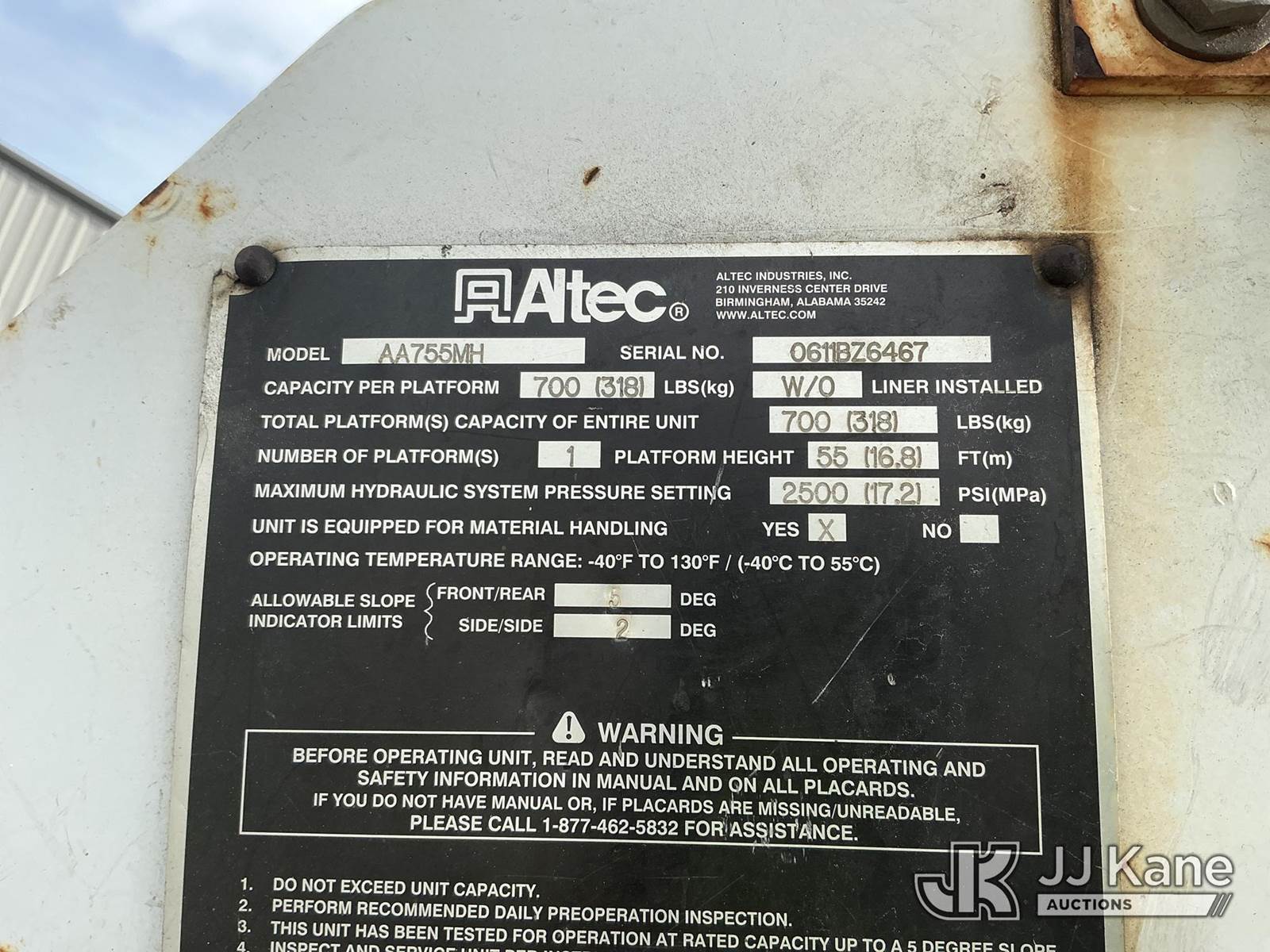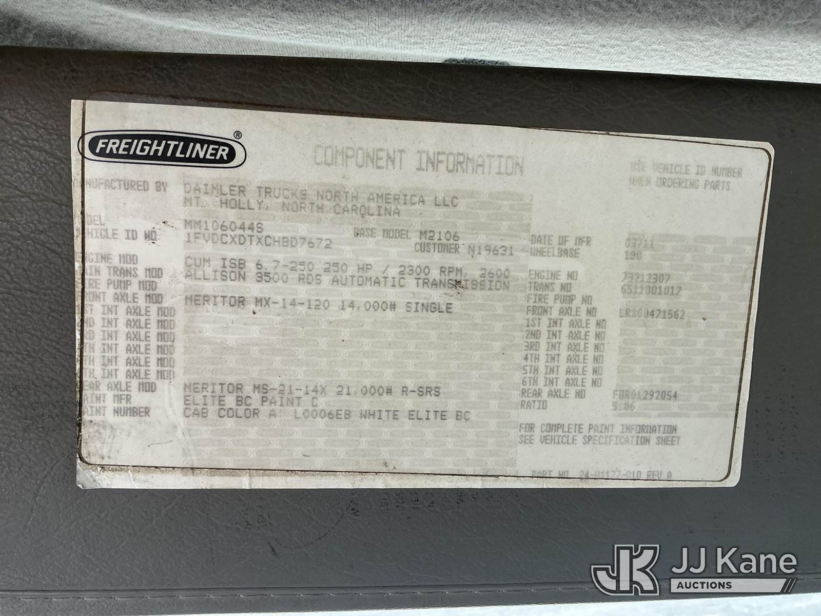 Altec AA755-MH, 60 ft, Material Handling Bucket Truck s/n 0611BZ6467, with two-man bucket, rear mounted on 2012 Freightliner M2 106 4x4 Utility Truck, Cummins ISB-250 6.7L diesel, Auto, A/C, (141,879 miles) (Runs, Moves & Upper Operates) (Check Engine Light On, Cracked Windshield The manufacturer has notified JJ Kane that this equipment is subject to an open recall. CSN 571 Chassis Air Brake Hose Replacement The equipment should not be operated until this is addressed. Buyer is responsible for reviewing the recall notice and contacting the manufacturer to schedule the recommended corrective actions. Associated costs may be covered by the manufacturer in some cases.) This is a Titled Item NOTE: This unit is being sold AS IS/WHERE IS via Timed Auction and is located in China Grove, NC. Inspection & preview days for this unit are the 2 business days prior to the first day of items closing for this auction, item is located at 820 E NC Hwy 152 China Grove, NC 28023 and hours of operations are 8a-4p. For pre-sale questions, please contact Office Staff @ (704) 674-1113. (Manuals provided in cab) (Buyer is responsible for removal. Assistance by consignor or JJ Kane Auctions is not assured.)