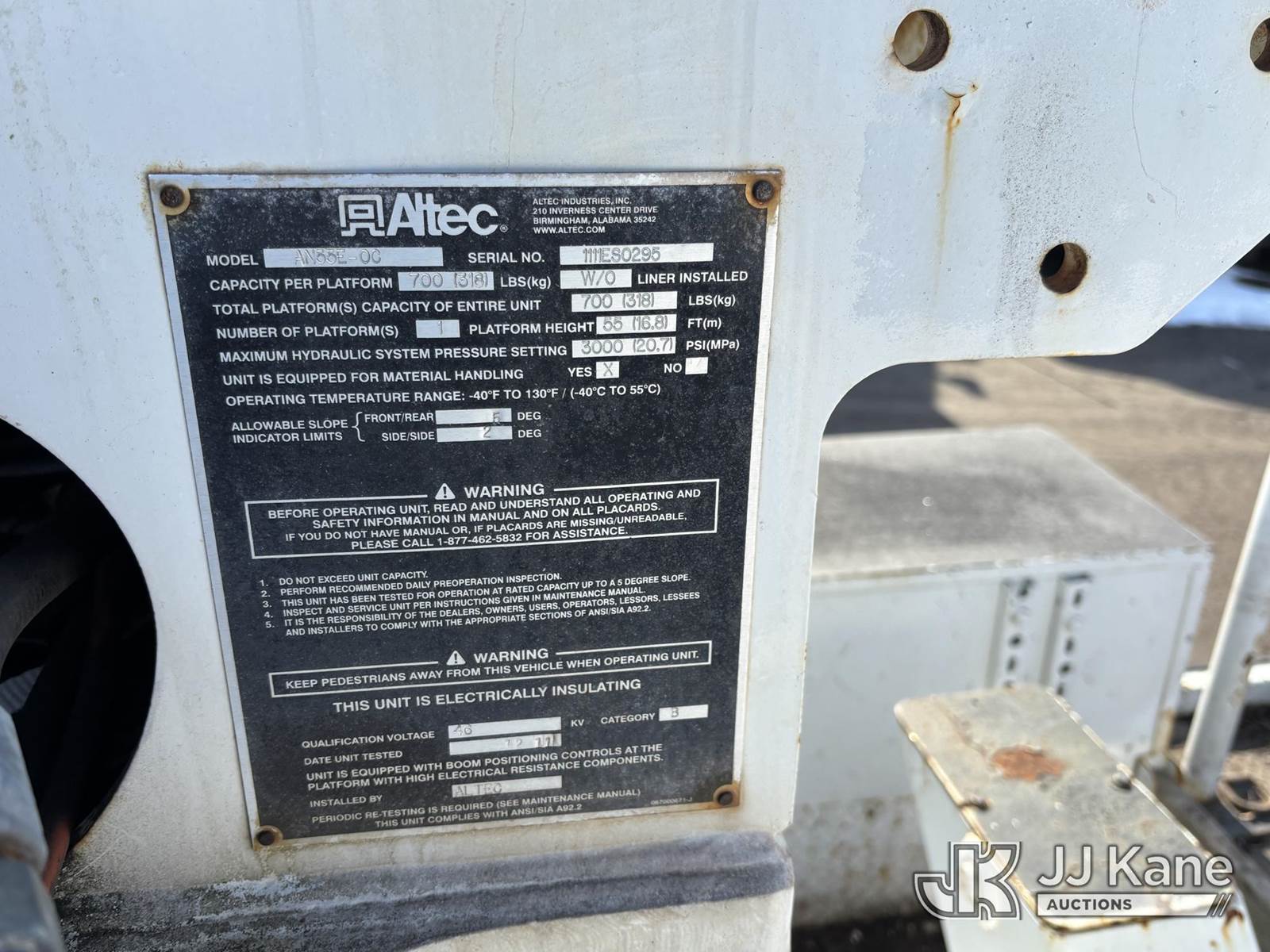 Altec AN55E-OC, 60 ft, Material Handling Bucket Truck s/n 111E50295, with two-man bucket & 4 outriggers, rear mounted on 2012 International 4300 Utility Truck, MaxxForce 7.6L diesel, Auto, A/C, (82,539 miles) (Runs Moves & Upper Operates, Stop Engine Light On, Check Engine Light On, Must Tow) This is a Titled Item NOTE: This unit is being sold AS IS/WHERE IS via Timed Auction and is located in Plymouth Meeting, PA. Inspection & preview days for this unit are the 2 business days prior to the first day of items closing for this auction, item is located at 1402 Conshohocken Rd Plymouth Meeting, PA 19462 and hours of operations are 8a-4p. For pre-sale questions, please contact Bruce Thomas @ (267) 887-0392 or bruce.thomas.jr@jjkane.com. (Manuals provided in cab) (Buyer is responsible for removal. Assistance by consignor or JJ Kane Auctions is not assured.)