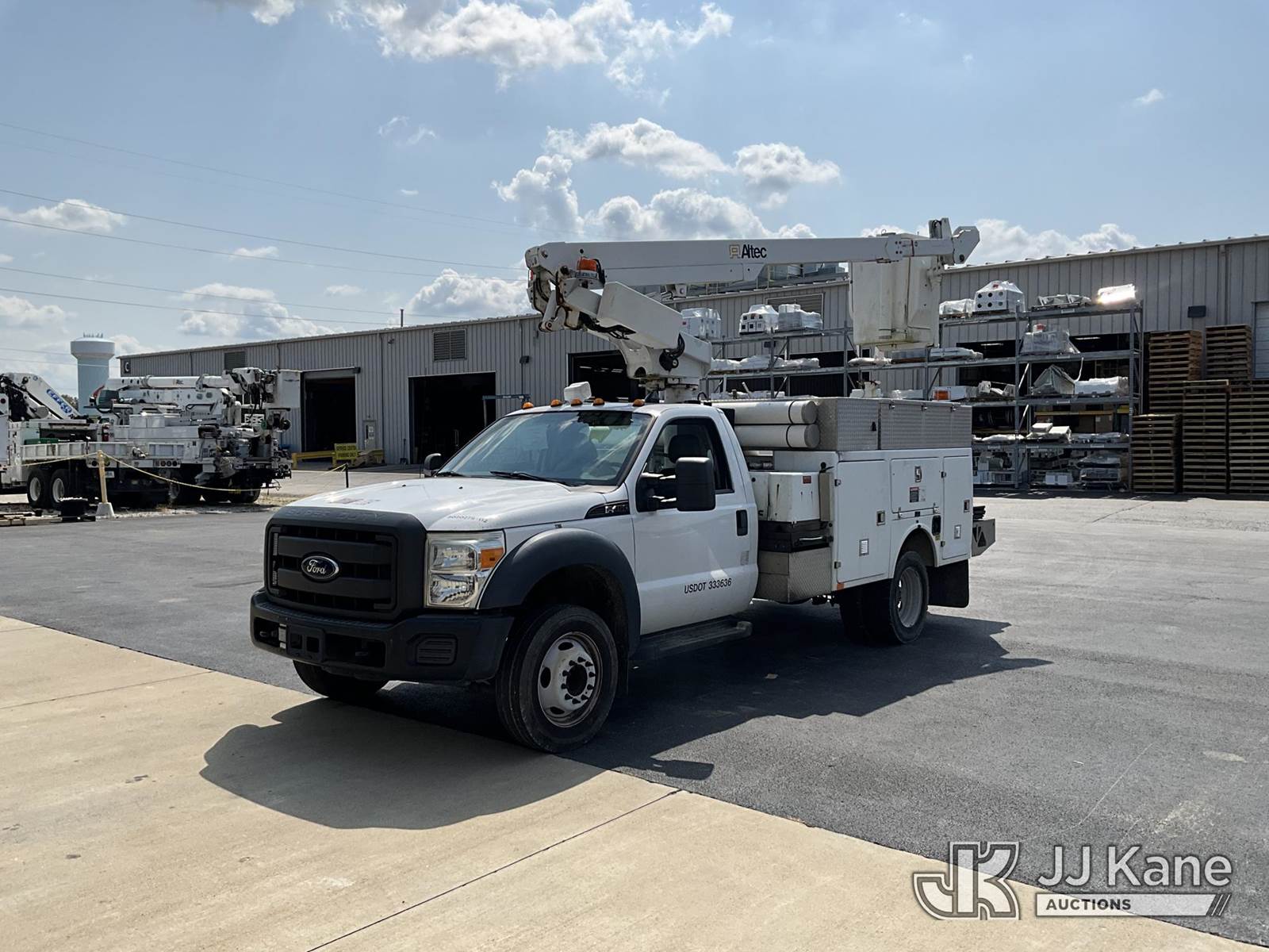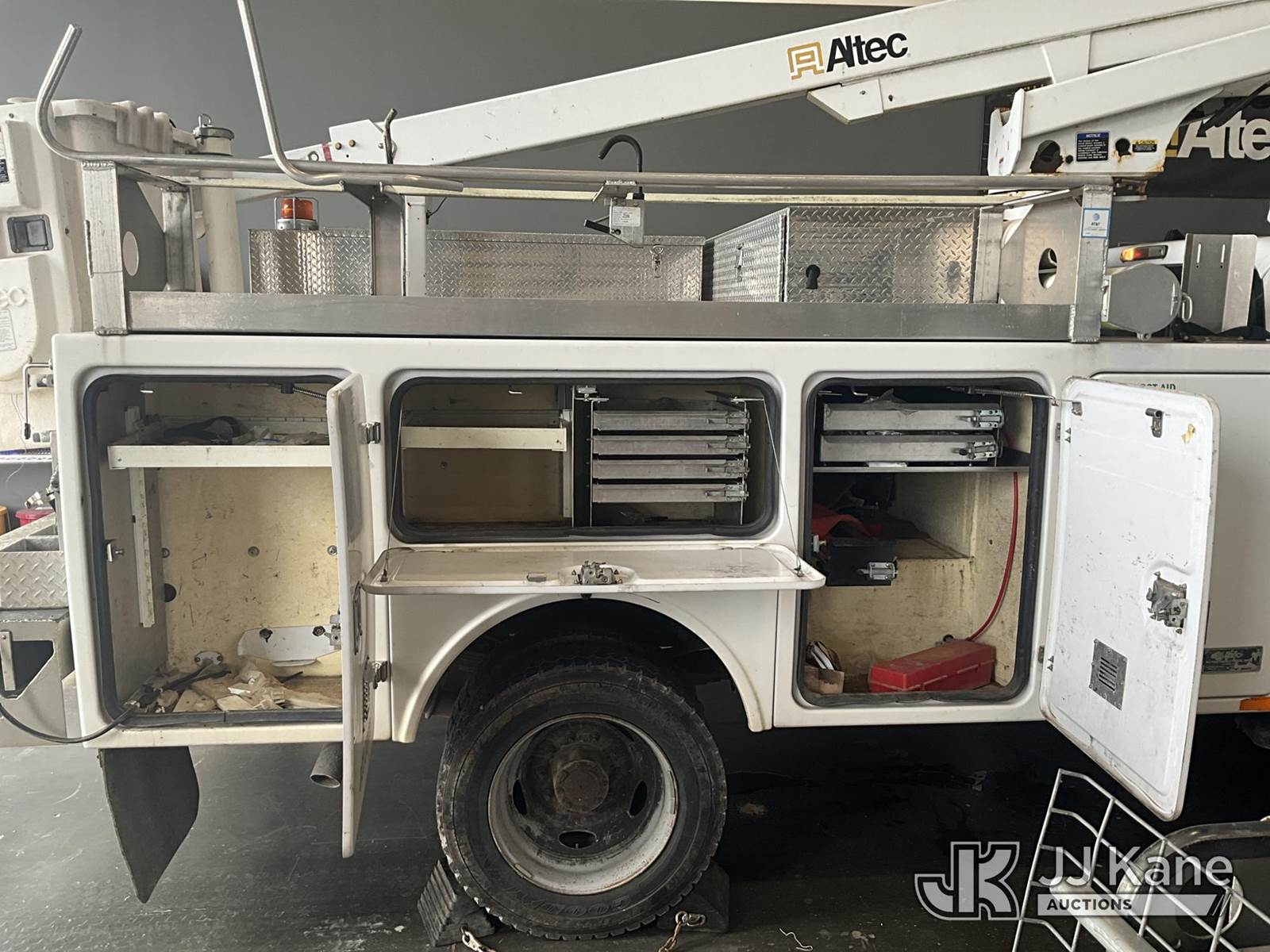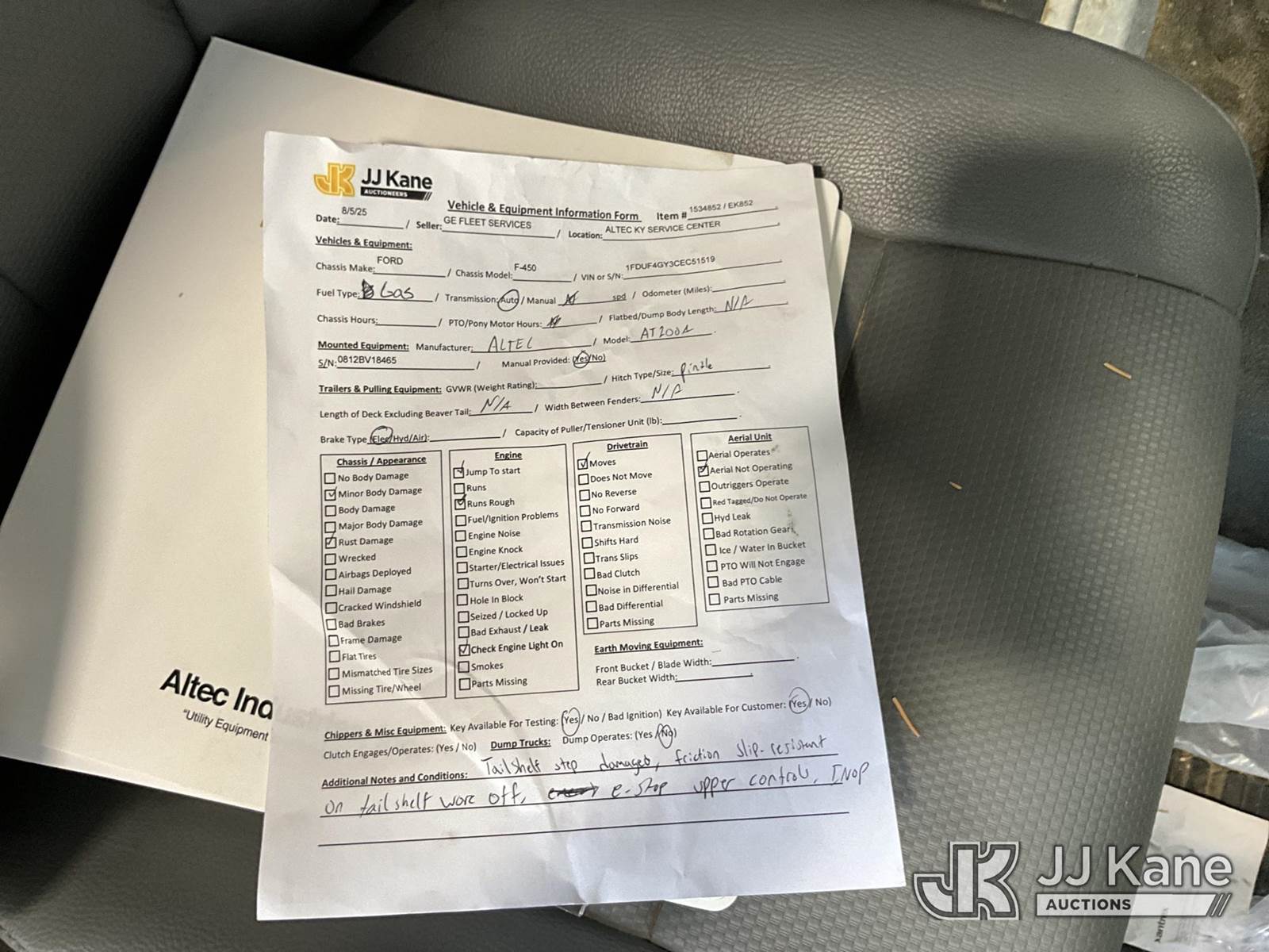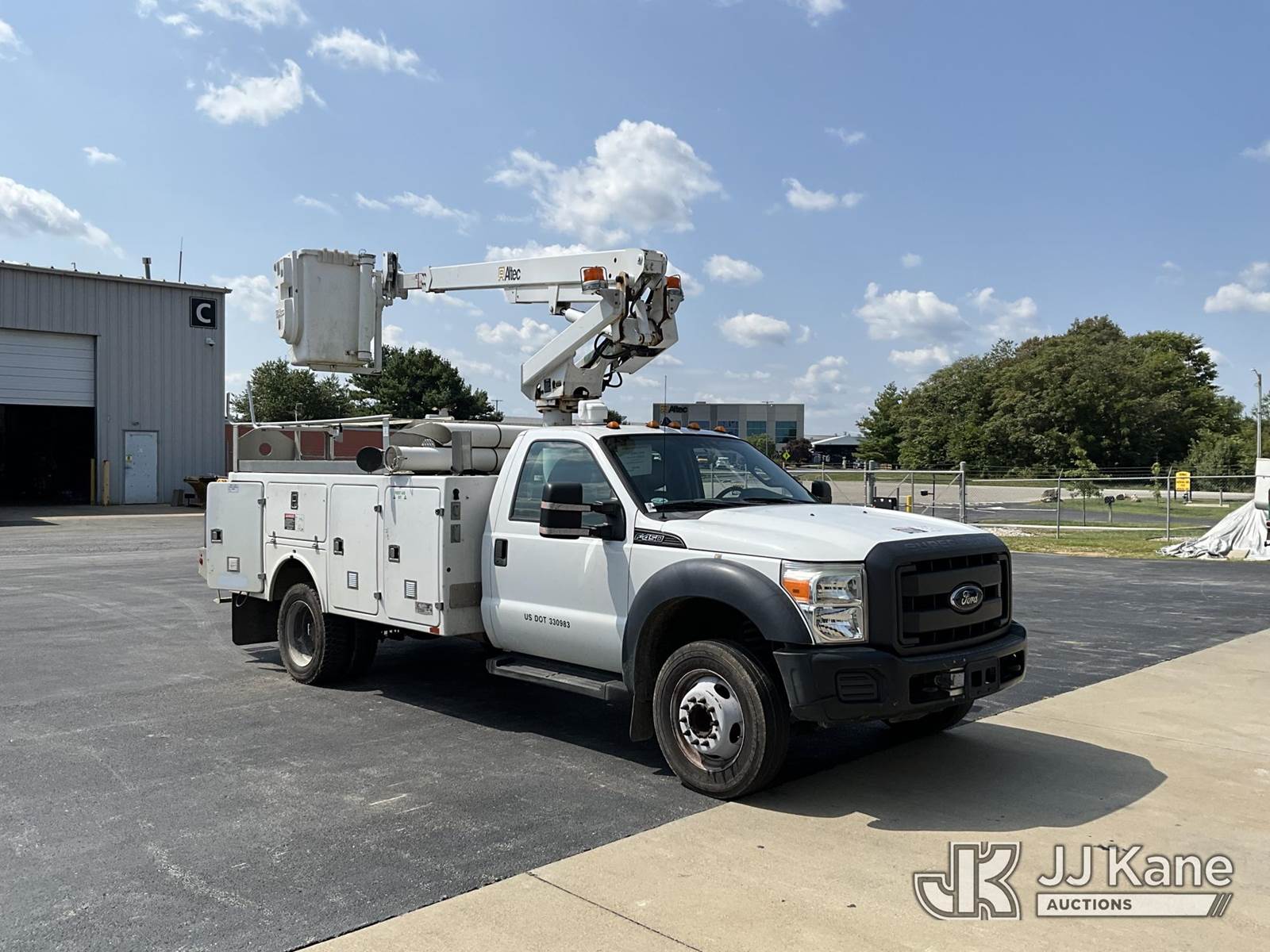 Altec AT200, 35 ft, Telescopic Non-Insulated Bucket Truck s/n 0812BV18465, with single-man bucket, mounted behind cab on 2012 Ford F-450 SD Service Truck, 10-cyl gas, Auto, A/C, with Cummins Onan generator, (167,455 miles) (Runs, Moves & Upper Operates) (Jump To Start, Runs Rough, Body/Rust Damage Can NOT be sold to NY, NJ, MO residents) This is a Titled Item NOTE: This unit is being sold AS IS/WHERE IS via Timed Auction and is located in Elizabethtown, KY. Inspection & preview days for this unit are by appointment only; please contact us at contact@jjkane.com or 84-Go-JJKane for more details. Kentucky Auctioneer Michael Whitebread - License # 256617 (Manuals provided in cab) (Buyer is responsible for removal. Assistance by consignor or JJ Kane Auctioneers is not assured.)