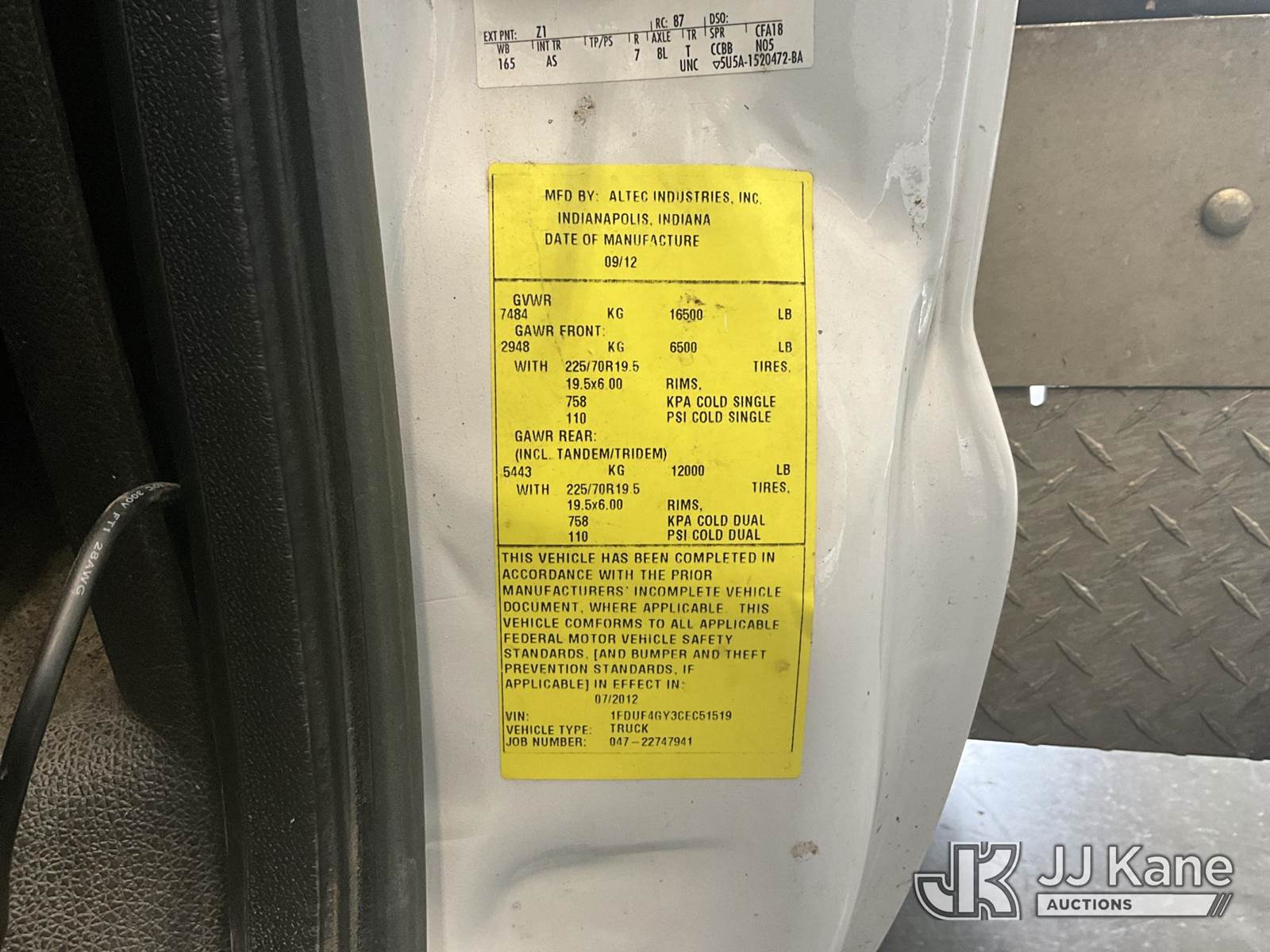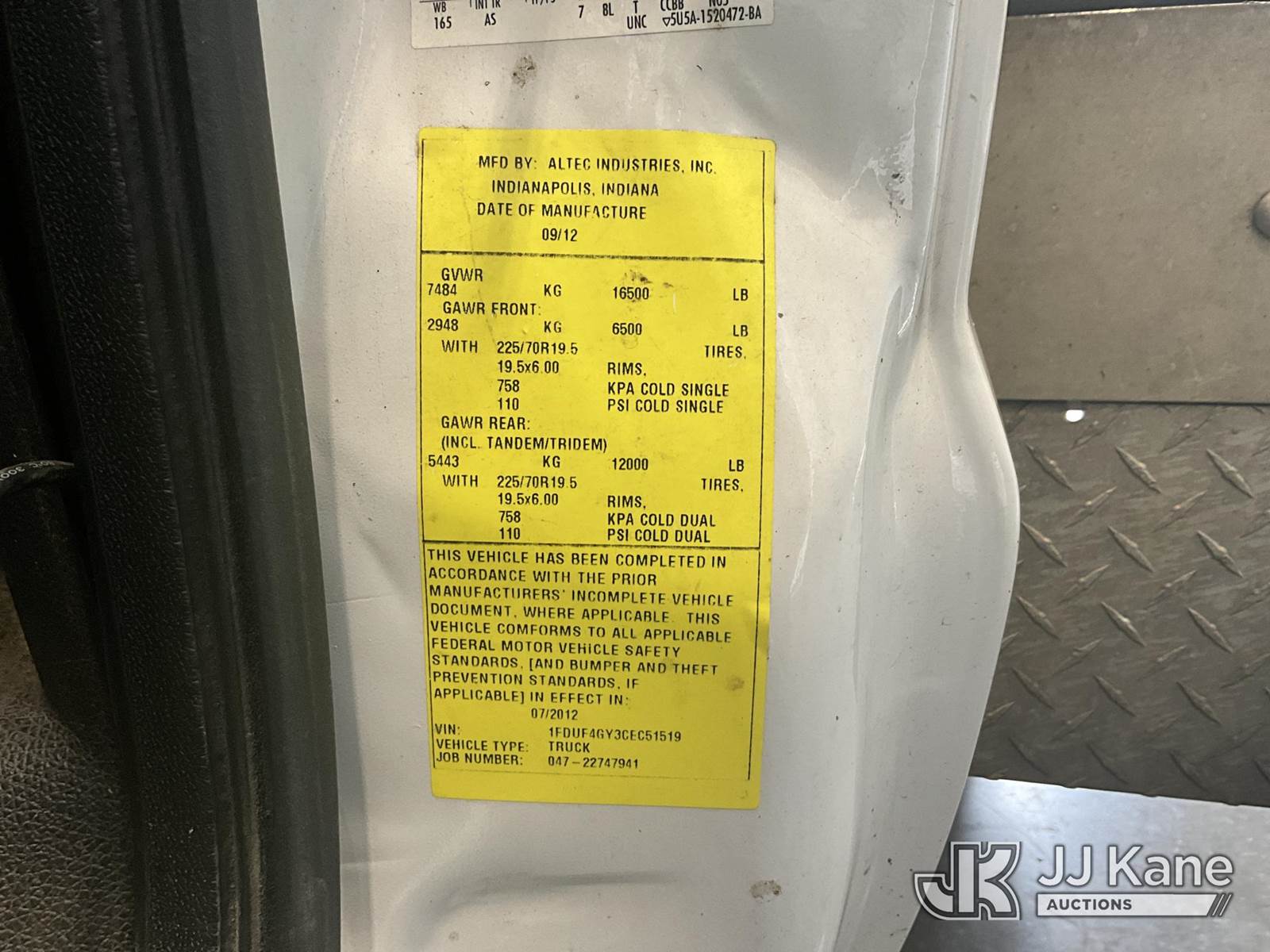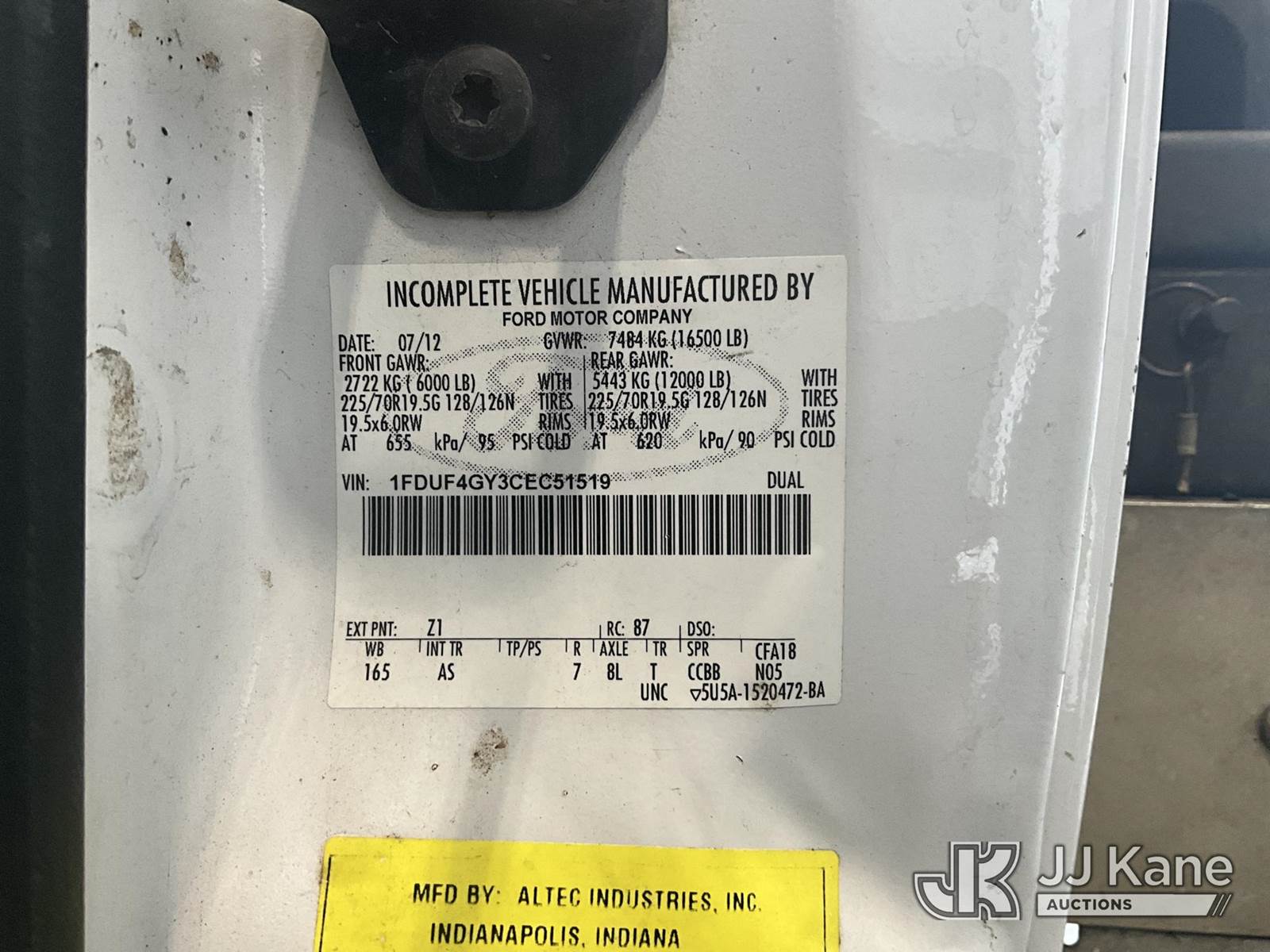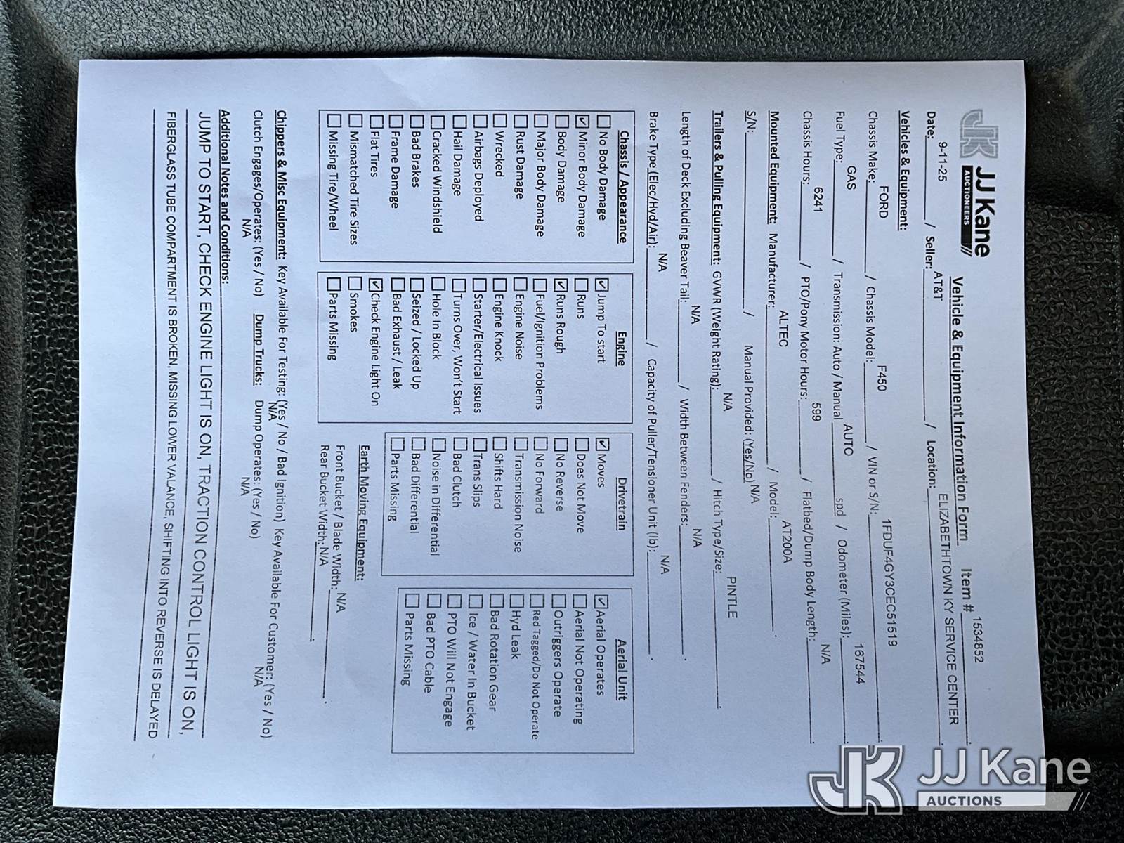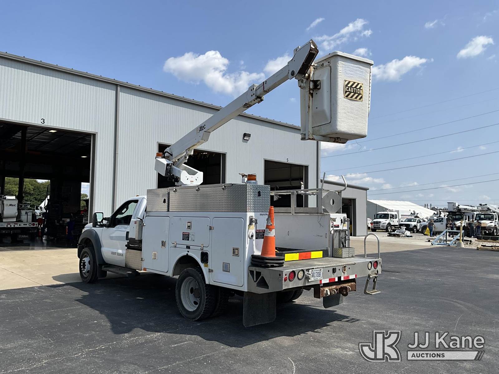 Altec AT200, 35 ft, Telescopic Non-Insulated Bucket Truck s/n 0812BV18465, with single-man bucket, mounted behind cab on 2012 Ford F-450 SD Service Truck, 10-cyl gas, Auto, A/C, with Cummins Onan generator, (167,455 miles) (Runs, Moves & Upper Operates) (Jump To Start, Runs Rough, Body/Rust Damage Can NOT be sold to NY, NJ, MO residents) This is a Titled Item NOTE: This unit is being sold AS IS/WHERE IS via Timed Auction and is located in Elizabethtown, KY. Inspection & preview days for this unit are by appointment only; please contact us at contact@jjkane.com or 84-Go-JJKane for more details. Kentucky Auctioneer Michael Whitebread - License # 256617 (Manuals provided in cab) (Buyer is responsible for removal. Assistance by consignor or JJ Kane Auctioneers is not assured.)