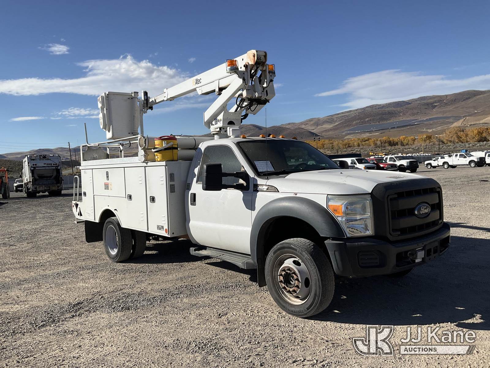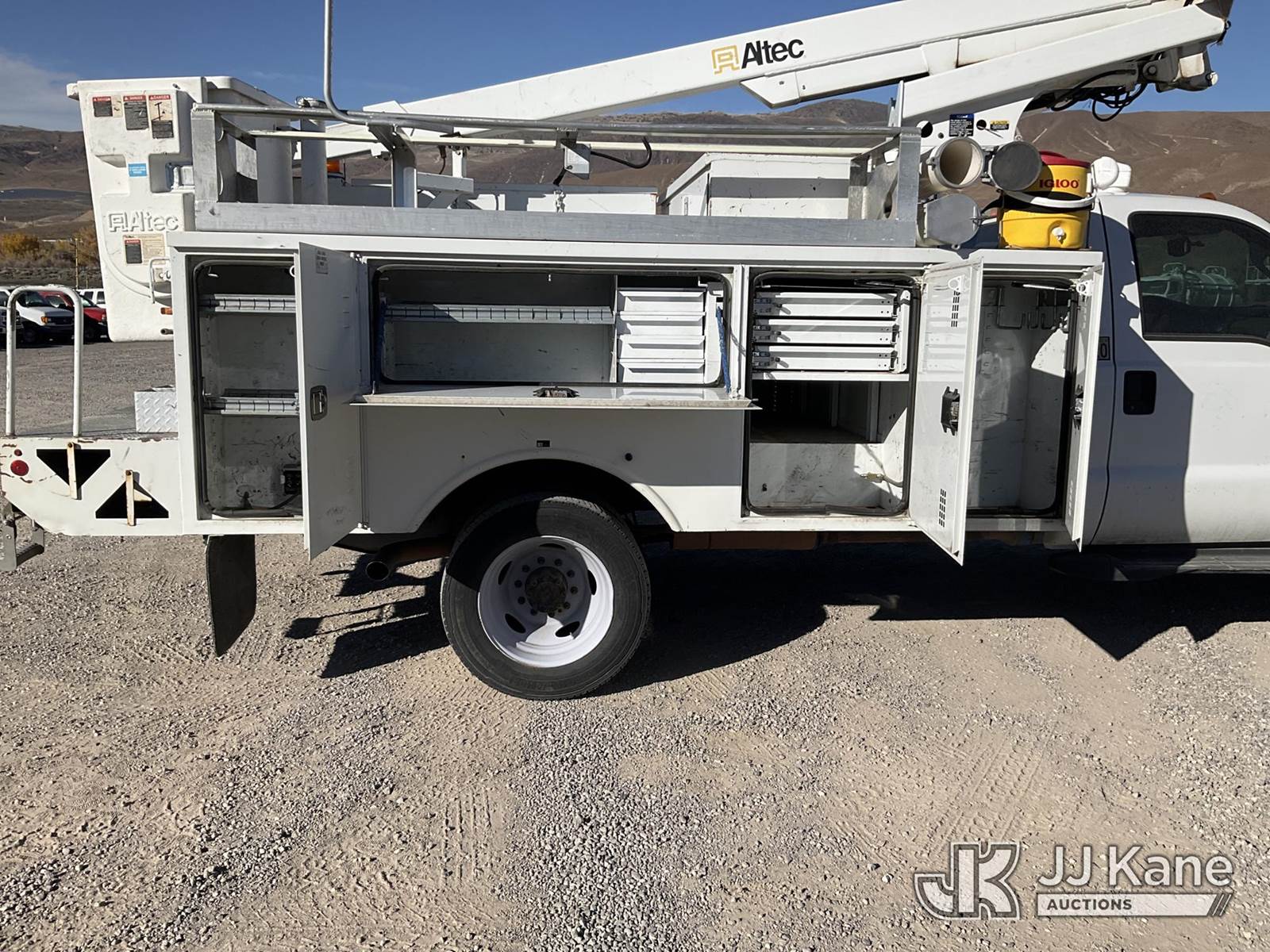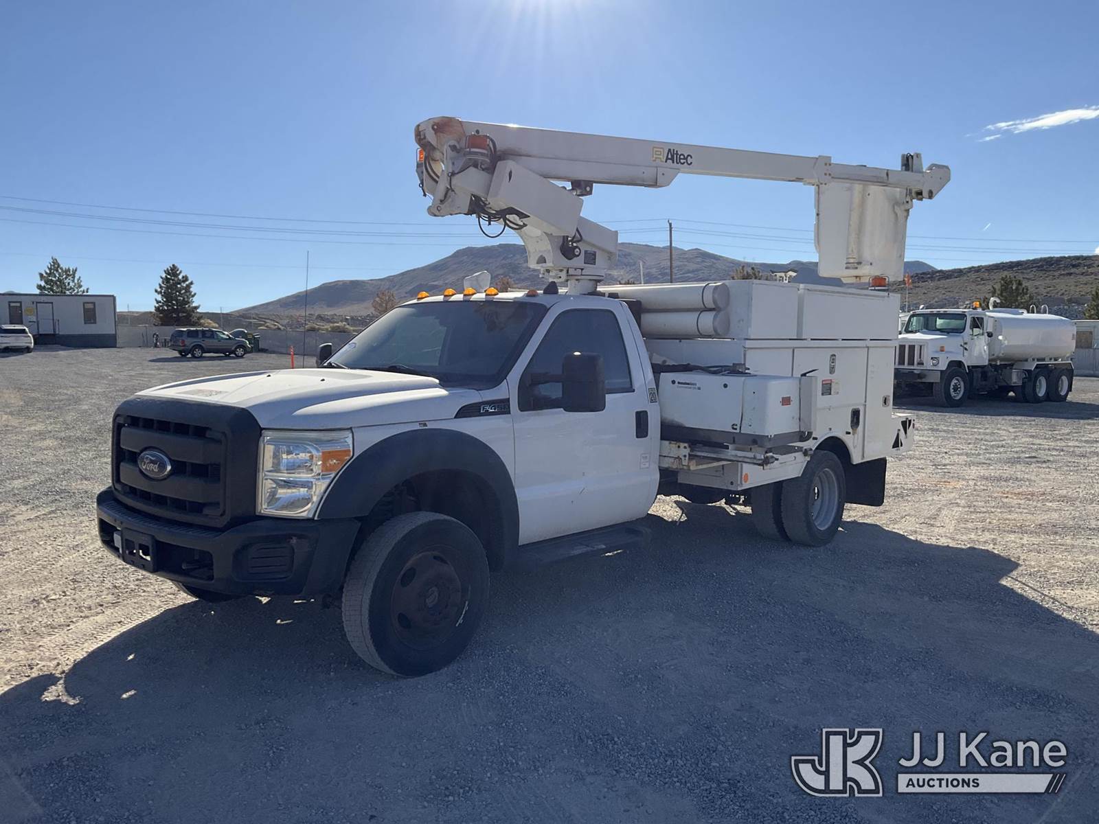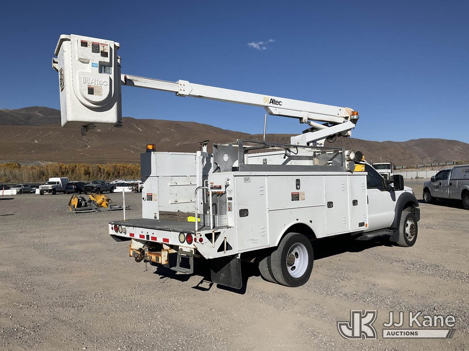 Altec AT200-A, 30 ft, Telescopic Non-Insulated Bucket Truck s/n 0712BV17735, with single man bucket, mounted behind cab on 2012 Ford F-450 SD Regular Cab DRW Service Truck, 6.8L V10 SOHC 30V Gas Auto, 4wd, A/C, with cummins onan generator, (146,368 miles) (Runs, Moves & Upper Operates) (Generator Jump to Start) This is a Titled Item NOTE: This unit is being sold AS IS/WHERE IS via Timed Auction and is located in Sparks, NV. Inspection & preview days for this unit are the 2 business days prior to the first day of items closing for this auction, item is located at 601 Britain Dr Sparks, NV 89437 and hours of operations are 8a-4p. Titles executed exactly as bidder registered. Ensure your name and/or business name and address in JJ Kane and/or ProxiBid is correct before bidding. For pre-sale questions, please contact Office Staff @ (801) 519-0123 and provide sale date and lot number. Sparks Dealer License Number DLR000052908 / OHV000052909. (Manuals provided in cab) (Buyer is responsible for removal. Assistance by consignor or JJ Kane Auctioneers is not assured.)