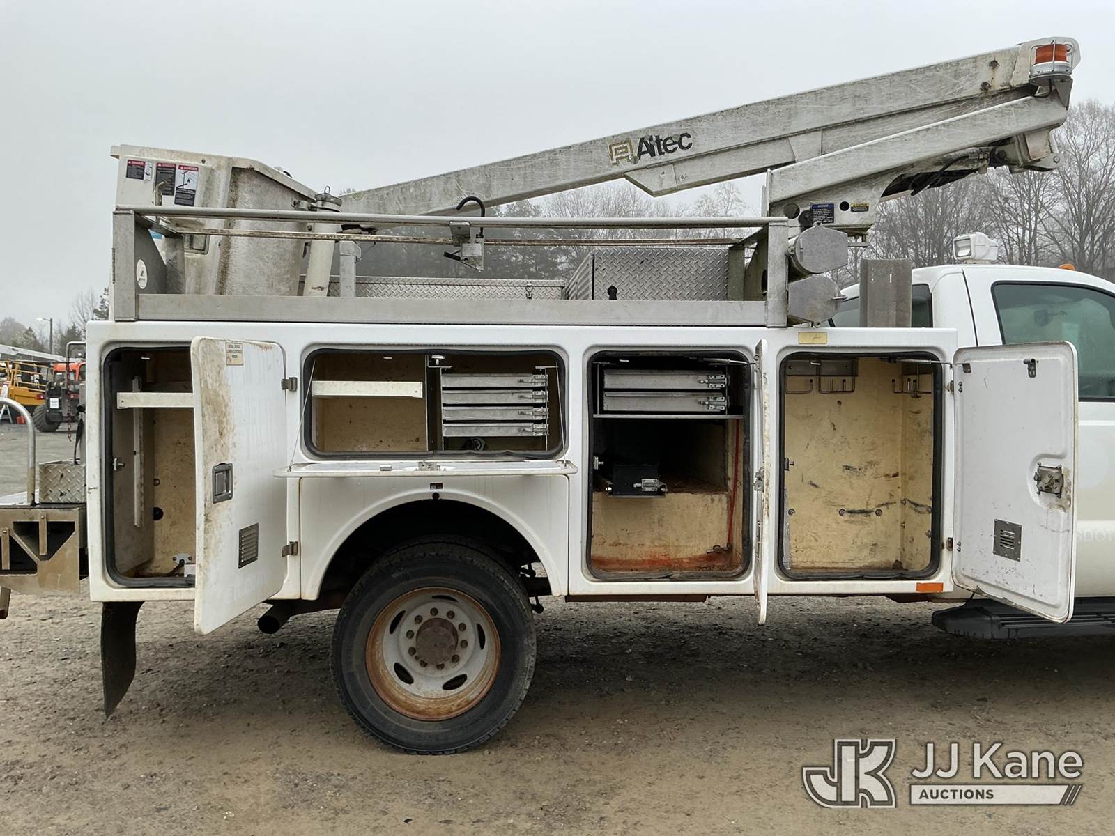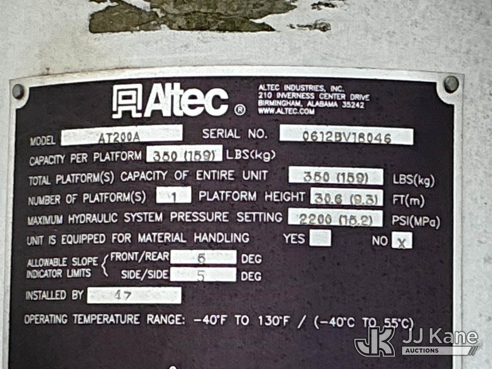 Altec AT200-A, 35 ft, Telescopic Non-Insulated Bucket Truck s/n 0612BV18046, with single man bucket , mounted behind cab on 2012 Ford F-450 Service Truck, 10-cyl gas, Auto, A/C, with Cummins Onan pony motor , (197,803 miles) (Runs & Moves) (Pony Motor Not Running Upper Condition Unknown ) This is a Titled Item NOTE: This unit is being sold AS IS/WHERE IS via Timed Auction and is located in China Grove, NC. Inspection & preview days for this unit are the 2 business days prior to the first day of items closing for this auction, item is located at 820 E NC Hwy 152 China Grove, NC 28023 and hours of operations are 8a-4p. For pre-sale questions, please contact Office Staff @ (704) 674-1113. (Manuals provided in cab) (Buyer is responsible for removal. Assistance by consignor or JJ Kane Auctions is not assured.)
