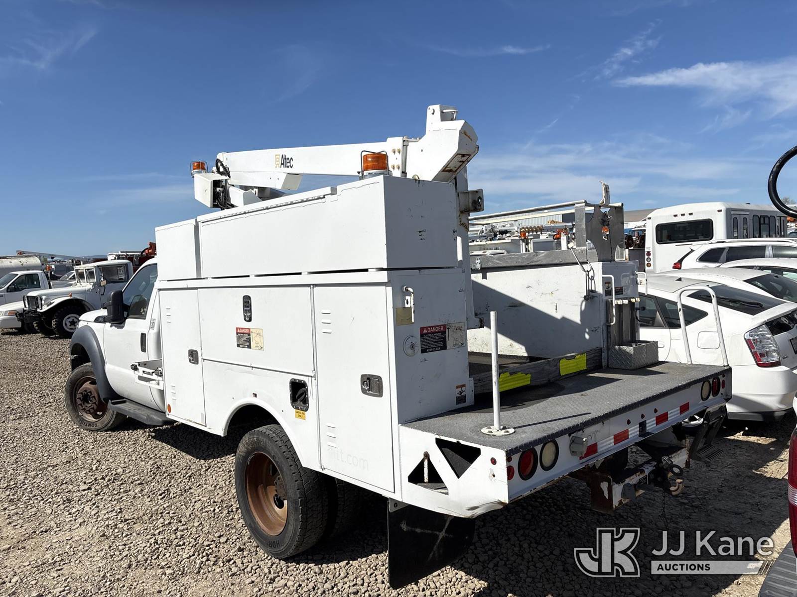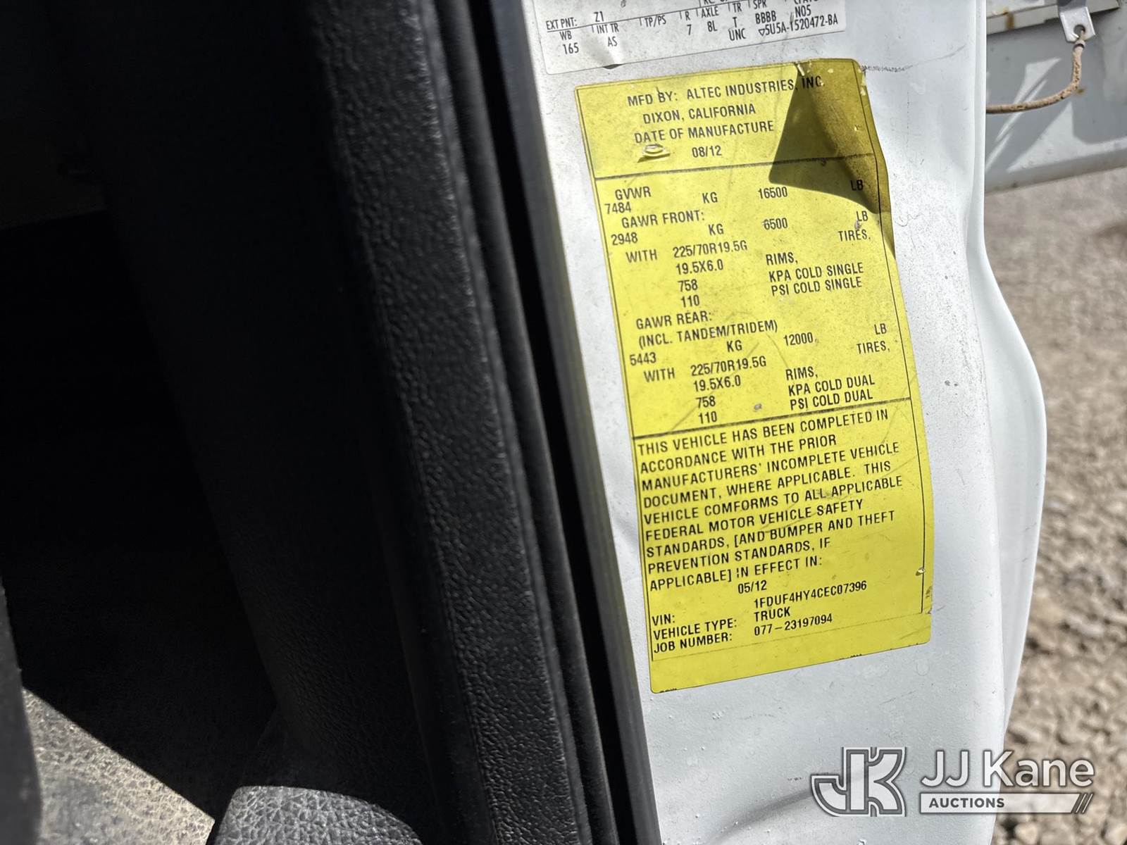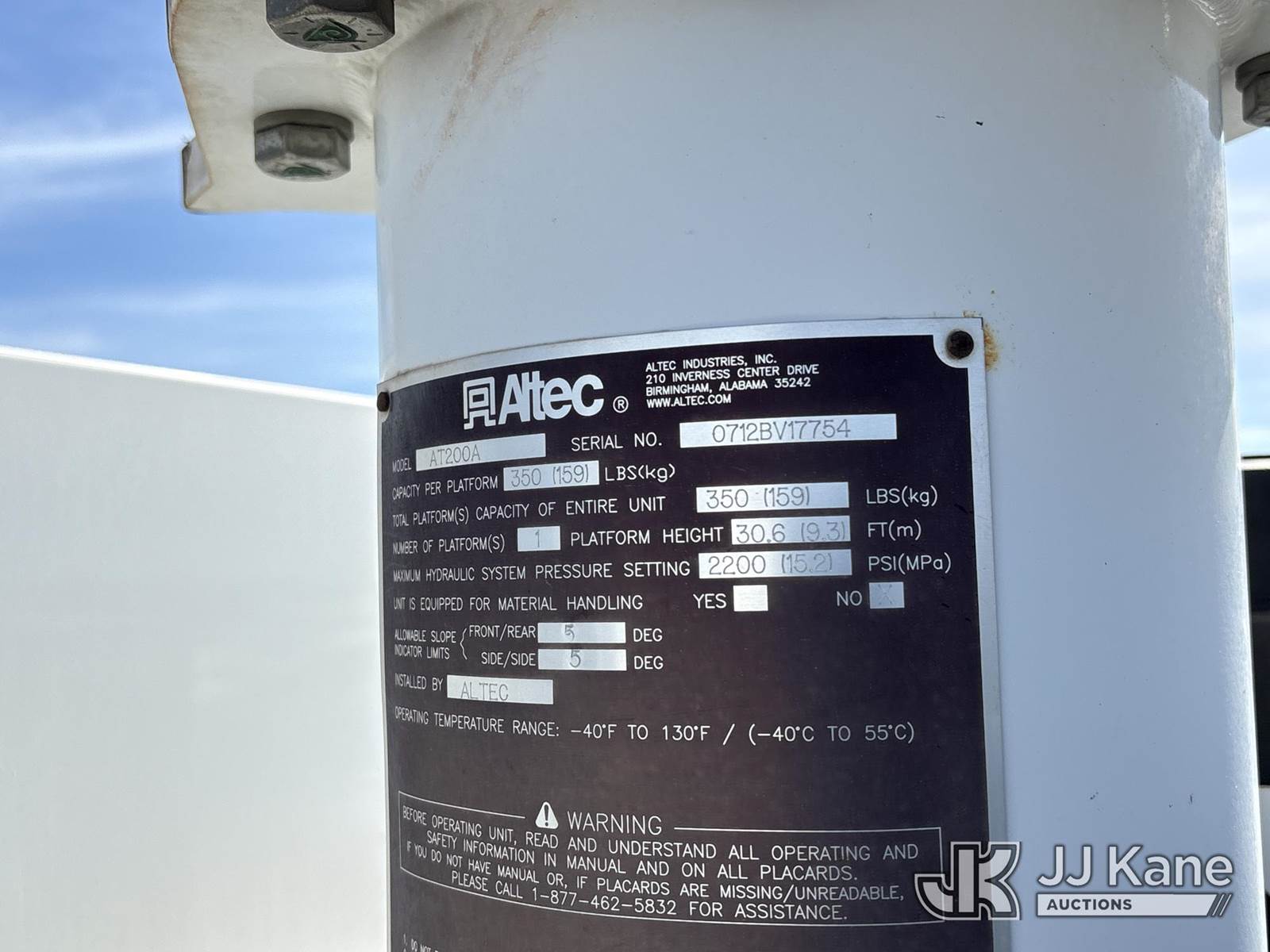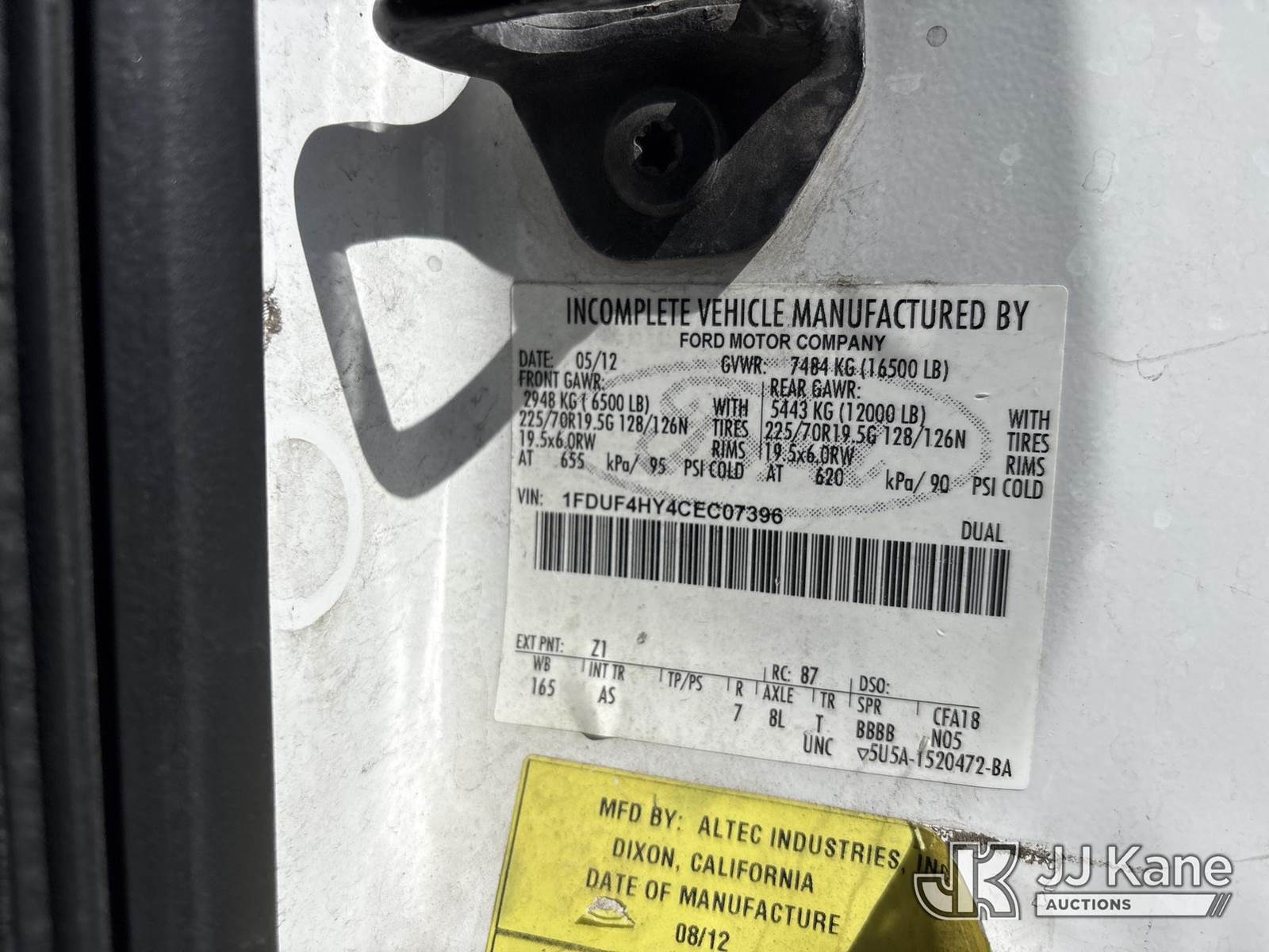 Altec AT200-A, 350 Lb 30 ft, Telescopic Non-Insulated Bucket Truck s/n 0712BV17754, mounted behind cab on 2012 Ford F-450 SD Regular Cab DRW 4WD Van Body/Service Truck, 6.8L V10 SOHC 30V 4WD, GAS, Auto, A/C, (140,263 miles) (Not Running, Steering Damaged/Disconnected, Conditions Unknown, Buyer Responsible For Manufacturer To Inspect/Repair Unit Before Use) (Bidding Restricted to Licensed Vehicle Dealers and Out of State Buyers Only), May be subject to ARB Regulations This is a Titled Item NOTE: This unit is being sold AS IS/WHERE IS via Timed Auction and is located in Dixon, CA. Inspection & preview days for this unit are the 2 business days prior to the first day of items closing for this auction, item is located at 8668 Sparling Ln Dixon, CA 95620 and hours of operations are 8a-4p. For pre-sale questions, please contact JJ Kane Staff at (707) 678-8060 (dixon@jjkane.com). Dealer License Number 45696. (Missing manuals, See Auction Company for Manufacturers Information to obtain manuals) (Buyer is responsible for removal. Assistance by consignor or JJ Kane Auctions is not assured.)
