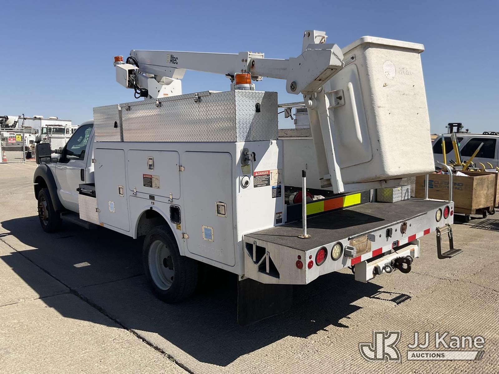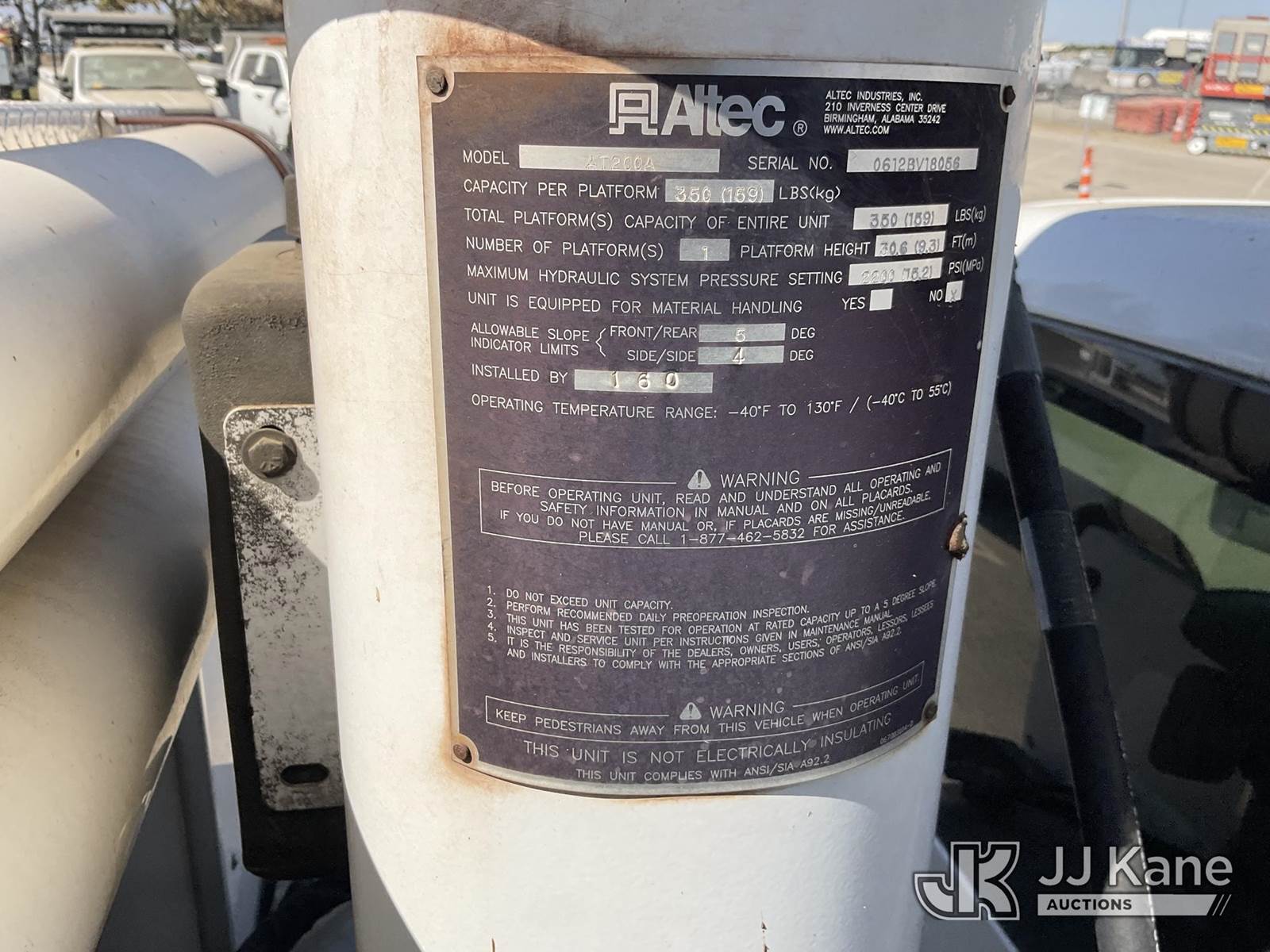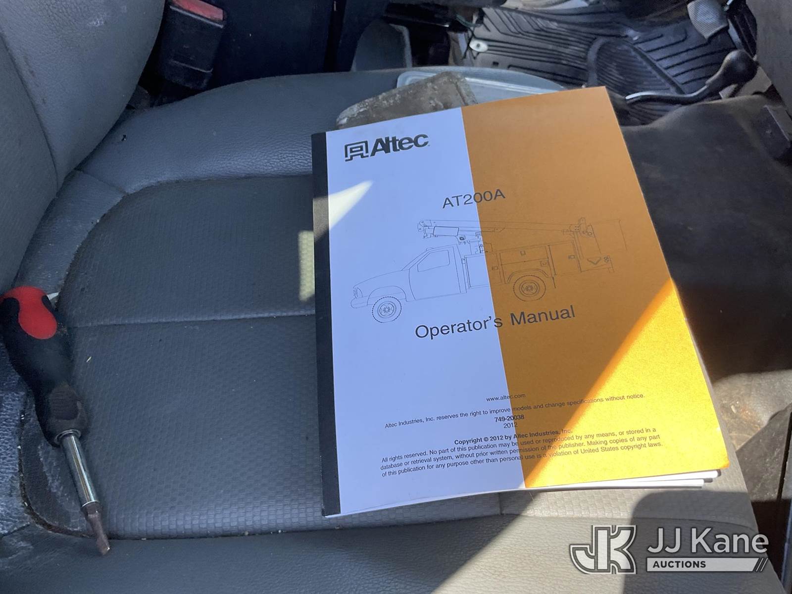Altec AT200A, 35 ft, Articulating & Telescopic Bucket s/n 0612BV18056, with single man bucket, mounted behind cab on 2012 Ford F450 4x4 Service Truck, 10-cyl gas, Auto, A/C, with tow package, (174,530 miles) (Runs & moves, Upper Condition Unknown) (Airbag Light On, Onan Generator Missing, Lower Aerial Control Box Missing,) (Bidding Restricted to Licensed Vehicle Dealers Only), This is a Titled Item NOTE: This unit is being sold AS IS/WHERE IS via Timed Auction and is located in Dixon, CA. Inspection & preview days for this unit are the 2 business days prior to the first day of items closing for this auction, item is located at 8668 Sparling Ln Dixon, CA 95620 and hours of operations are 8a-4p. For pre-sale questions, please contact JJ Kane Staff at (707) 678-8060 (dixon@jjkane.com). Dealer License Number 45696. (Manuals provided in cab) (Buyer is responsible for removal. Assistance by consignor or JJ Kane Auctioneers is not assured.)