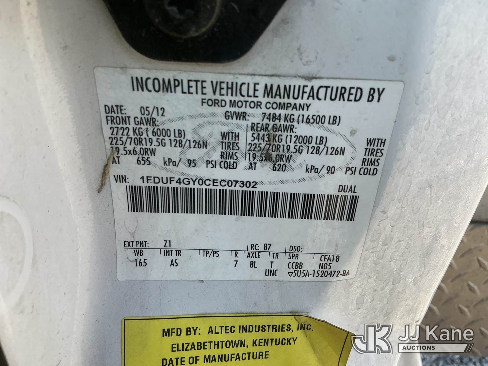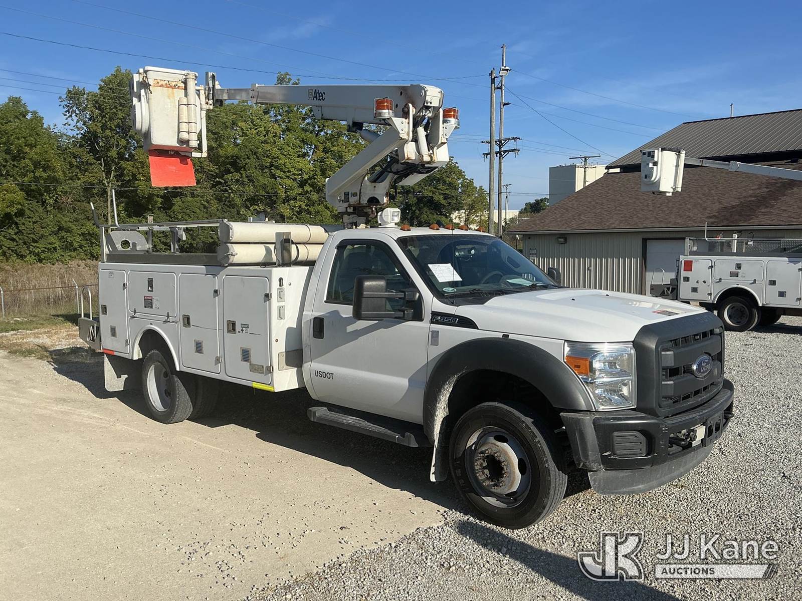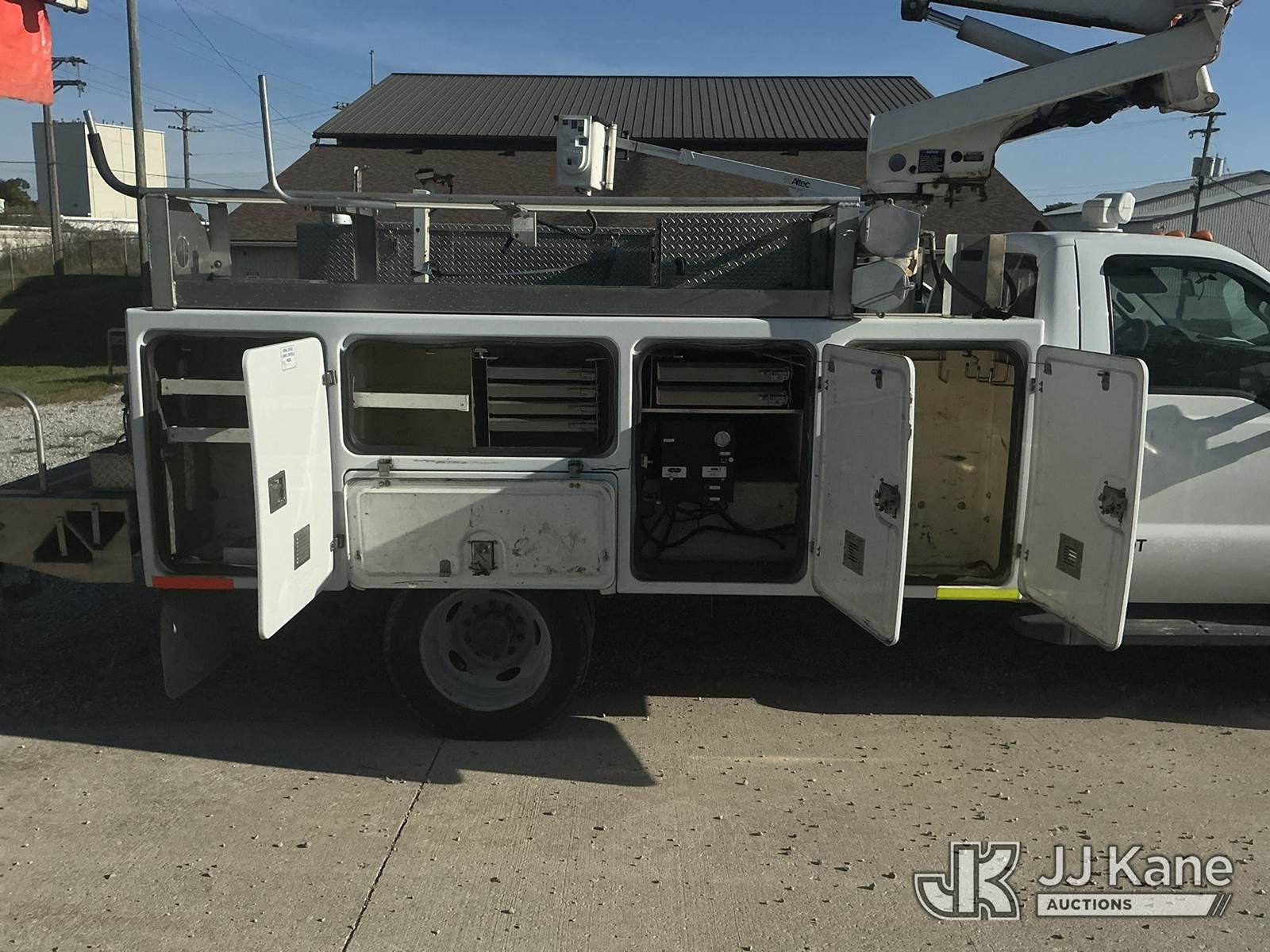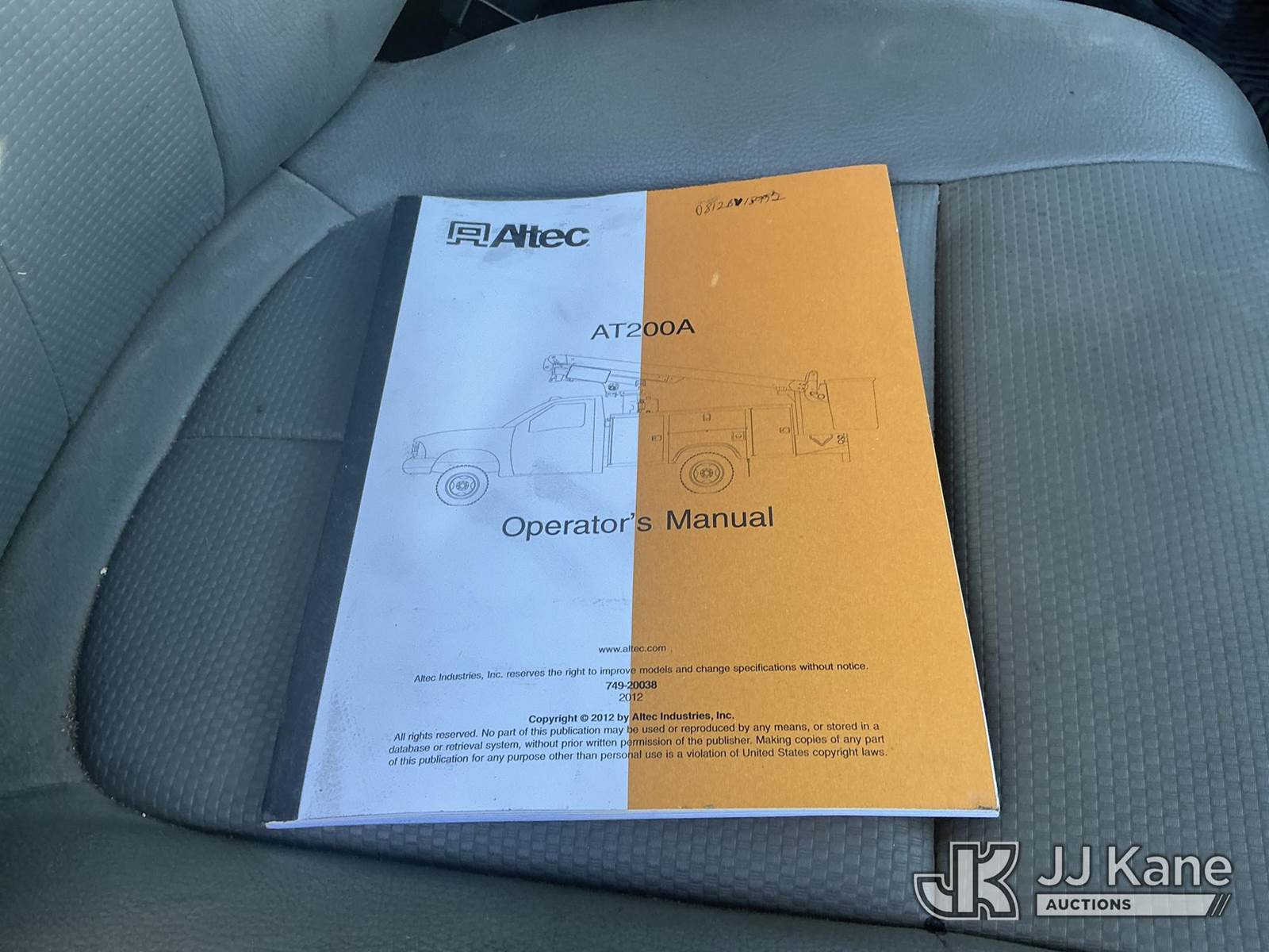Altec AT200A, 35 ft, Telescopic Non-Insulated Bucket Truck s/n 0812BV18492, with single-man bucket, mounted behind cab on 2012 Ford F450 Regular Cab DRW 2WD Service Truck, 6.8L V10 SOHC 30V Auto, gas, A/C, with Onan generator, inverter, air compressor & fiberglass body, (117,177 miles) (Runs, Moves & Upper Operates) (Body/Paint Damage) (Reads 5,229 hours) This is a Titled Item NOTE: This unit is being sold AS IS/WHERE IS via Timed Auction and is located in Fort Wayne, IN. For more information & removal arrangements please contact Office Staff @ (260) 450-9822. Load out by appointment only, Buyer/Hauler must present copy of paid invoice upon arrival. Purchaser acknowledges ALL lots must be removed within (10) business days of Auction, or a storage fee may be incurred. For load out and pick up information, please reference the hauler sheet sent out after purchase. (Manuals provided in cab) (Buyer is responsible for removal. Assistance by consignor or JJ Kane Auctioneers is not assured.)