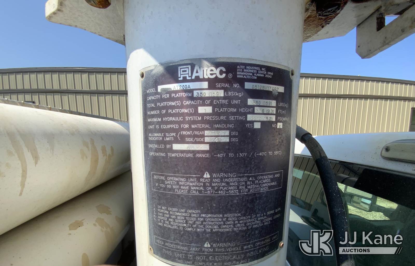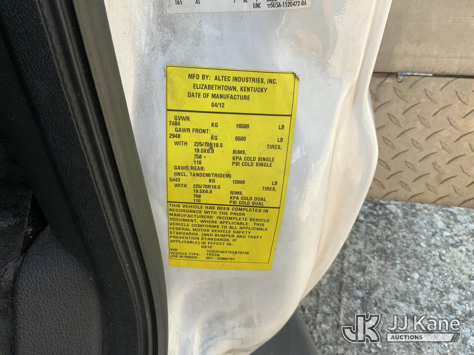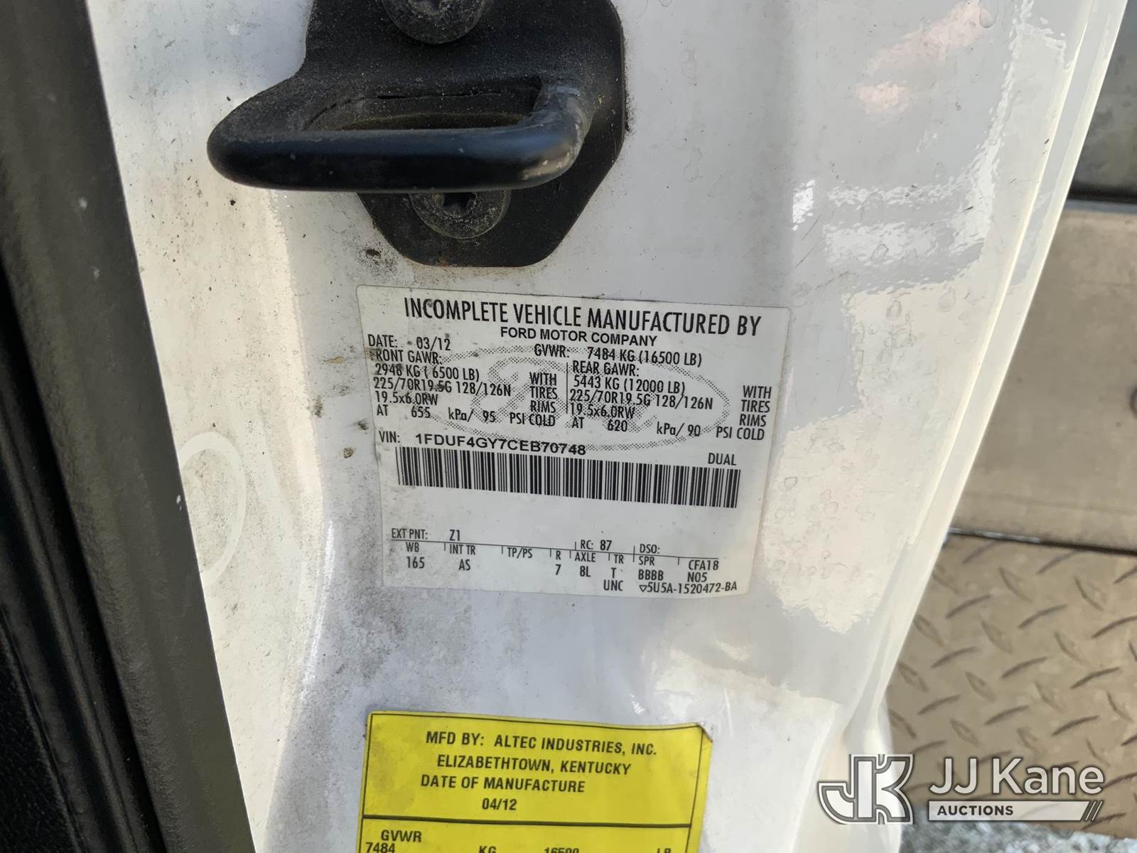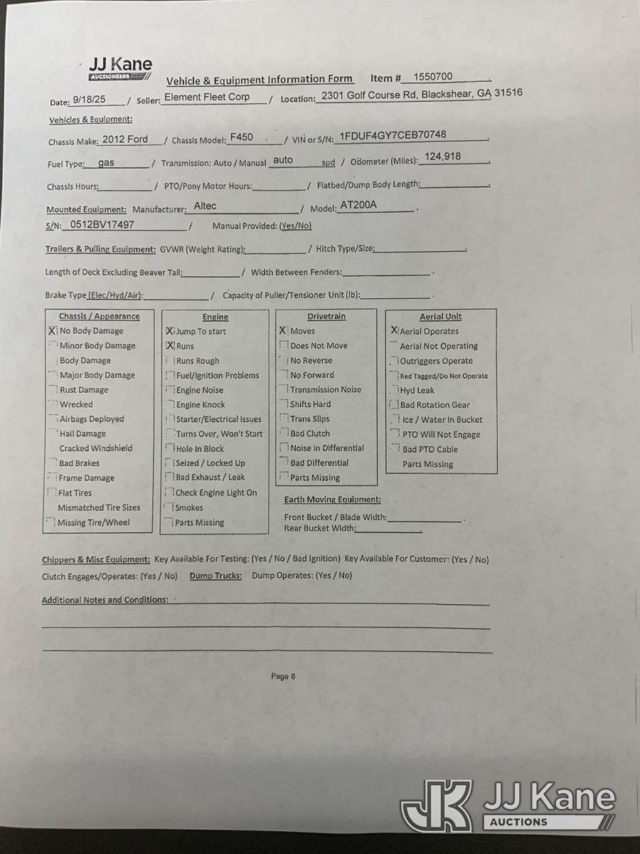 Altec AT200A, 35 ft, Telescopic Non-Insulated Bucket Truck s/n 0512BV17497, with single-man bucket, mounted behind cab on 2012 Ford F450 Service Truck, 10-cyl gas, Auto, A/C, with Cummins/Onan generator, (124,918 miles) (Runs, Moves & Upper Operates) (Jump To Start) This is a Titled Item NOTE: This unit is being sold AS IS/WHERE IS via Timed Auction and is located in Blackshear, GA. Inspection & preview days for this unit are by appointment only; please contact us at contact@jjkane.com or 84-Go-JJKane for more details. (Missing manuals, See Auction Company for Manufacturers Information to obtain manuals) (Buyer is responsible for removal. Assistance by consignor or JJ Kane Auctioneers is not assured.)
