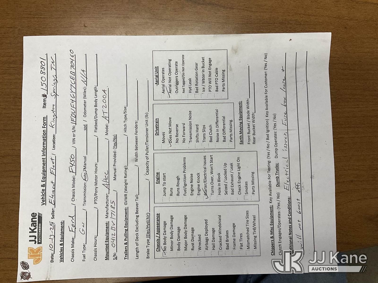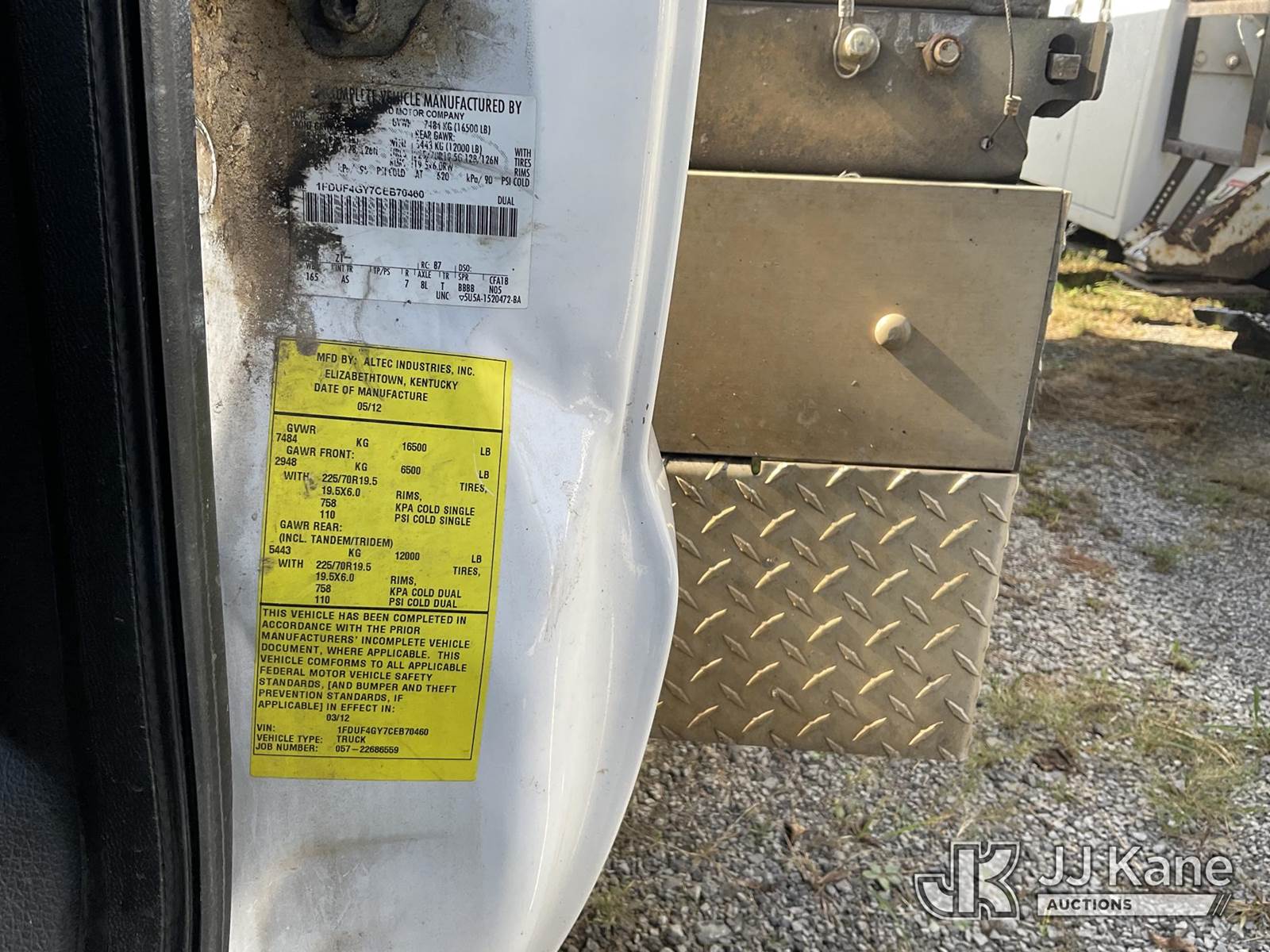 Altec AT200A, 35 ft, Telescopic Non-Insulated Bucket Truck s/n 0412BV17185, with single-man bucket, mounted behind cab on 2012 Ford F-450 SD Regular Cab DRW 2WD Service Truck, 10-cyl gas, Auto, RWD, A/C, True Mileage Unknown (Not Running, Condition Unknown, Electrical Issues, Fuse Box Loose,) This is a Titled Item NOTE: This unit is being sold AS IS/WHERE IS via Timed Auction and is located in Kingston Springs, TN. Inspection & preview days for this unit are by appointment only; please contact us at contact@jjkane.com or 84-Go-JJKane for more details. (Missing manuals, See Auction Company for Manufacturers Information to obtain manuals) (Buyer is responsible for removal. Assistance by consignor or JJ Kane Auctioneers is not assured.)
