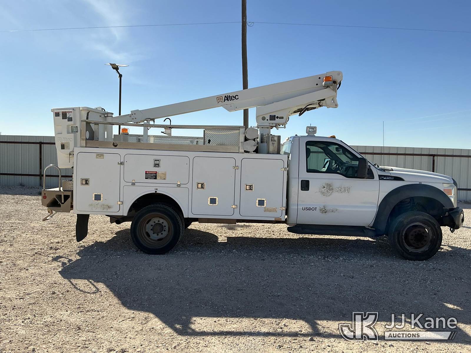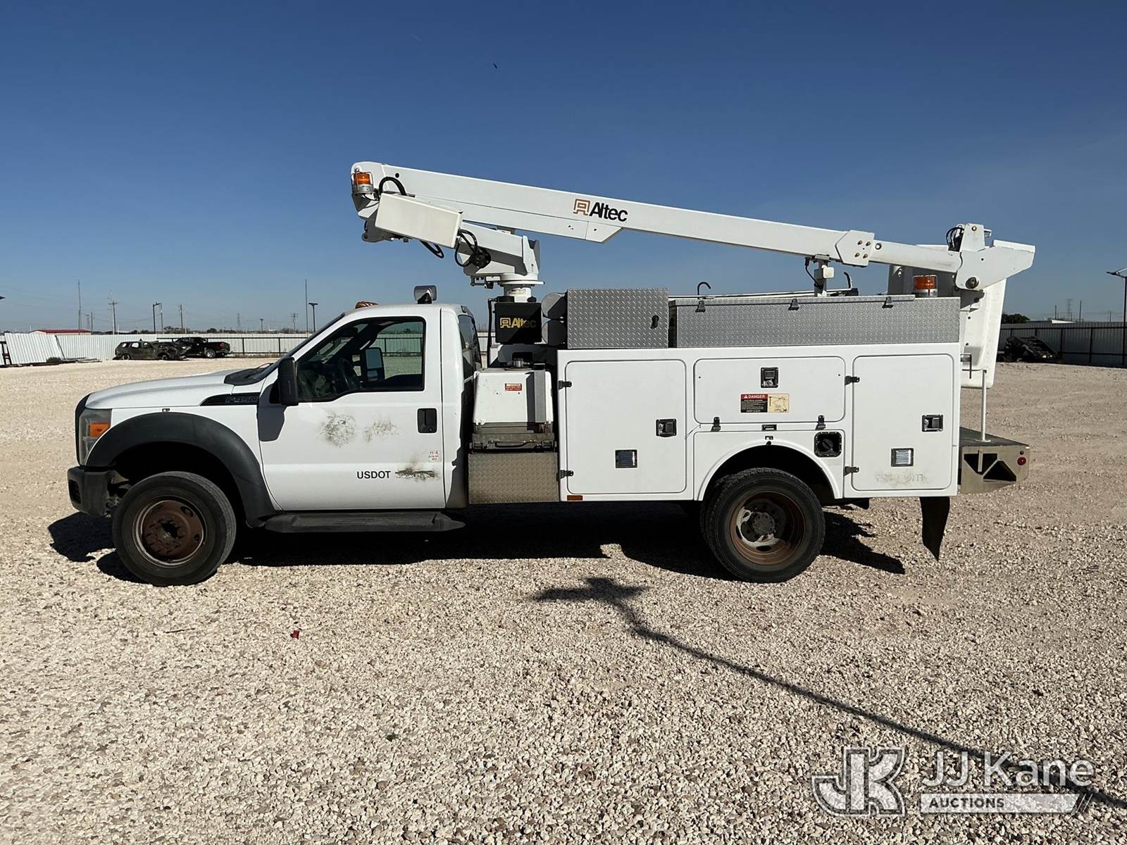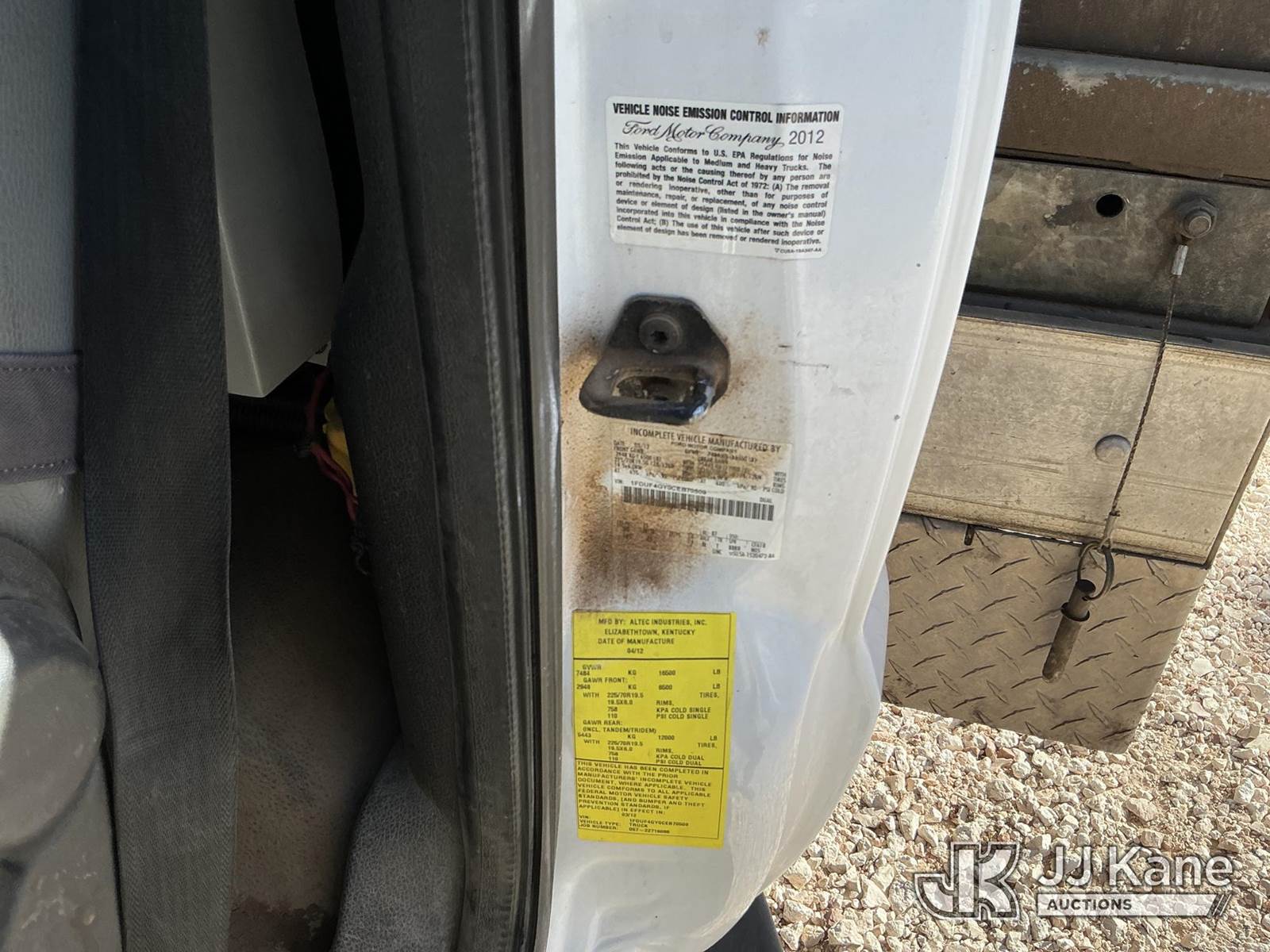 Altec AT200A, 35 ft, Telescopic Non-Insulated Bucket Truck s/n 0512BV17520, with single-man bucket, mounted behind cab on 2012 Ford F450 Service Truck, 6.8L V10 SOHC 30V gas, Auto, RWD, A/C, with Cummins Onan Generator, (144,814 miles) (Runs, Moves & Upper Operates) (Reads 14,150 hours) This is a Titled Item NOTE: This unit is being sold AS IS/WHERE IS via Timed Auction and is located in Stanton, TX. For more information & removal arrangements please contact Jeremy Walters @ jeremy.walters@jjkane.com. Load out by appointment only, Buyer/Hauler must present copy of paid invoice upon arrival. Purchaser acknowledges ALL lots must be removed within 5 business days of Auction, or a storage fee may be incurred. For load out and pick up information, please reference the release form sent out after purchase. (Manuals provided in cab) (Buyer is responsible for removal. Assistance by consignor or JJ Kane Auctions is not assured.)