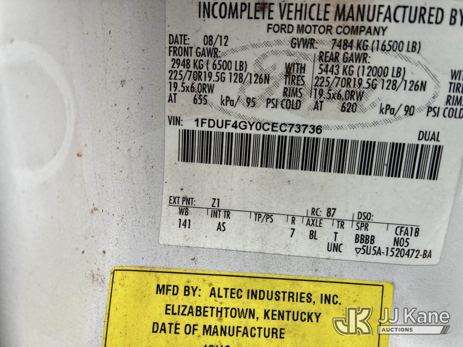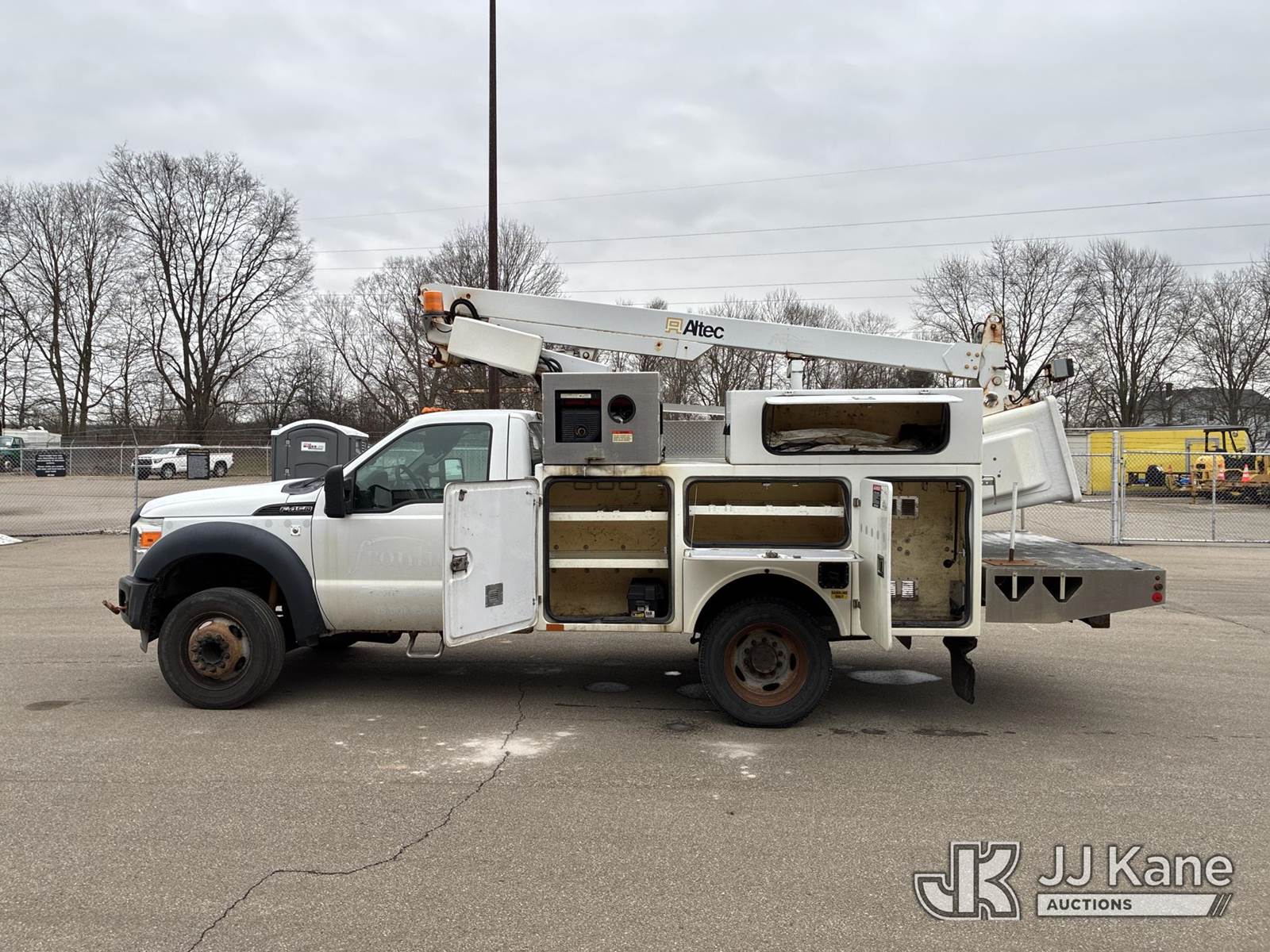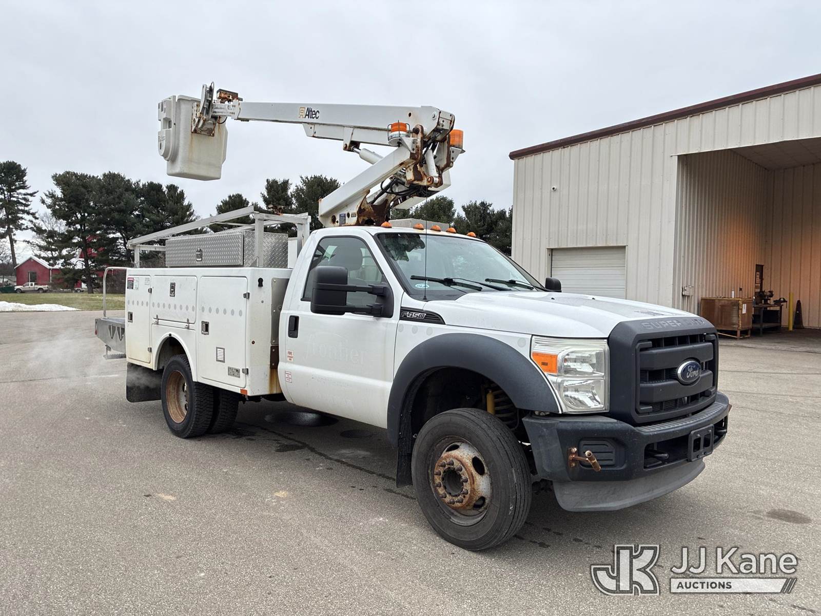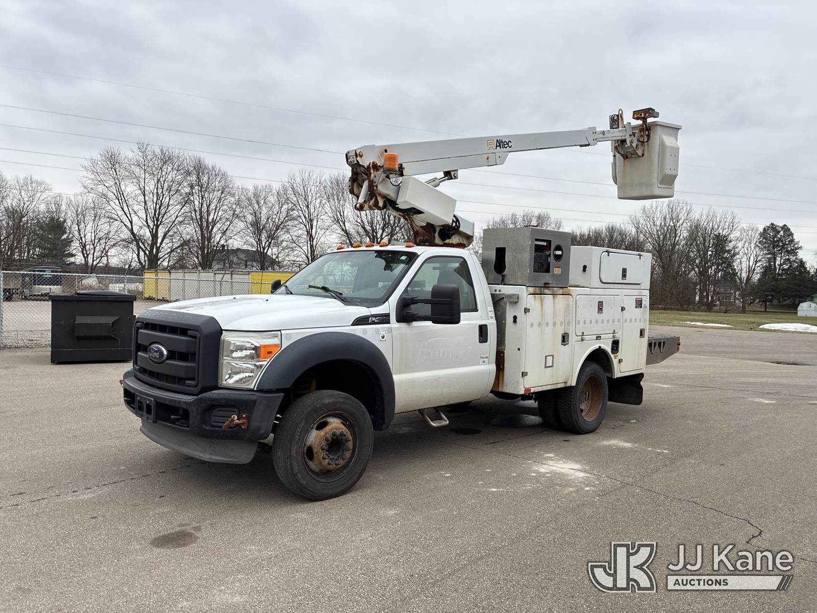 Altec AT200A, 35 ft, Telescopic Non-Insulated Bucket Truck s/n 1012BV18896, with single-man bucket, mounted behind cab on 2012 Ford F-450 SD Service Truck, 6.8L V10 SOHC 30V Auto, RWD, Gas, A/C, with Honda Generator, (187,404 miles) (Runs, Moves,& Operates) (Power Steering Noise) This is a Titled Item NOTE: This unit is being sold AS IS/WHERE IS via Timed Auction and is located in Ashland, OH. For more information & removal arrangements, please contact Jimmy Sanders @ (567) 474-5162, jimmy.sanders@jjkane.com. Load out by appointment only, Buyer/Hauler must present copy of paid invoice upon arrival. Purchaser acknowledges ALL lots must be removed within (10) Calendar days of Auction, or a storage fee may be incurred. For load-out and pick-up information, please reference the hauler sheet sent out after purchase. (Missing manuals, See Auction Company for Manufacturers Information to obtain manuals) (Buyer is responsible for removal. Assistance by consignor or JJ Kane Auctions is not assured.)
