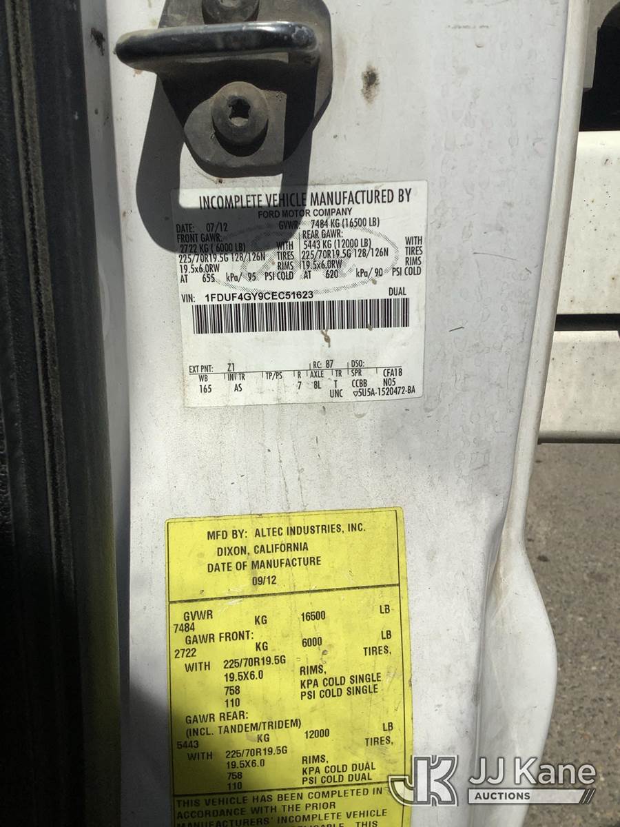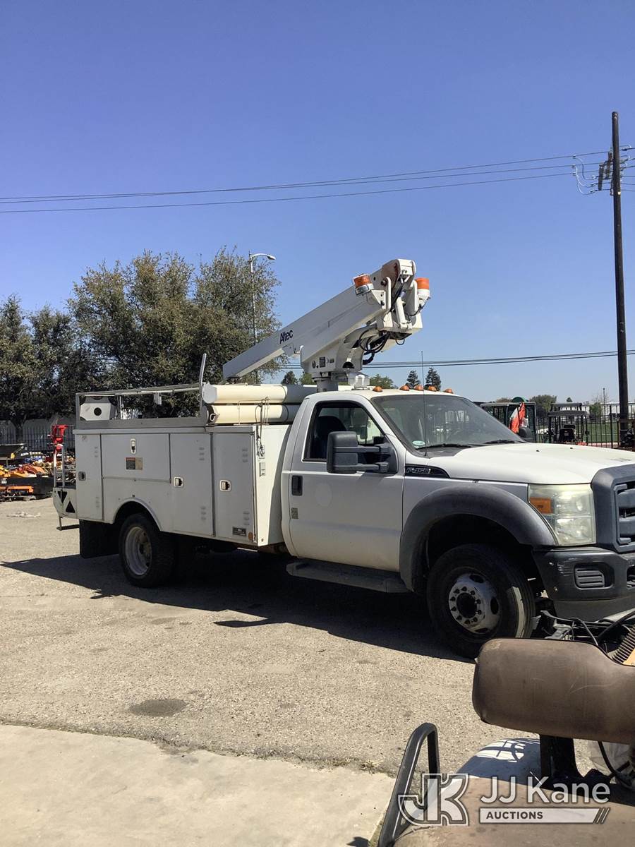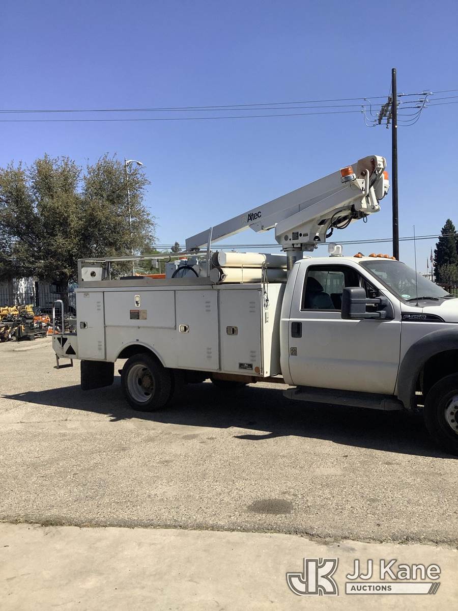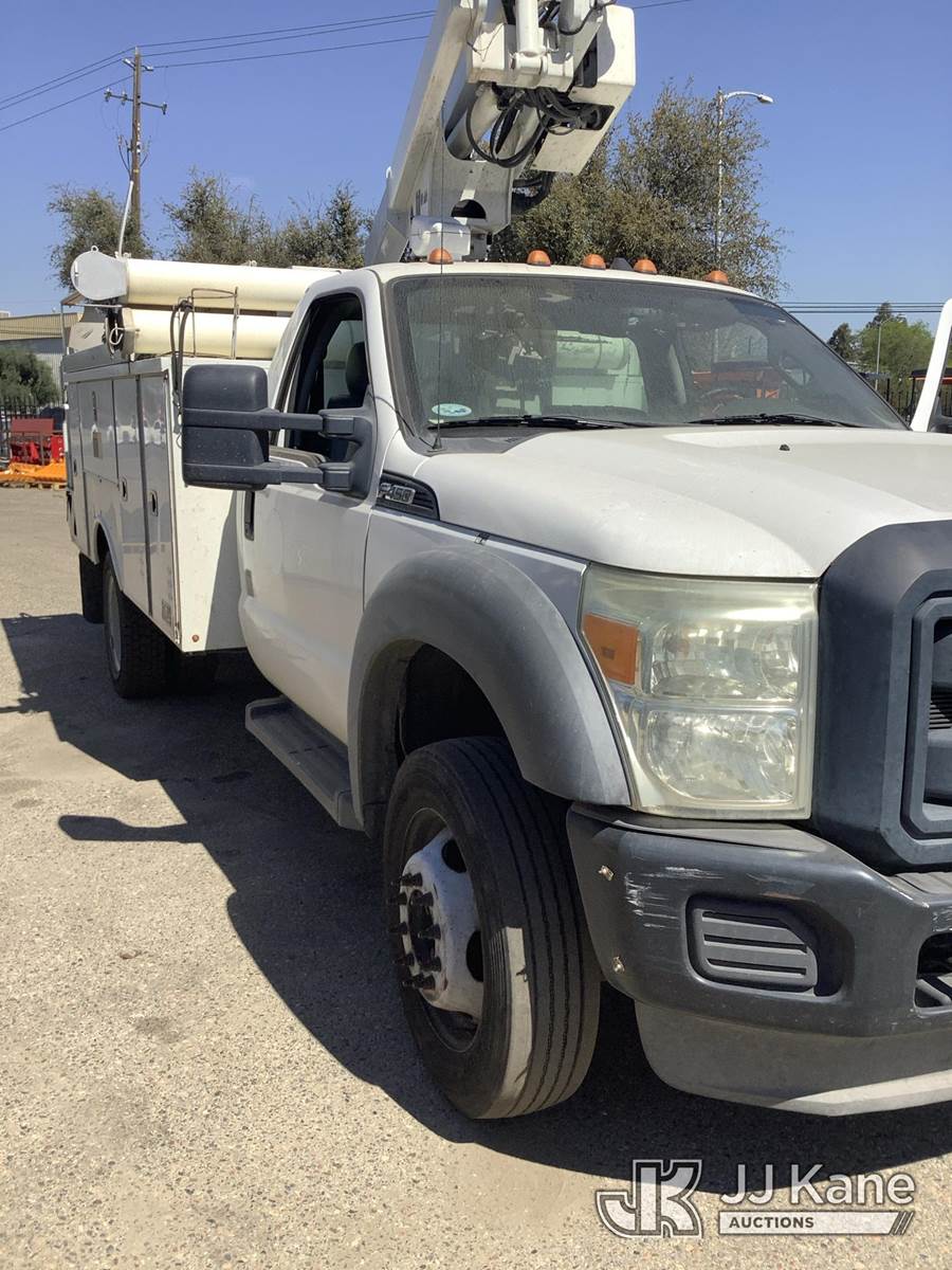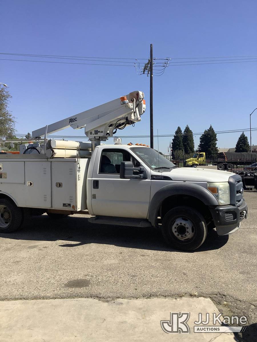 Altec AT200A, 35 ft, Telescopic Non-Insulated Bucket Truck s/n 0712BV17750, with single man bucket, mounted behind cab on 2012 Ford F-450 SD Regular Cab DRW 2WD Service Truck, 6.8L V10 SOHC 30V RWD, GAS, Auto, True Mileage Unknown Element Lease Return (**Dealer Only**(Not Running, Chassis Condition Unknown)(This item has been removed from service due to the listed safety repairs that were not completed. The safety items below must be completed by an approved OEM facility before the unit can return to service: UPPER BOOM TIP DAMAGED/CUT OFF; PLATFORM MISSING; REQUIRES ANSI INSPECTION FOR REPAIR/REPLACEMENT REQUIREMENTS, COMPLETE ANY REQUIRED TESTING AND REPAIRS AFTER INSPECTIONS ARE COMPLETED) (Bidding Restricted to Licensed Vehicle Dealers Only), This is a Titled Item NOTE: This unit is being sold AS IS/WHERE IS via Timed Auction and is located in Fresno, CA. Inspection & preview days for this unit are by appointment only; please contact us at contact@jjkane.com or 84-Go-JJKane for more details. For pre-sale questions, please contact Cesar Lua @ (707) 914-6375. (Missing manuals, See Auction Company for Manufacturers Information to obtain manuals) (Buyer is responsible for removal. Assistance by consignor or JJ Kane Auctions is not assured.)