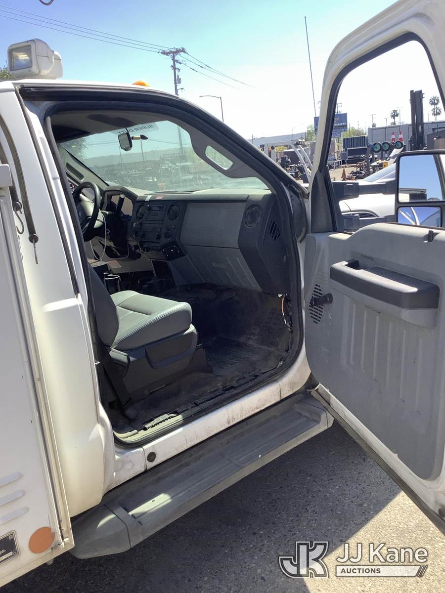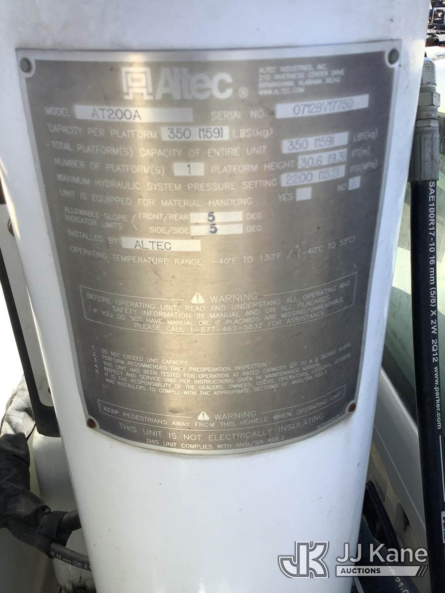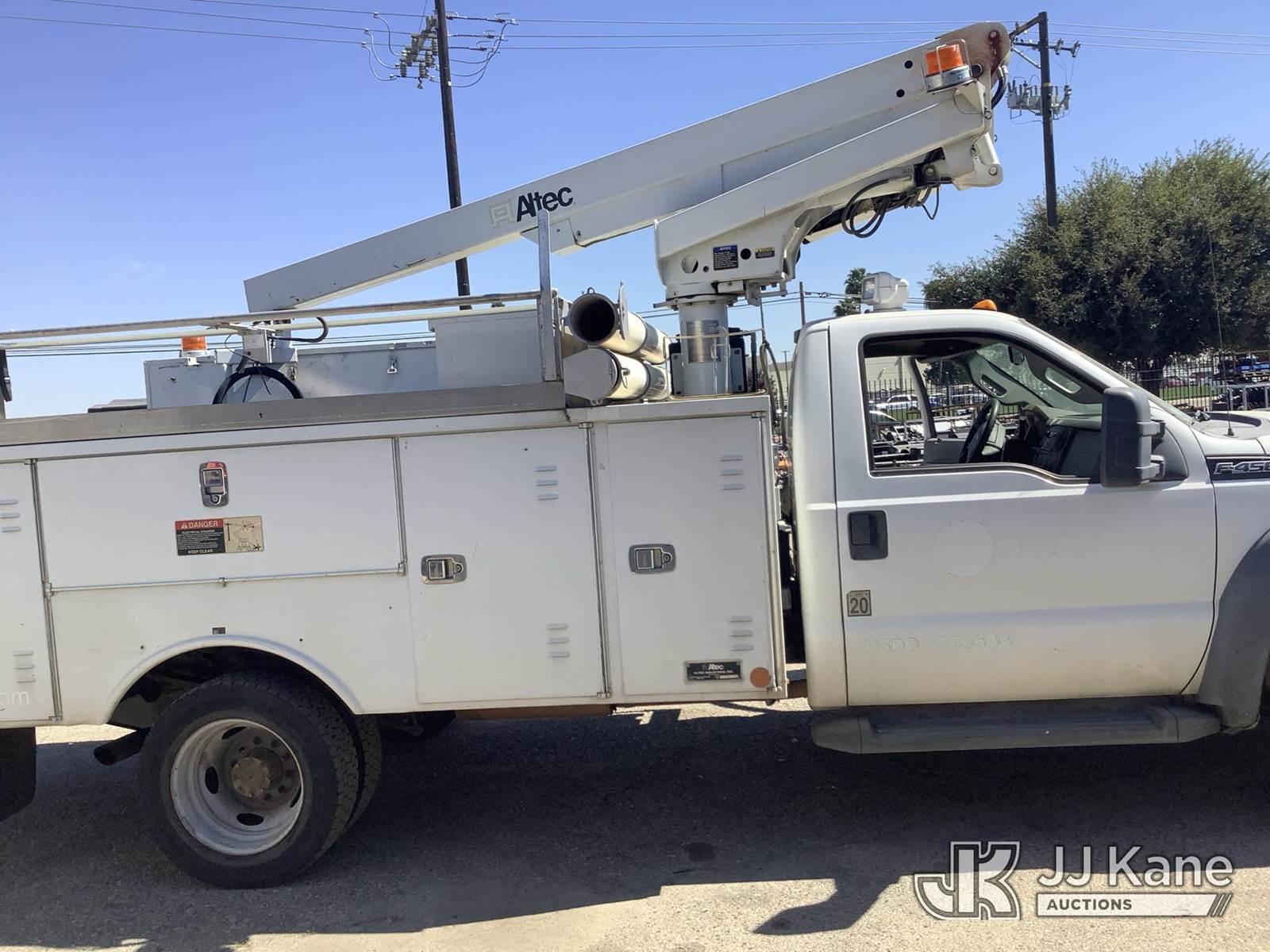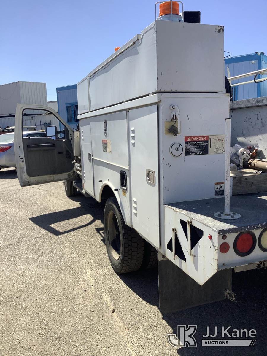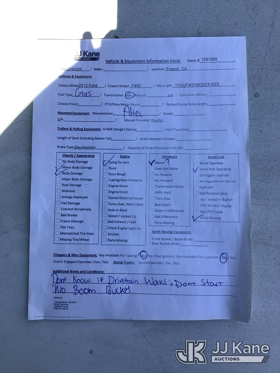 Altec AT200A, 35 ft, Telescopic Non-Insulated Bucket Truck s/n 0712BV17750, with single man bucket, mounted behind cab on 2012 Ford F-450 SD Regular Cab DRW 2WD Service Truck, 6.8L V10 SOHC 30V RWD, GAS, Auto, True Mileage Unknown Element Lease Return (**Dealer Only**(Not Running, Chassis Condition Unknown)(This item has been removed from service due to the listed safety repairs that were not completed. The safety items below must be completed by an approved OEM facility before the unit can return to service: UPPER BOOM TIP DAMAGED/CUT OFF; PLATFORM MISSING; REQUIRES ANSI INSPECTION FOR REPAIR/REPLACEMENT REQUIREMENTS, COMPLETE ANY REQUIRED TESTING AND REPAIRS AFTER INSPECTIONS ARE COMPLETED) (Bidding Restricted to Licensed Vehicle Dealers Only), This is a Titled Item NOTE: This unit is being sold AS IS/WHERE IS via Timed Auction and is located in Fresno, CA. Inspection & preview days for this unit are by appointment only; please contact us at contact@jjkane.com or 84-Go-JJKane for more details. For pre-sale questions, please contact Cesar Lua @ (707) 914-6375. (Missing manuals, See Auction Company for Manufacturers Information to obtain manuals) (Buyer is responsible for removal. Assistance by consignor or JJ Kane Auctions is not assured.)