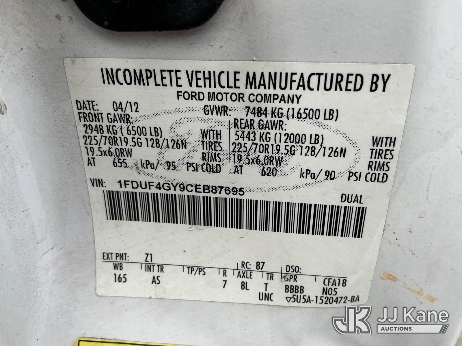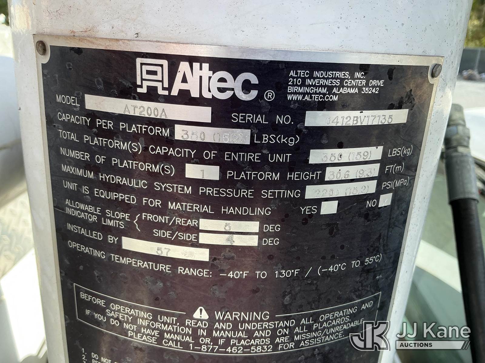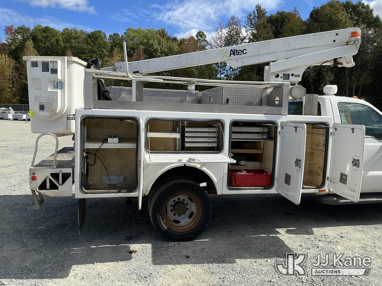 Altec AT200A, 36 ft, Articulating & Telescopic Non-Insulated Bucket Truck s/n 0412BV17135, with single-man bucket, mounted behind cab on 2012 Ford F450 Service Truck, 10-cyl gas, Auto, A/C, with Onan pony motor , (158,990 miles) (Runs, Moves ) (Jump To Start, Upper Condition Unknown, Pony Motor Not Working, Body Damage Exhaust Leak) (Remote In Key Trailer) This is a Titled Item NOTE: This unit is being sold AS IS/WHERE IS via Timed Auction and is located in China Grove, NC. Inspection & preview days for this unit are the 2 business days prior to the first day of items closing for this auction, item is located at 820 E NC Hwy 152 China Grove, NC 28023 and hours of operations are 8a-4p. For pre-sale questions, please contact Office Staff @ (704) 674-1113. (Manuals provided in cab) (Buyer is responsible for removal. Assistance by consignor or JJ Kane Auctioneers is not assured.)