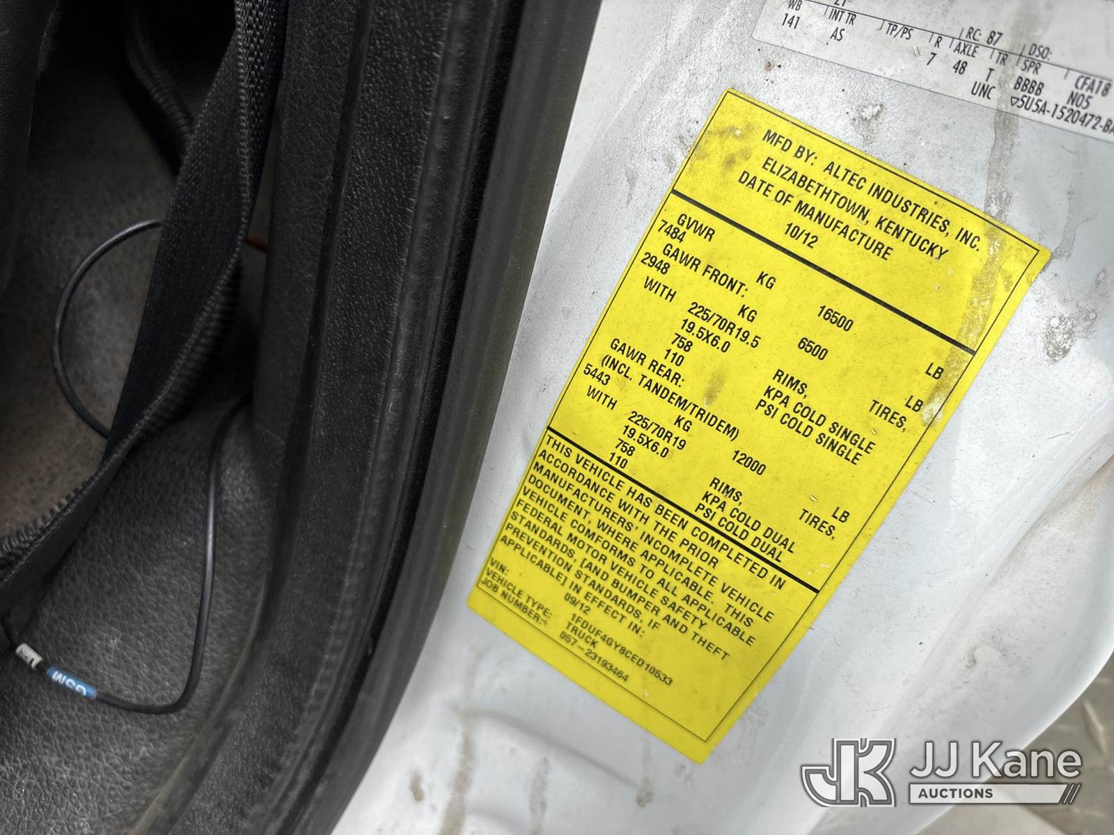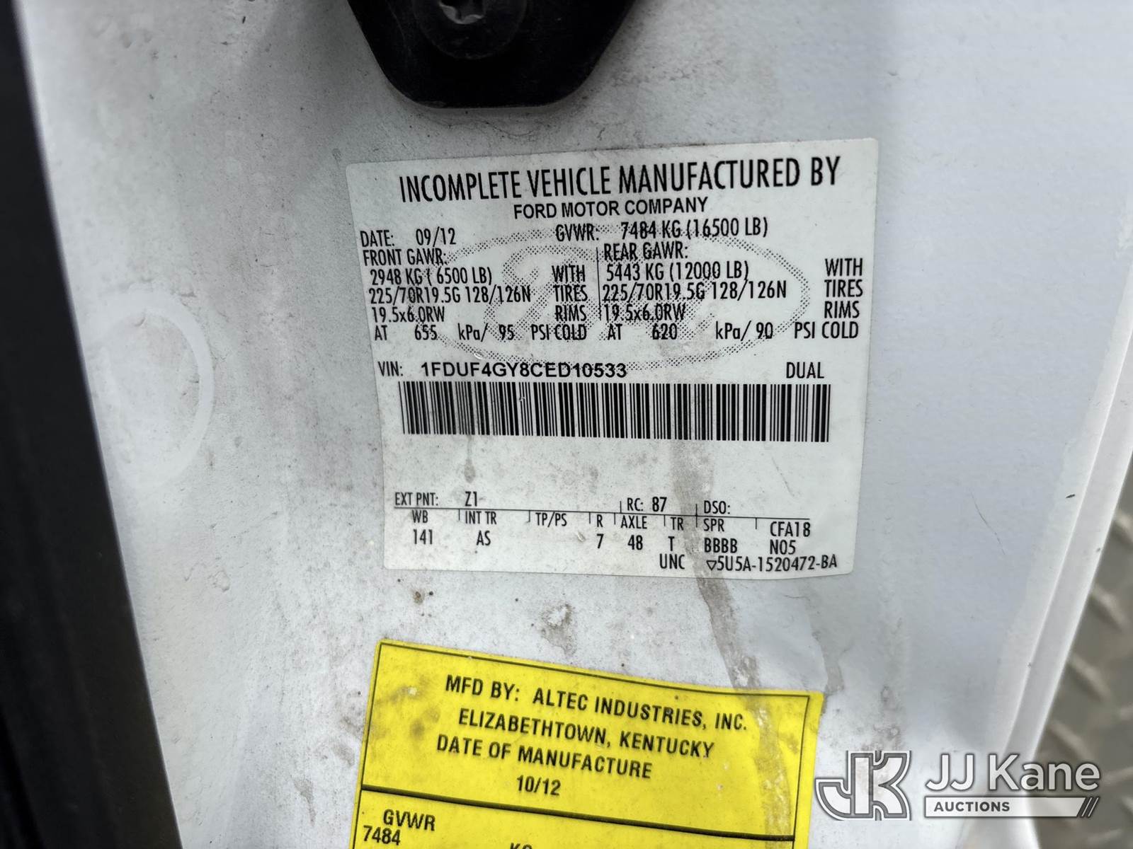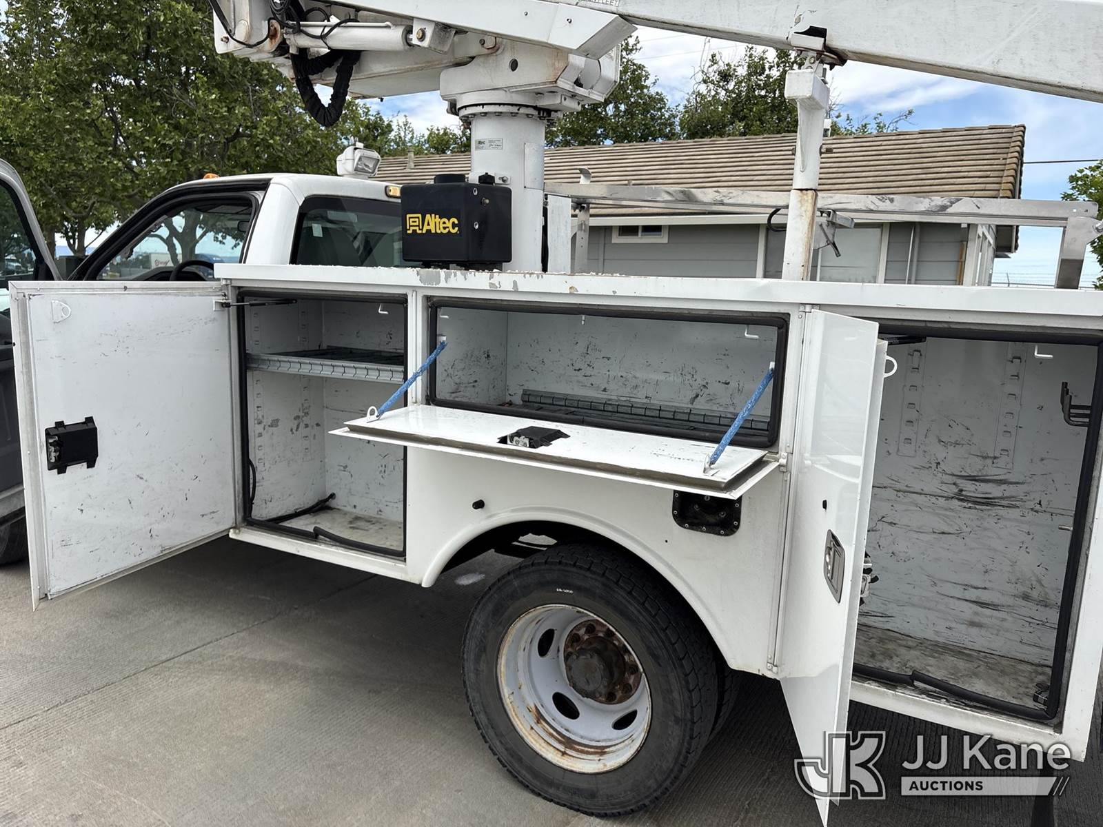 Altec AT235, 40 ft, Articulating & Telescopic Bucket Truck s/n 0912BX5500, with single-man bucket, mounted behind cab on 2012 Ford F-450 SD Regular Cab DRW 2WD Service Truck, s/n 1FDUF4GY8CED10533, 6.8L V10 SOHC 30V RWD, Gas, Auto, A/C, (140,324 miles) (Runs & Moves, Does Not Operate, Immediately Shuts Off When PTO Is Engaged, Passenger Side Windshield Damaged) (Reads 7,231 hours) This is a Titled Item NOTE: This unit is being sold AS IS/WHERE IS via Timed Auction and is located in Dixon, CA. Inspection & preview days for this unit are the 2 business days prior to the first day of items closing for this auction, item is located at 8668 Sparling Ln Dixon, CA 95620 and hours of operations are 8a-4p. For pre-sale questions, please contact JJ Kane Staff at (707) 678-8060 (dixon@jjkane.com). Dealer License Number 45696. (Missing manuals, See Auction Company for Manufacturers Information to obtain manuals) (Buyer is responsible for removal. Assistance by consignor or JJ Kane Auctions is not assured.)