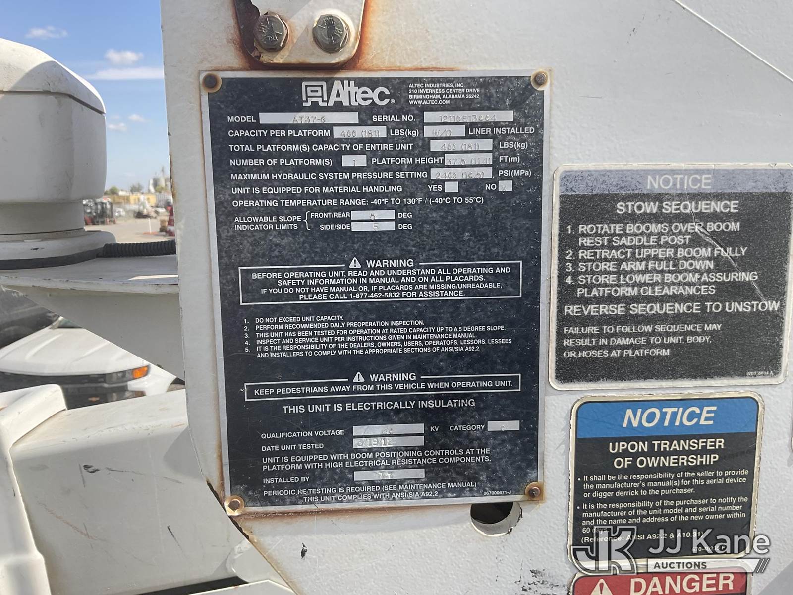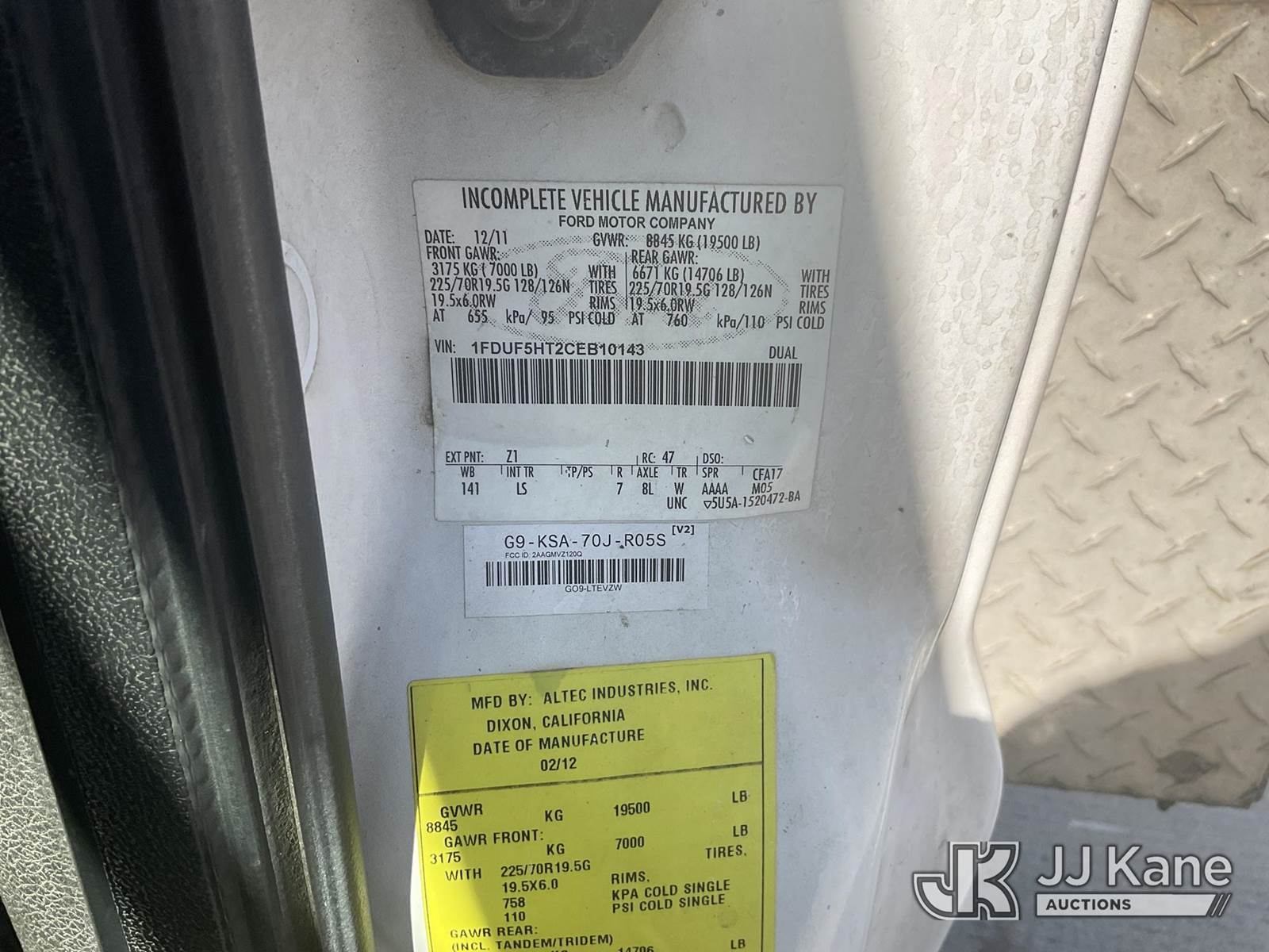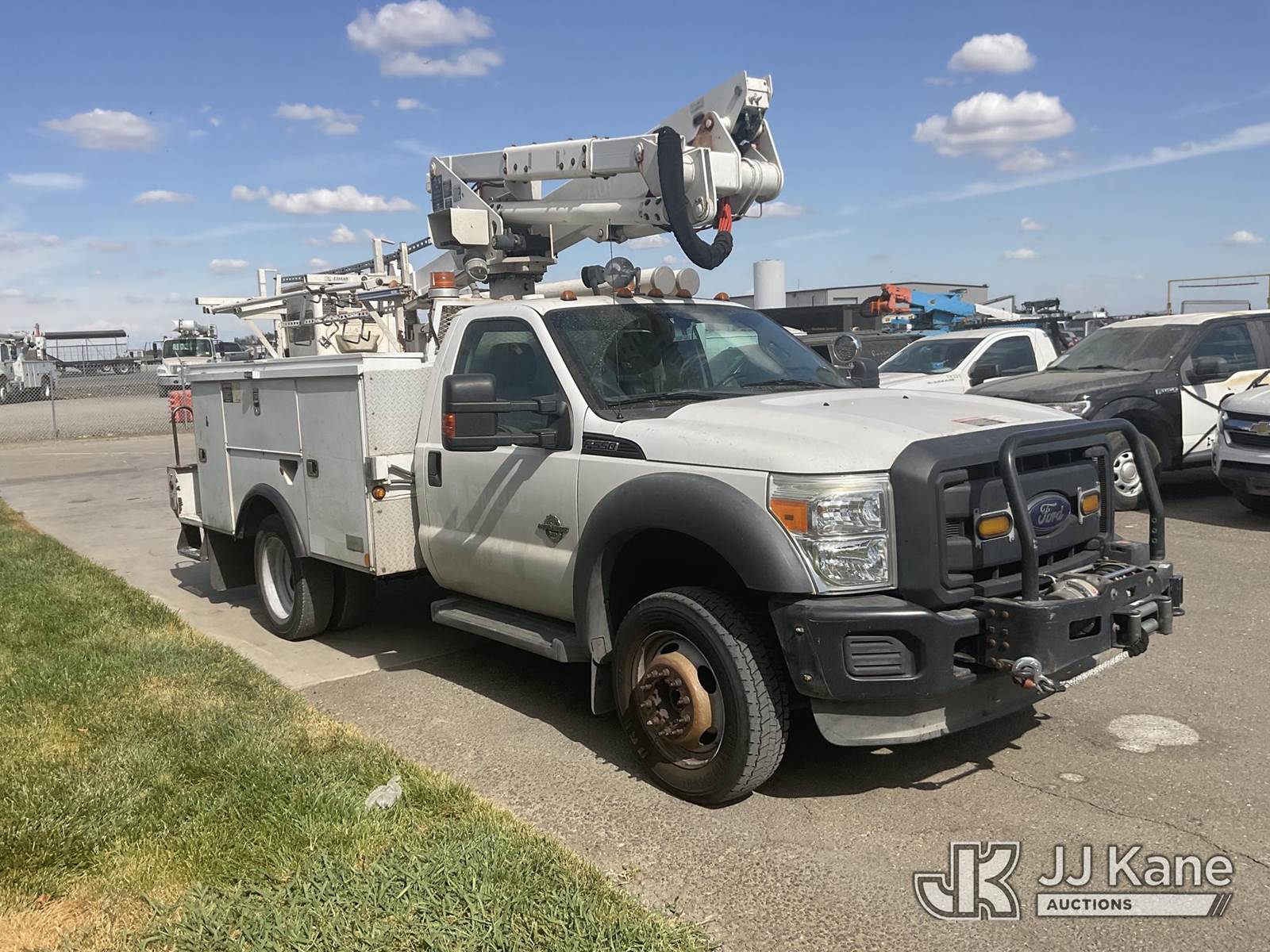 Altec AT37G, 42 ft, Articulating & Telescopic Bucket s/n 1211DE13664, with single man bucket, mounted behind cab on 2012 Ford F-550 Regular Cab DRW 4WD Service Truck, 6.7L V8 OHV 16V DIESEL Auto, A/C, (163,720 miles) (Runs & Moves) (PTO Engages-Boom Does Not Operate) May be subject to ARB Regulations This is a Titled Item NOTE: This unit is being sold AS IS/WHERE IS via Timed Auction and is located in Dixon, CA. Inspection & preview days for this unit are the 2 business days prior to the first day of items closing for this auction, item is located at 8668 Sparling Ln Dixon, CA 95620 and hours of operations are 8a-4p. For pre-sale questions, please contact JJ Kane Staff at (707) 678-8060 (dixon@jjkane.com). Dealer License Number 45696. (Manuals provided in cab) (Buyer is responsible for removal. Assistance by consignor or JJ Kane Auctioneers is not assured.)