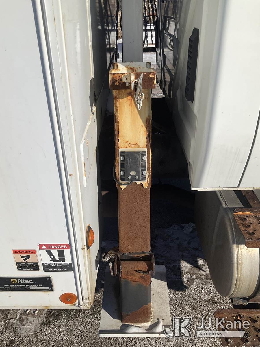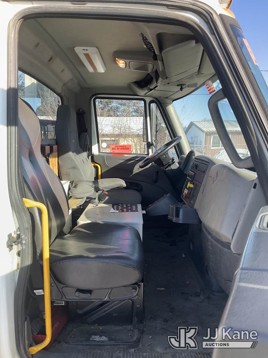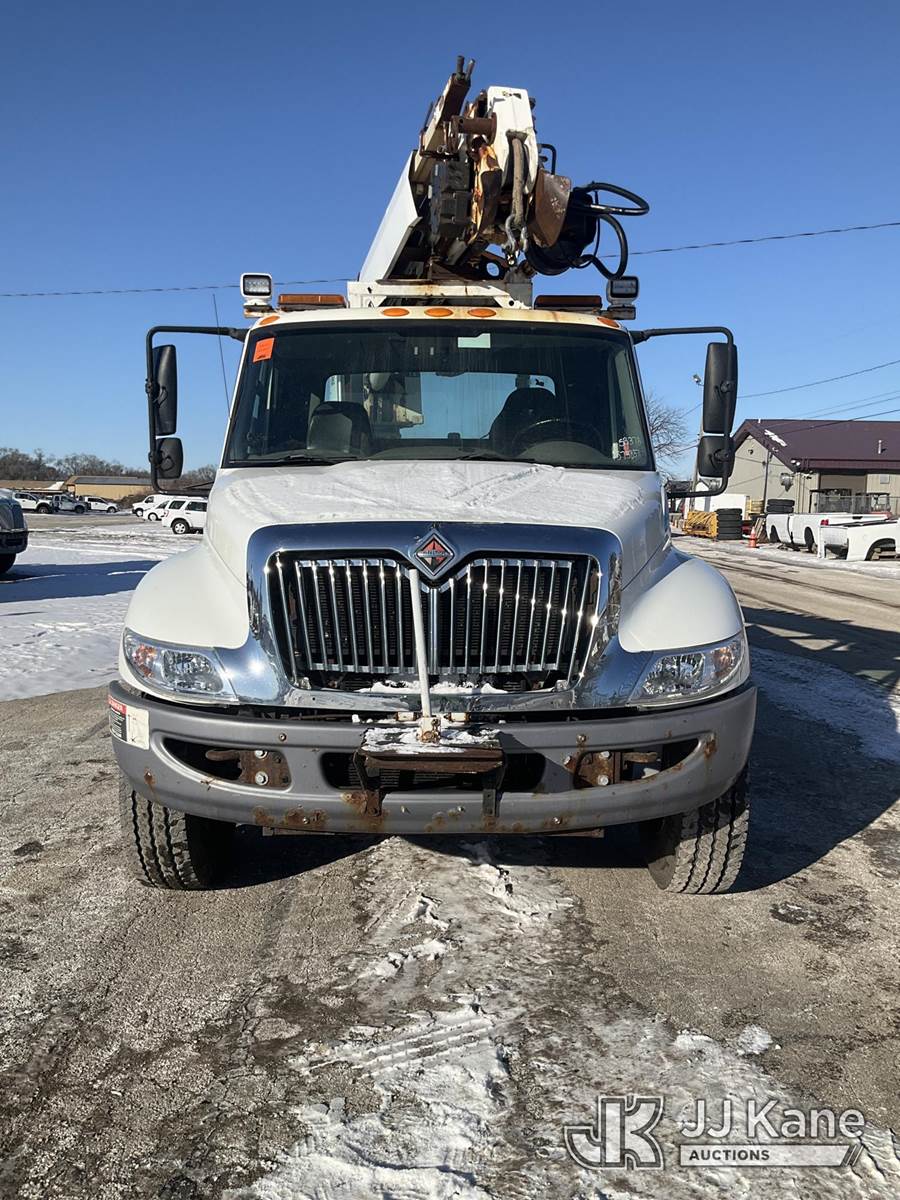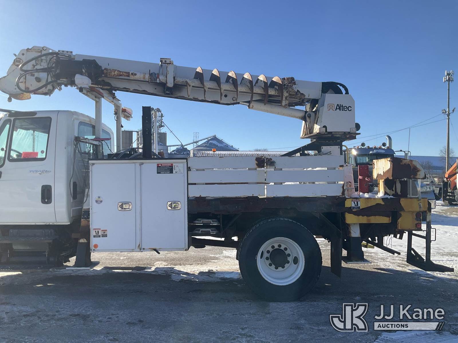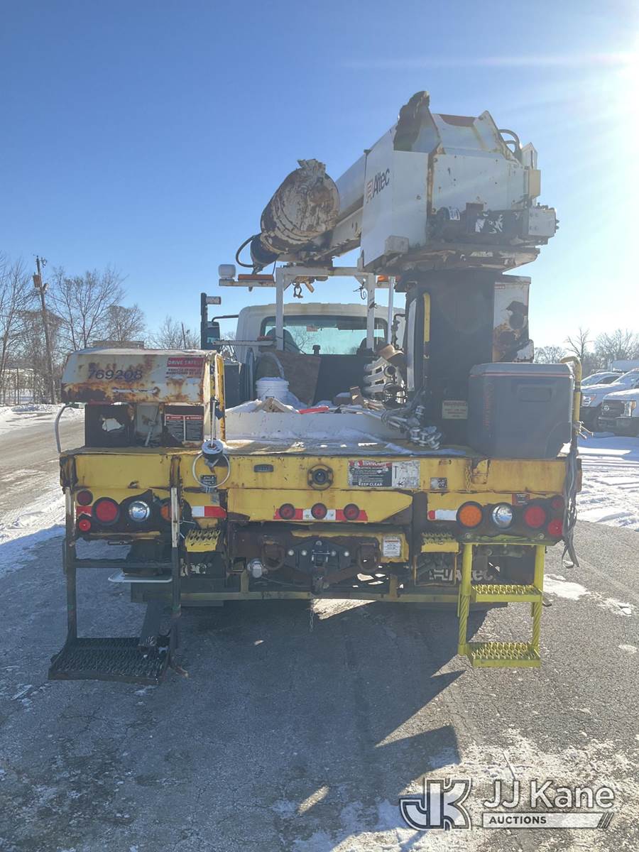 Altec DL42-BC, 21,120 Lb Digger Derrick s/n 0811DU1003, with 42ft. sheave height, 2-spd digger, heel winch, wireless remote & stand-up controls, corner mounted on 2012 International 4300 Flatbed/Utility Truck, 7.6L L6 DIESEL 4X2, DIESEL, Auto, A/C, (90,882 miles) (**Dealer Only**Runs & Moves)(Rust Damage) (Seller States: Unable To Operate Upper-Condition Unknown; Extensive Rust Damage to Frame Rail (rusted through on rear) – Requires ANSI Inspection for complete repair/replacement requirements)) (Reads 9,470 hours) (Bidding Restricted to Licensed Vehicle Dealers Only), This is a Titled Item NOTE: This unit is being sold AS IS/WHERE IS via Timed Auction and is located in South Beloit, IL. Inspection & preview days for this unit are the 2 business days prior to the first day of items closing for this auction, item is located at 14354 Dearborn Ave South Beloit, IL and hours of operations are 8a-4p. For pre-sale questions, please contact Derek Eklund at (608) 904-0618 or (derek.eklund@jjkane.com). (Manuals provided in cab) (Buyer is responsible for removal. Assistance by consignor or JJ Kane Auctions is not assured.)