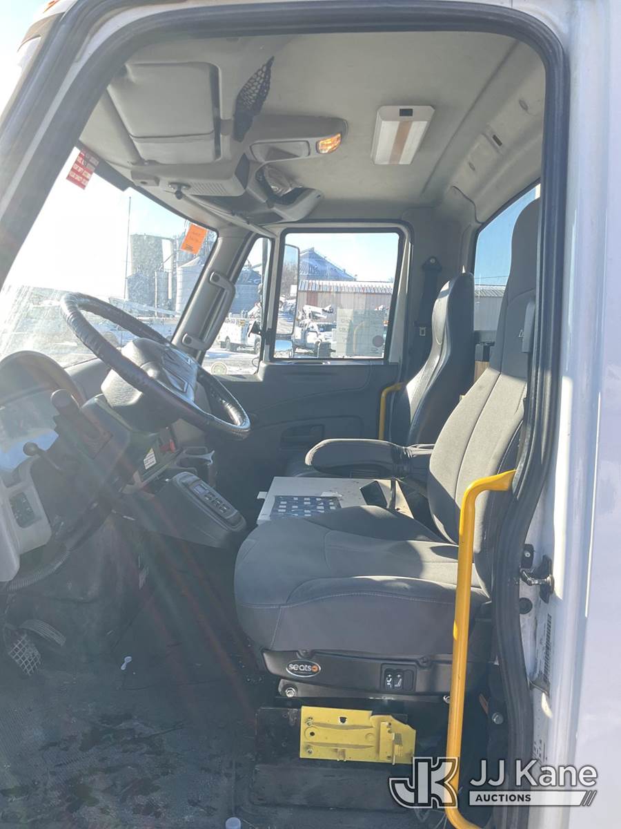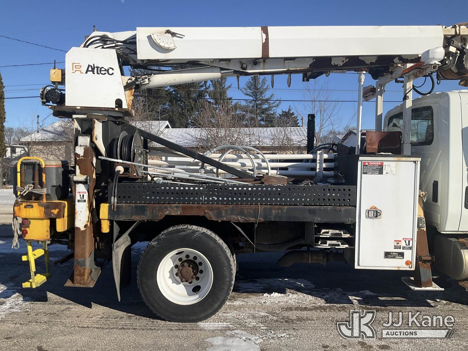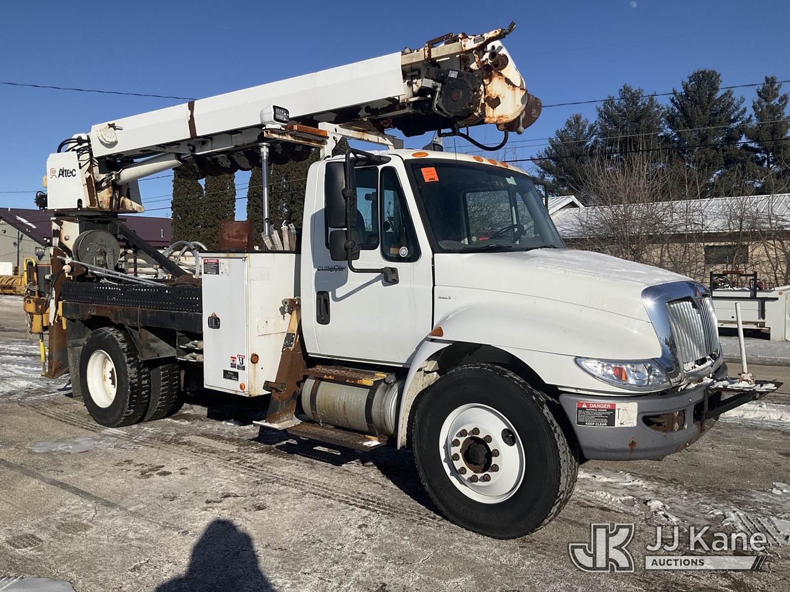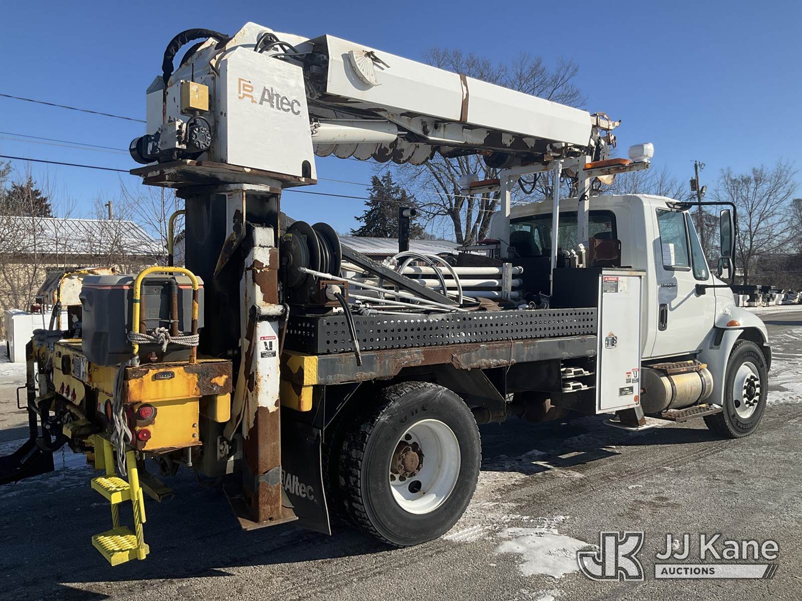 Altec DL42-BC, 21,120 Lb Digger Derrick s/n 0811DU1003, with 42ft. sheave height, 2-spd digger, heel winch, wireless remote & stand-up controls, corner mounted on 2012 International 4300 Flatbed/Utility Truck, 7.6L L6 DIESEL 4X2, DIESEL, Auto, A/C, (90,882 miles) (**Dealer Only**Runs & Moves)(Rust Damage) (Seller States: Unable To Operate Upper-Condition Unknown; Extensive Rust Damage to Frame Rail (rusted through on rear) – Requires ANSI Inspection for complete repair/replacement requirements)) (Reads 9,470 hours) (Bidding Restricted to Licensed Vehicle Dealers Only), This is a Titled Item NOTE: This unit is being sold AS IS/WHERE IS via Timed Auction and is located in South Beloit, IL. Inspection & preview days for this unit are the 2 business days prior to the first day of items closing for this auction, item is located at 14354 Dearborn Ave South Beloit, IL and hours of operations are 8a-4p. For pre-sale questions, please contact Derek Eklund at (608) 904-0618 or (derek.eklund@jjkane.com). (Manuals provided in cab) (Buyer is responsible for removal. Assistance by consignor or JJ Kane Auctions is not assured.)
