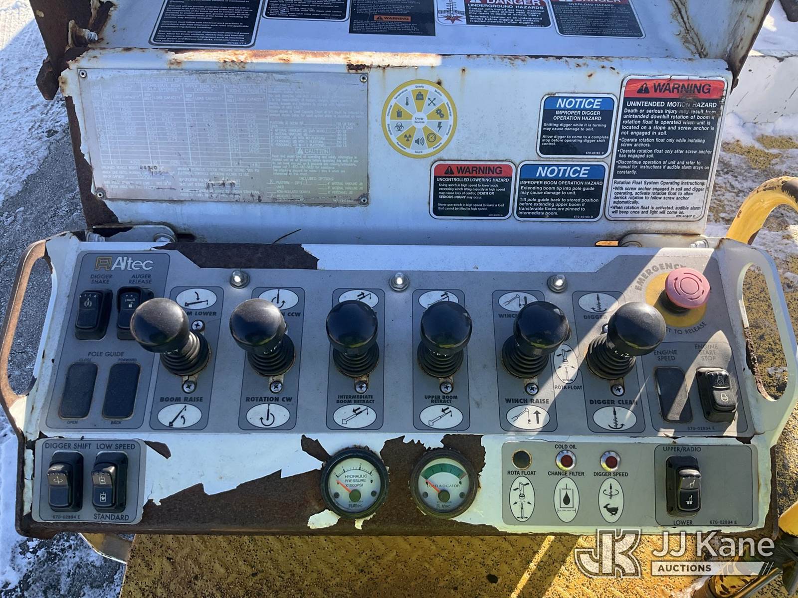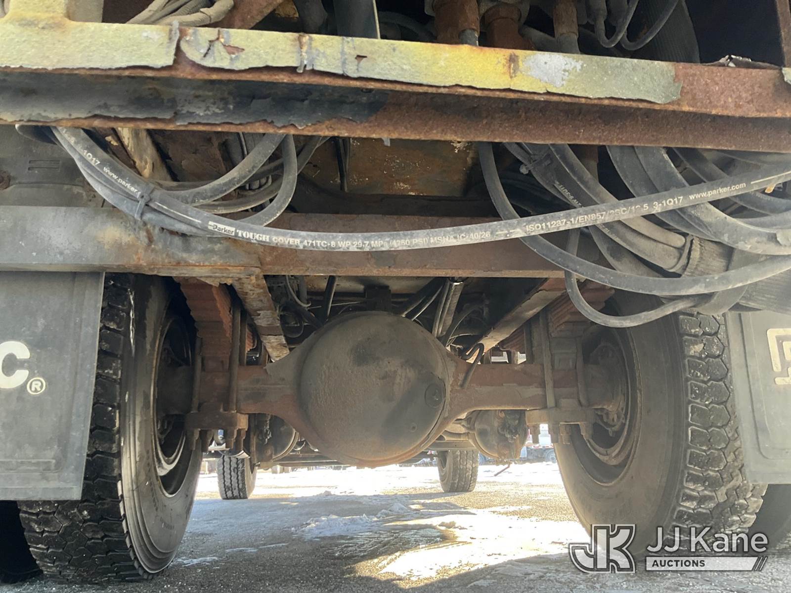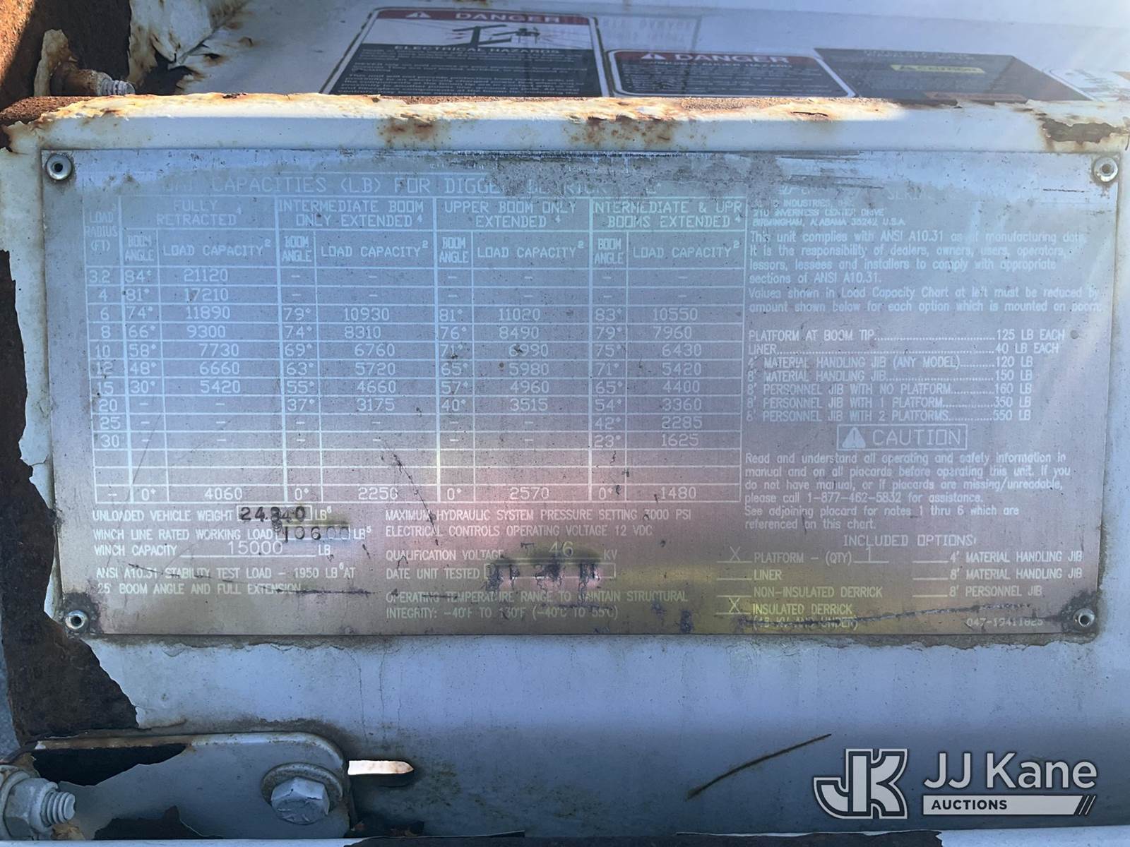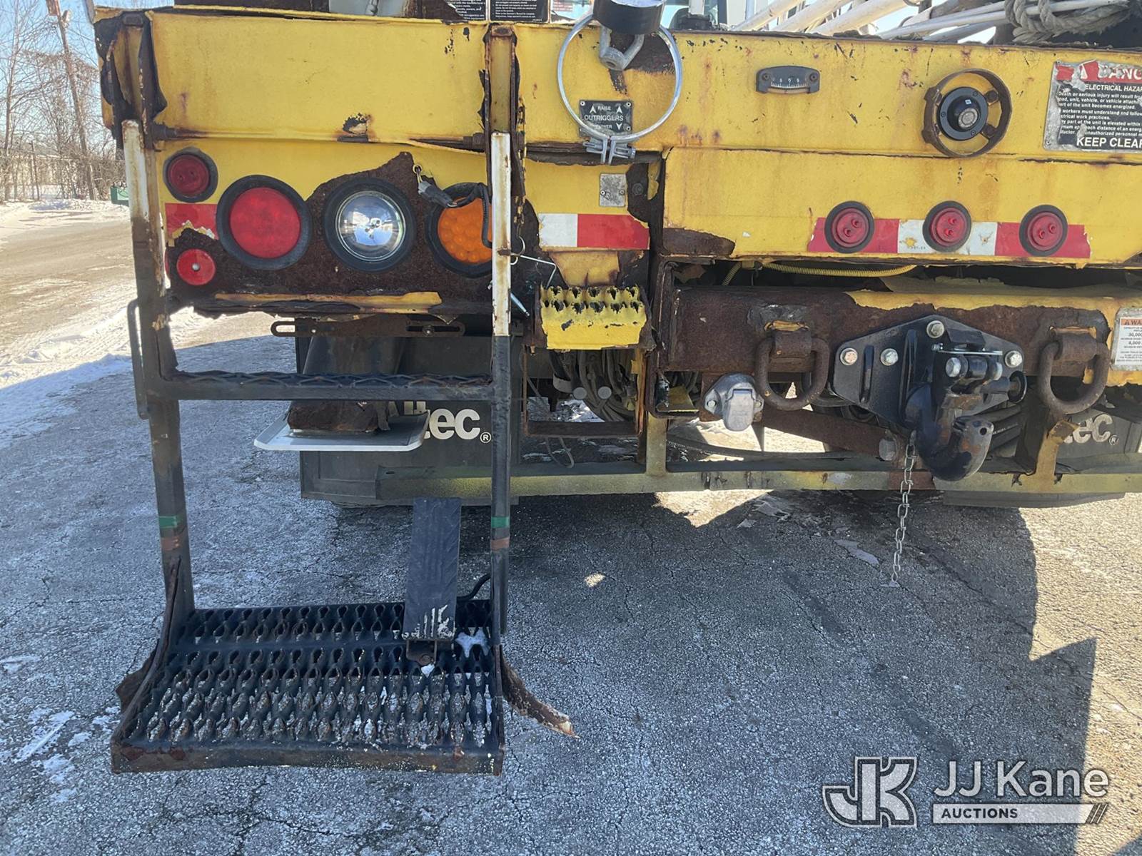 Altec DL42-BC, 21,120 Lb Digger Derrick s/n 0811DU1003, with 42ft. sheave height, 2-spd digger, heel winch, wireless remote & stand-up controls, corner mounted on 2012 International 4300 Flatbed/Utility Truck, 7.6L L6 DIESEL 4X2, DIESEL, Auto, A/C, (90,882 miles) (**Dealer Only**Runs & Moves)(Rust Damage) (Seller States: Unable To Operate Upper-Condition Unknown; Extensive Rust Damage to Frame Rail (rusted through on rear) – Requires ANSI Inspection for complete repair/replacement requirements)) (Reads 9,470 hours) (Bidding Restricted to Licensed Vehicle Dealers Only), This is a Titled Item NOTE: This unit is being sold AS IS/WHERE IS via Timed Auction and is located in South Beloit, IL. Inspection & preview days for this unit are the 2 business days prior to the first day of items closing for this auction, item is located at 14354 Dearborn Ave South Beloit, IL and hours of operations are 8a-4p. For pre-sale questions, please contact Derek Eklund at (608) 904-0618 or (derek.eklund@jjkane.com). (Manuals provided in cab) (Buyer is responsible for removal. Assistance by consignor or JJ Kane Auctions is not assured.)